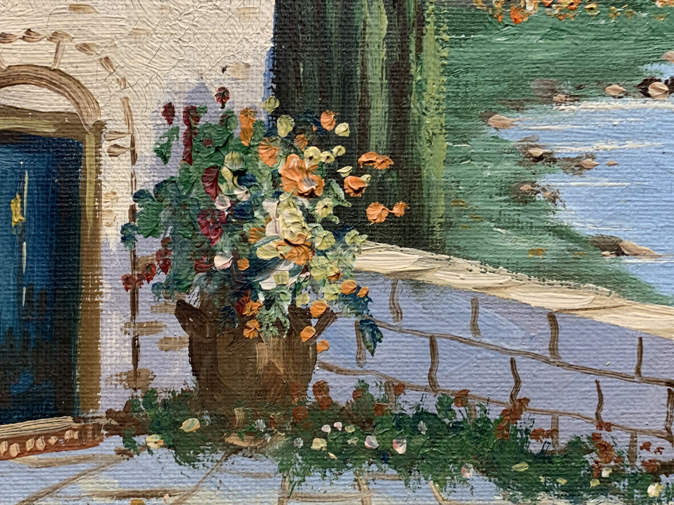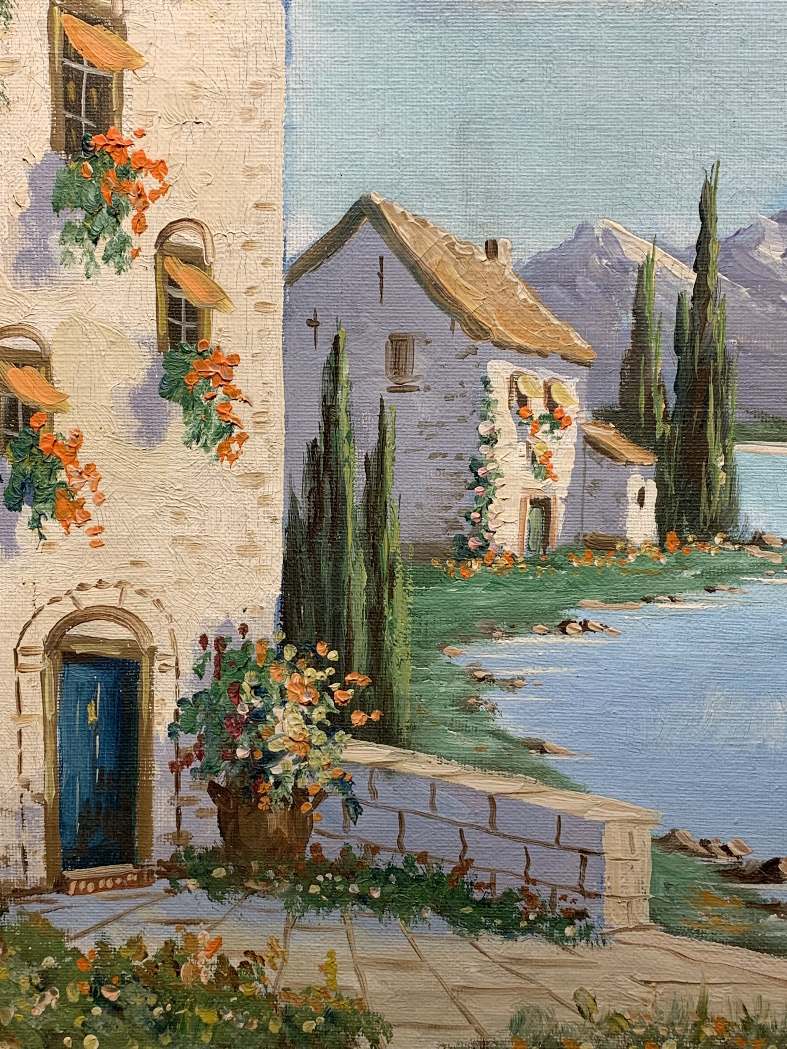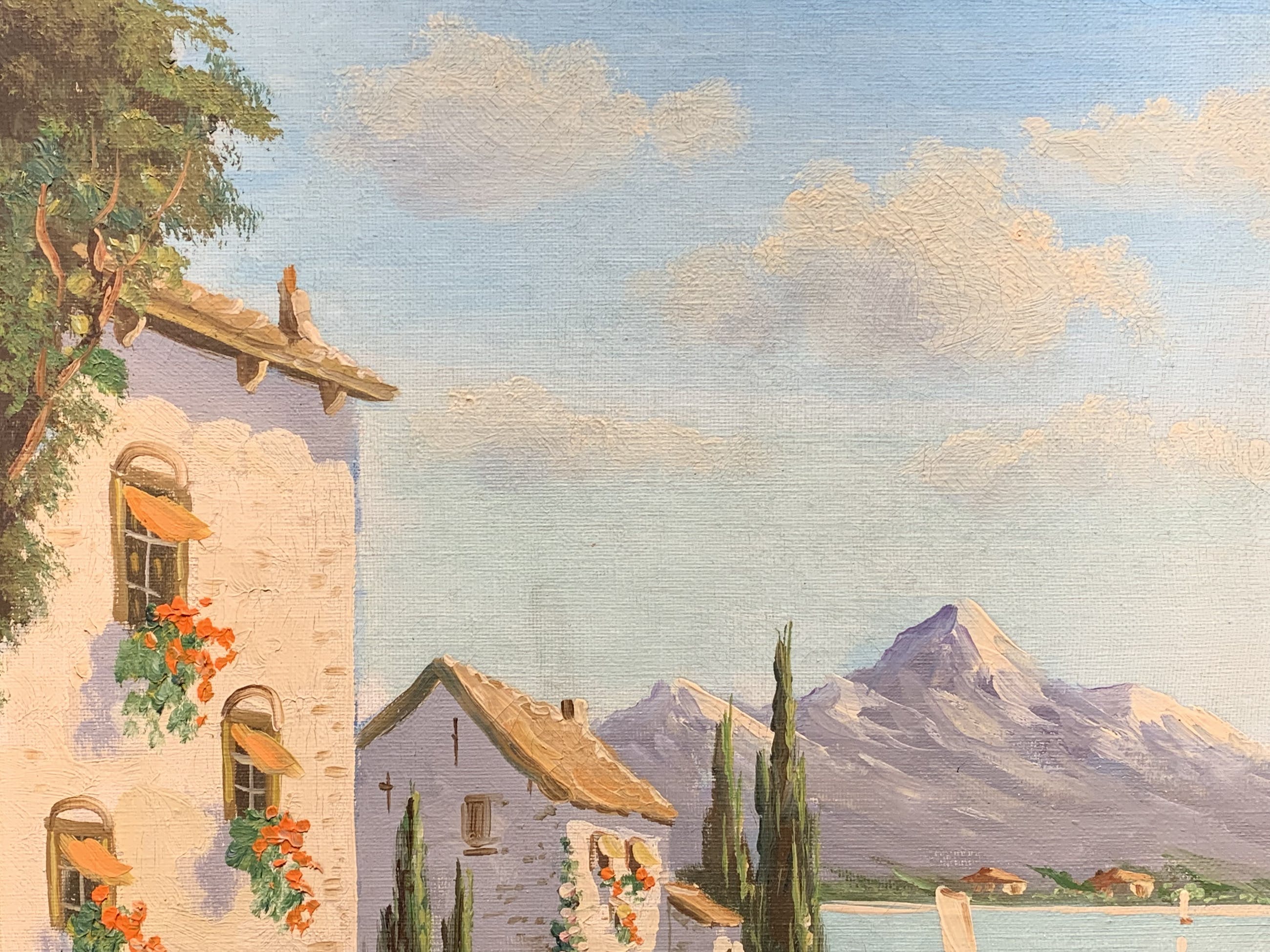 Een werkelijk prachtige blik van Albert Torringa op een mooi zonnig erf in een zuid Europese sfeer ,met zicht op bergen en meer.