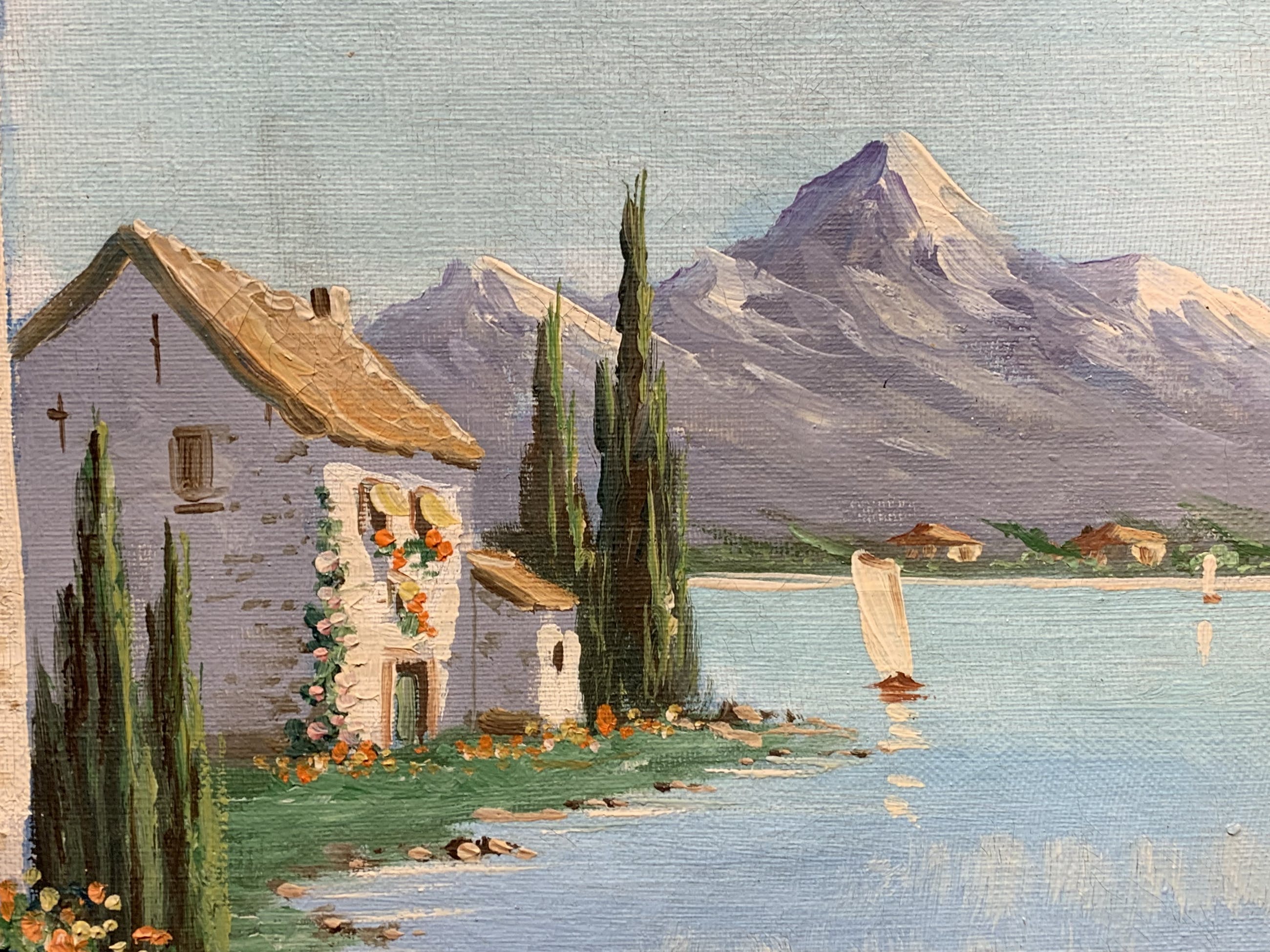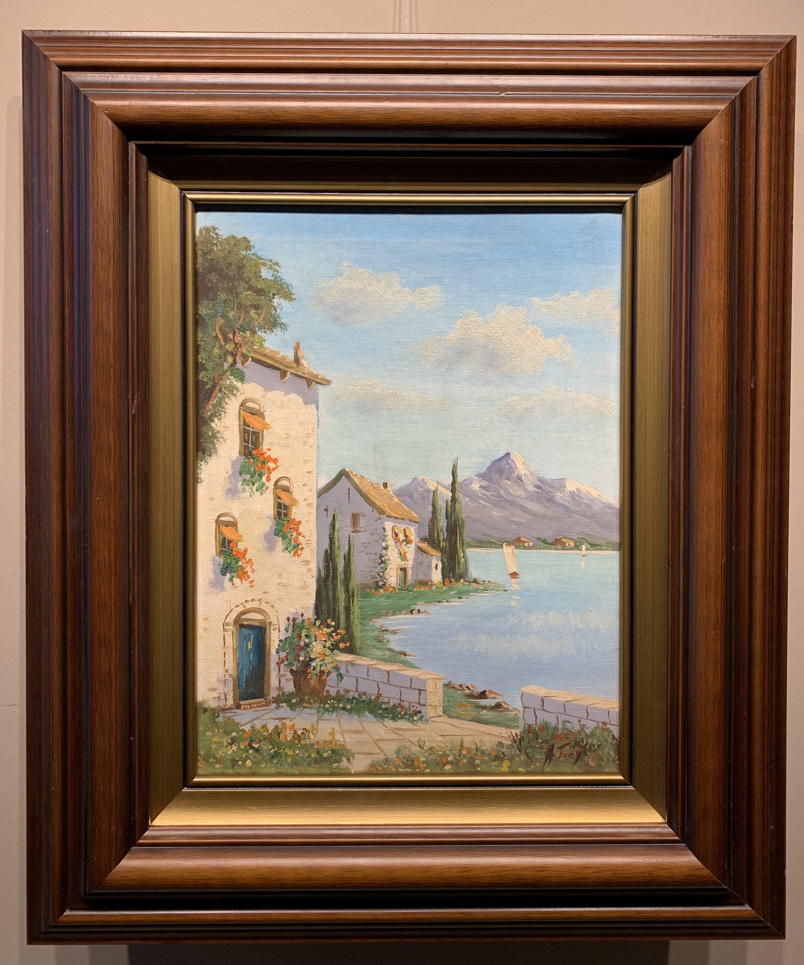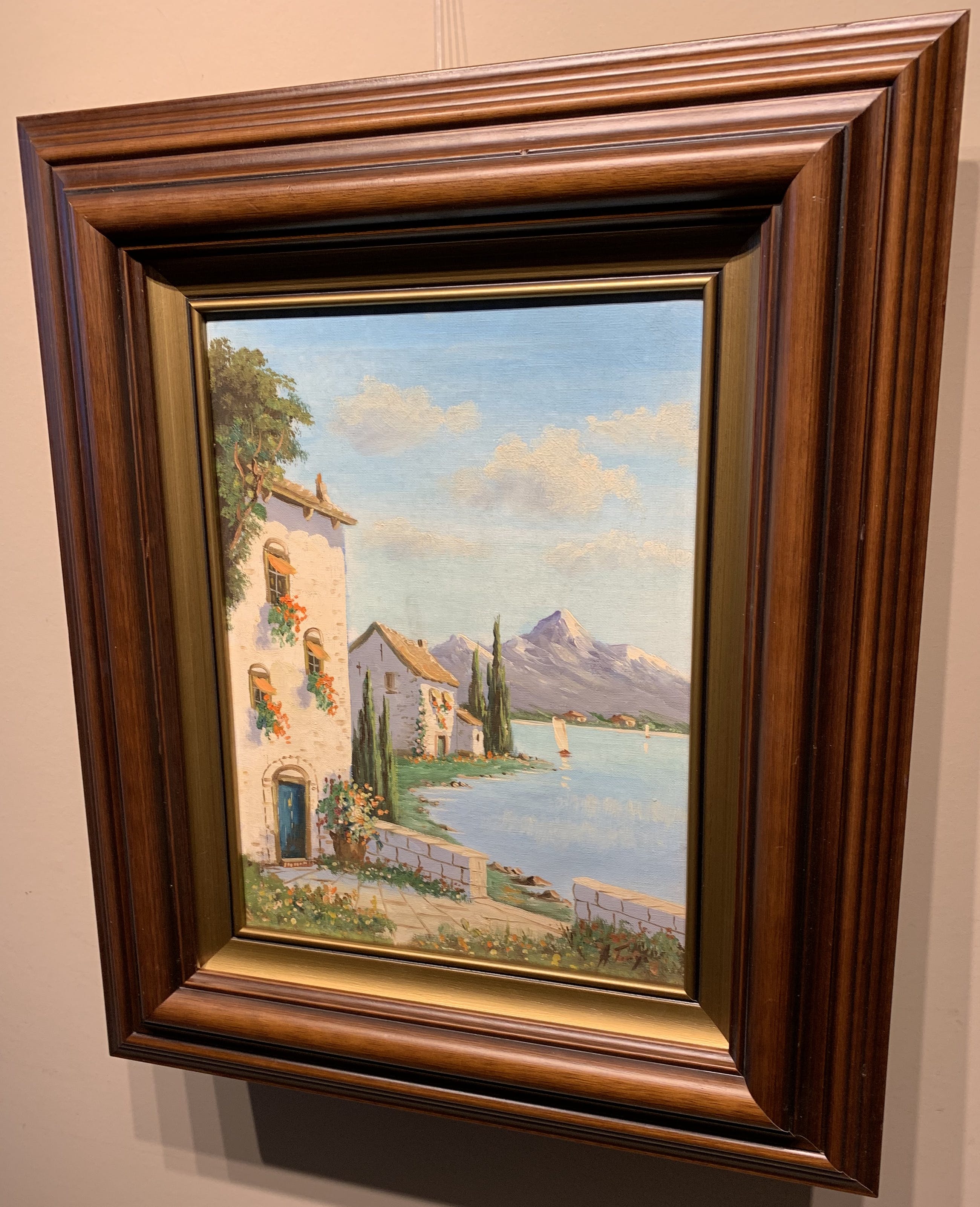 Een werkelijk prachtige blik van Albert Torringa op een mooi zonnig erf in een zuid Europese sfeer ,met zicht op bergen en meer.