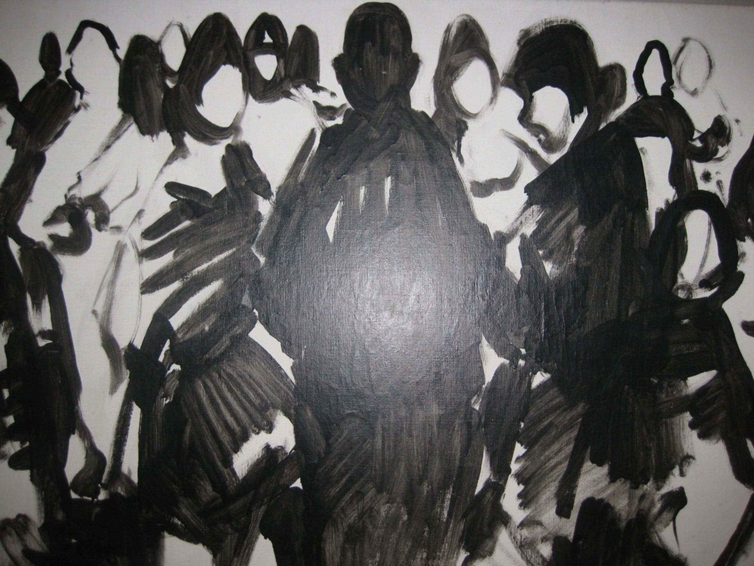 Het werk is in redelijke staat, op twee plekken heeft het een kras op het doek (waar het wit is), ook zitten er 2 kleine gaatjes van 1 cm in het doek, eveneens in de witte stukken.