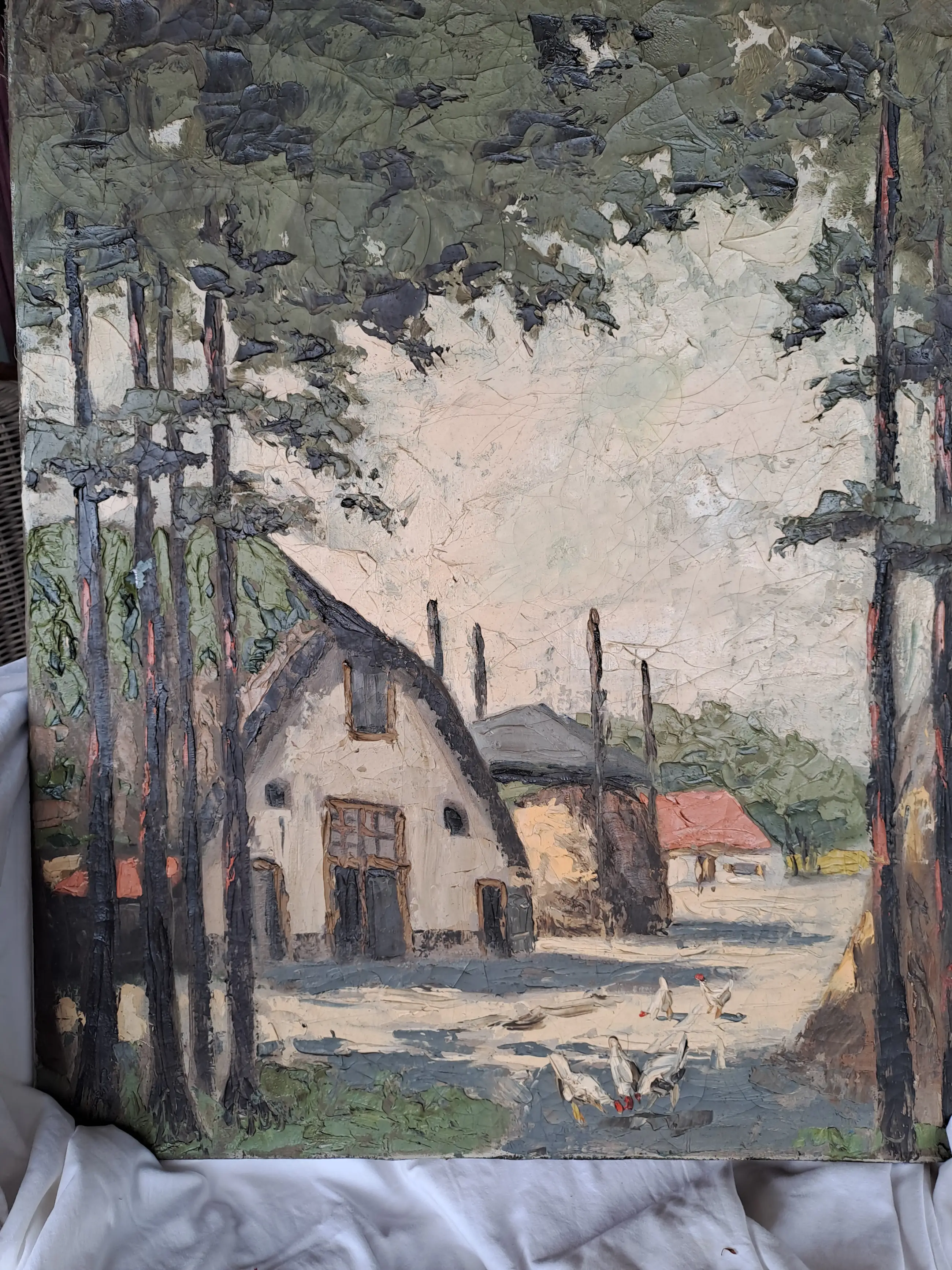 Dit werk behelst een fraai gezicht op een boerderij. Geschilderd (Olieverf op linnen) met een ' stevige' toets. Het kwam vlak na de oorlog in familiebezit.