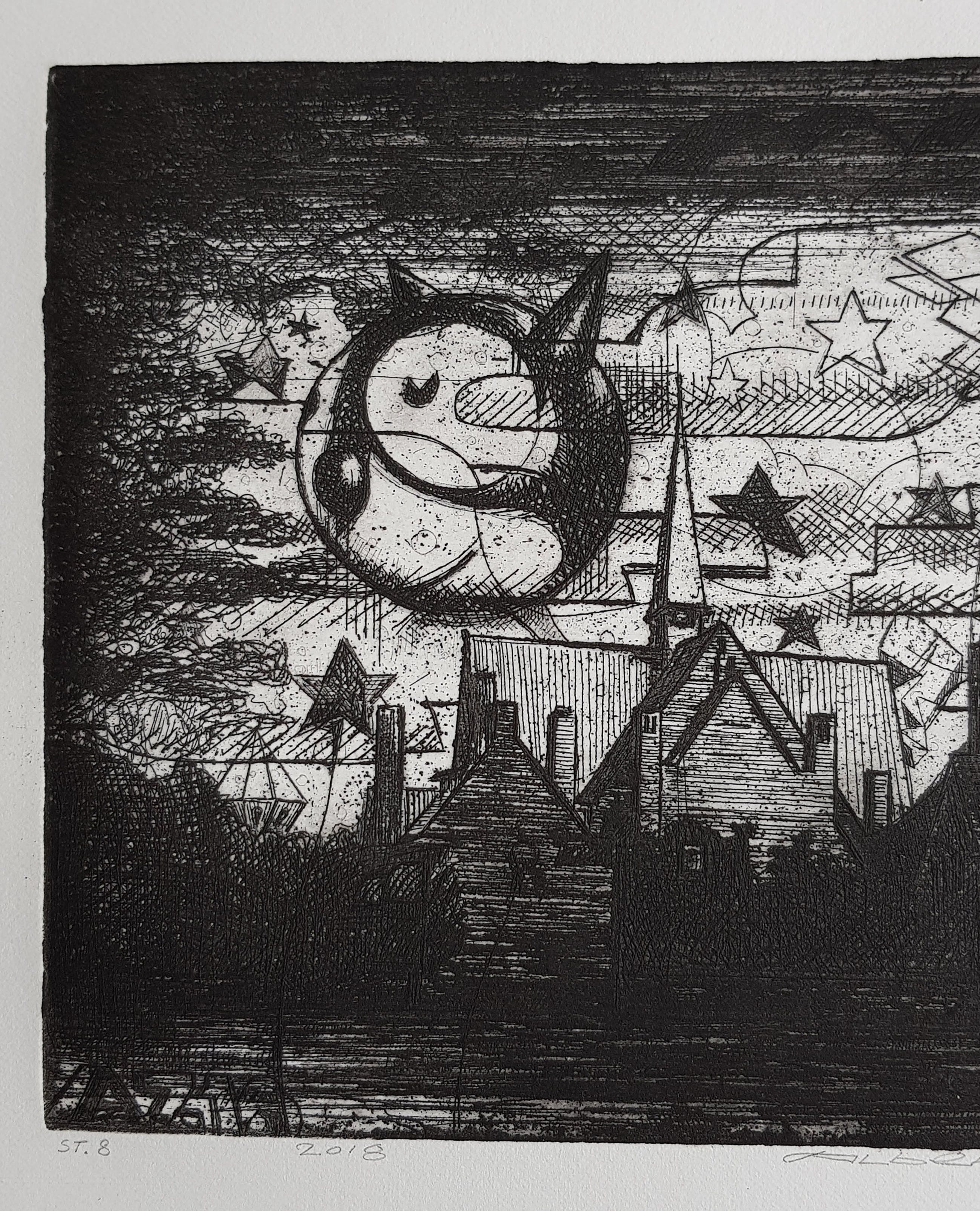 Fraaie, surrealistische ets van de Nederlandse schilder, tekenaar en etser, Albert Zwaan. Volle gitzwarte druk met ruime marges. Zwaan won in 2003 zowel de Schefferprijs alsmede de Rabobank Picturaprijs. In 2004 werd hij genomineerd voor de, Koninklijke Prijs voor Vrije Schilderkunst in Amsterdam. Albert Zwaan is nog steeds actief als hedendaagse kunstenaar en staat geregistreerd bij het Rkd.