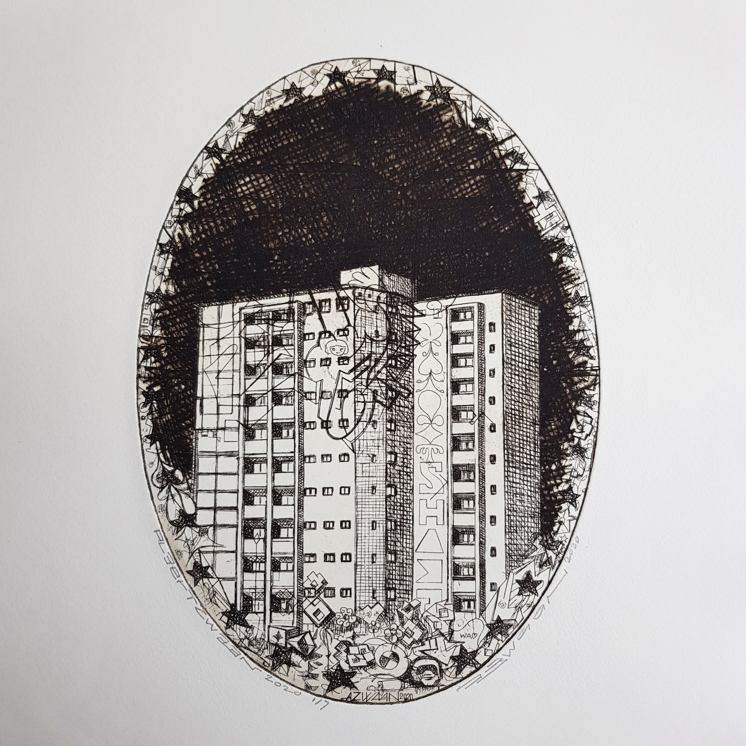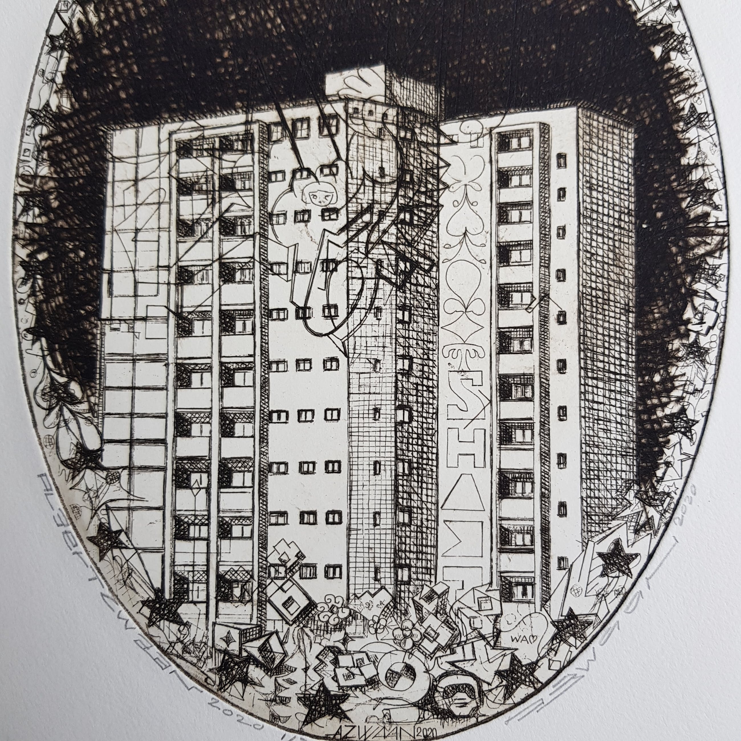 Ets uit 2020 van Albert Zwaan, een Dordtse schilder en etser Academie St Joost 1999 o.a. winnaar van de, Arie Schefferprijs, 2005 Nominatie Koninklijke prijs voor Vrije Schilderkunst, 2004 www.albertzwaan.com
