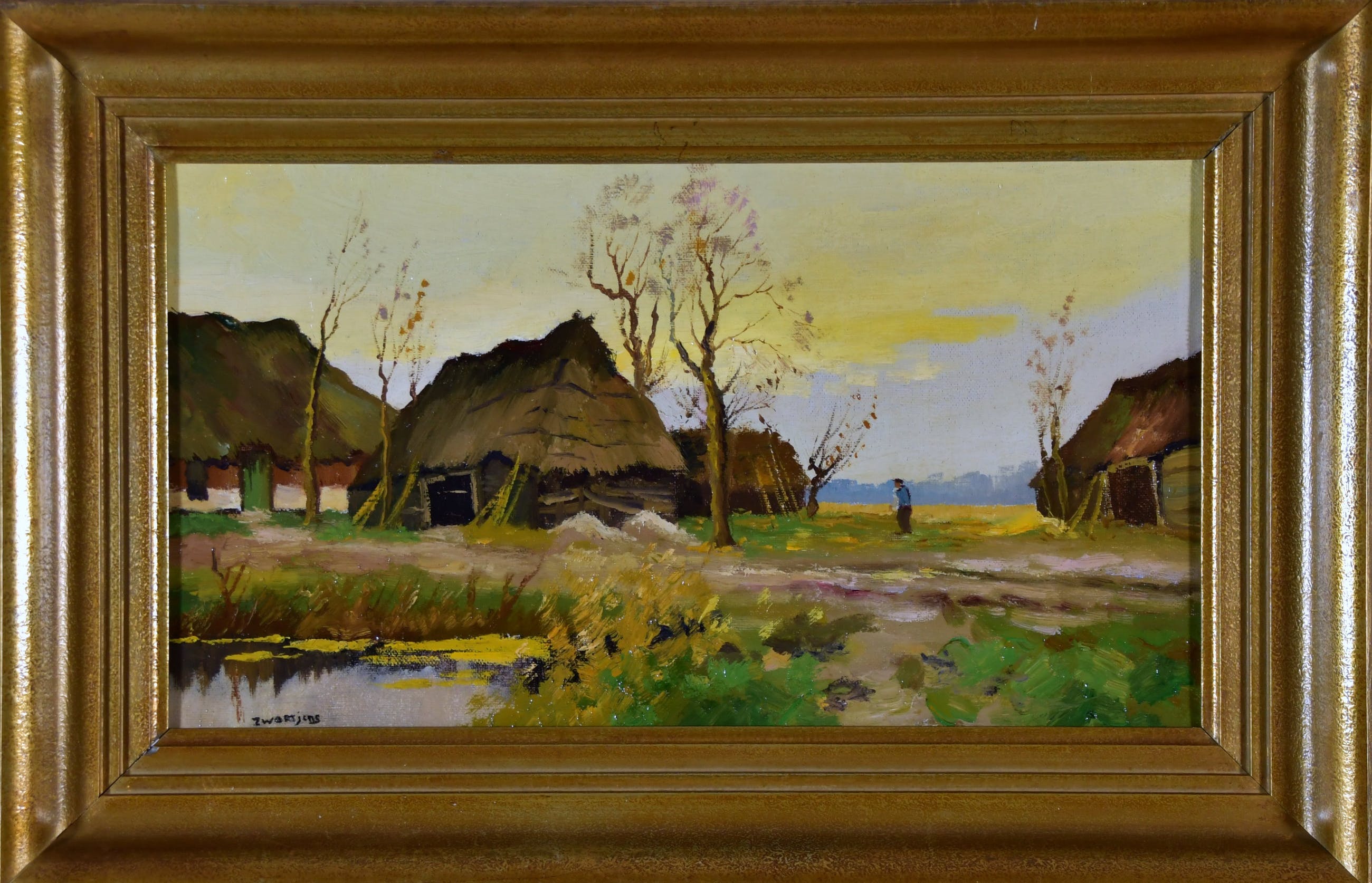 Fraai geschilderde sfeerimpressie van boerenerf met woonhuis en schuren met riet gedekt, bomen, vennetje en boer op z'n erf.Typisch boerenerf, mooie weergave, fraaie kleuren, geschilderd in olieverf op doek van schilder Zwartjens.