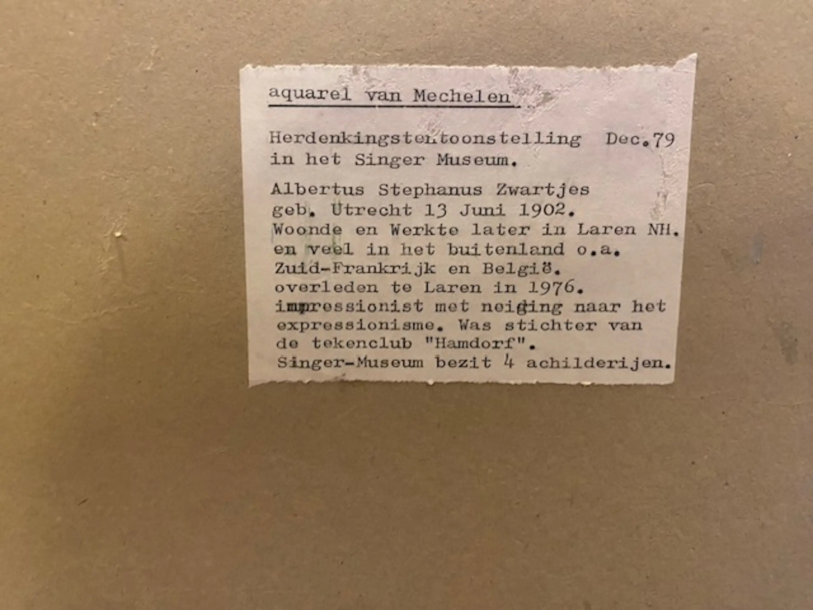 Herkomst Kunstzaal van Lier te Blaricum Het werk is ten tentoon gesteld op de herdenkingstentoonstelling Dec 79 in het Singer Muzeum