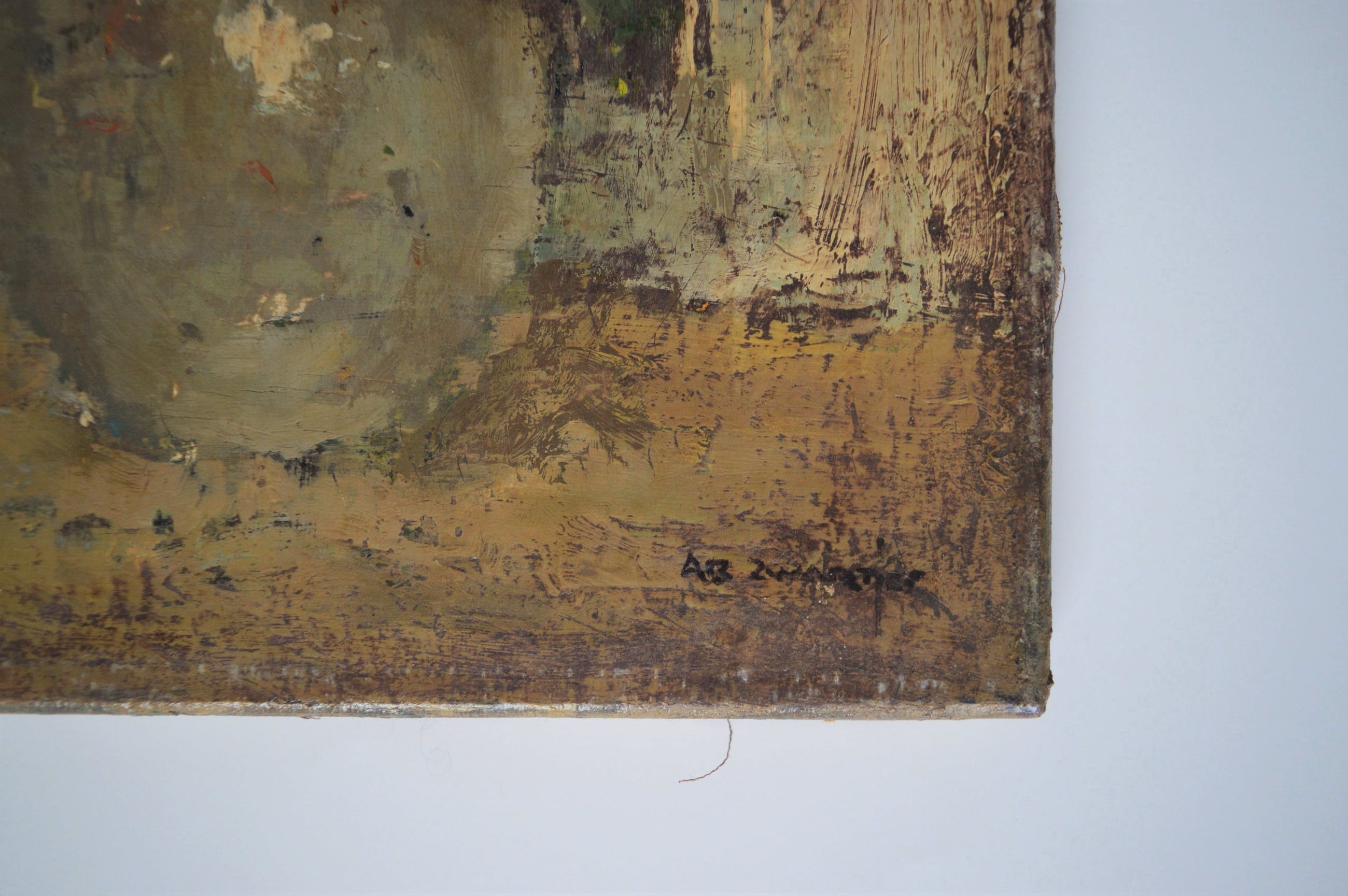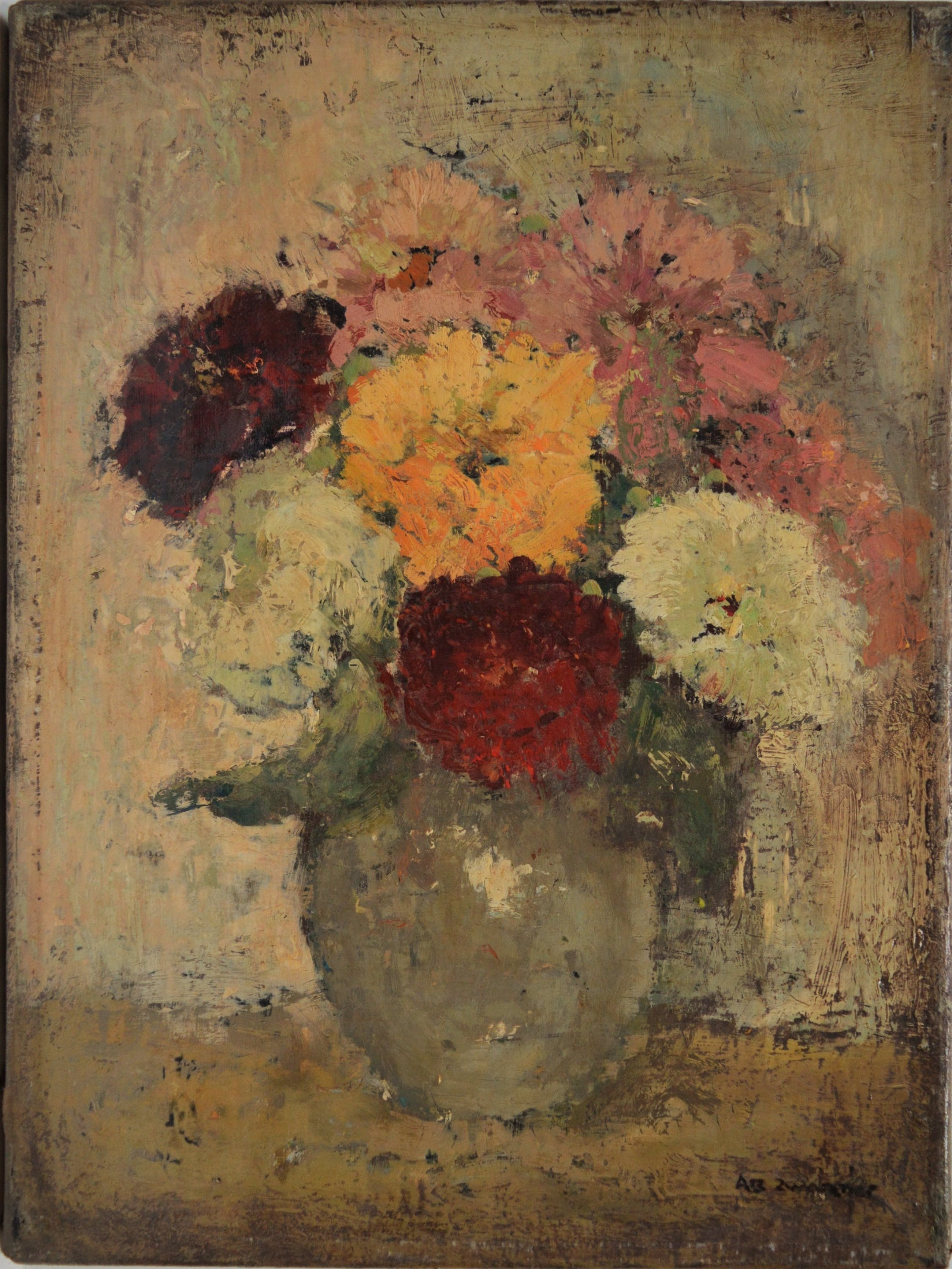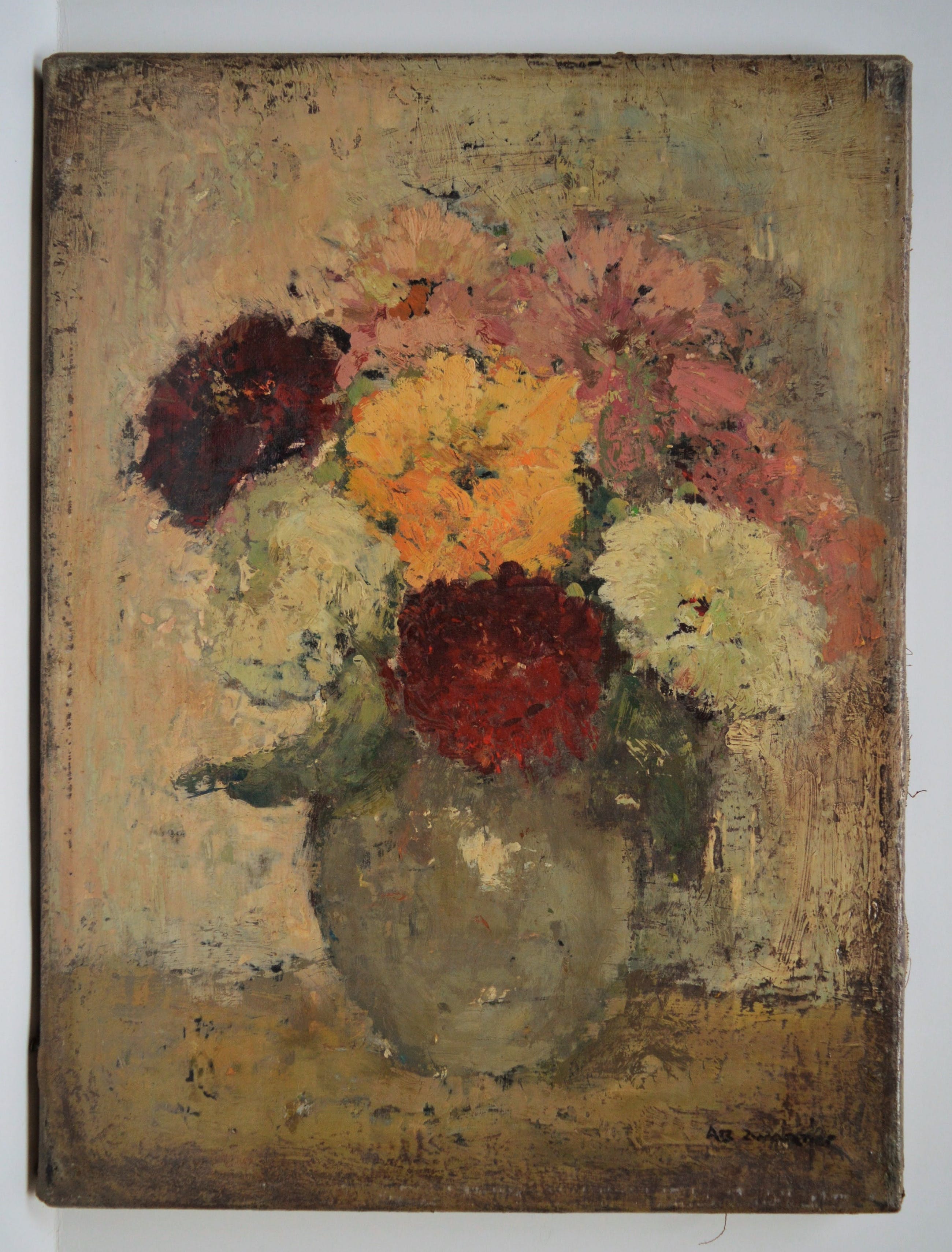Het schilderij is heel kloek geschilderd met mooie verftoetsen in de bloemen en verder vaak gebruik makend van het paletmes. Albert Zwartjes heeft vroeger ook les gegeven op de Gooise academie, toen nog gevestigd op de zolder van het inmiddels afgebroken Hamdorff hotel in Laren.