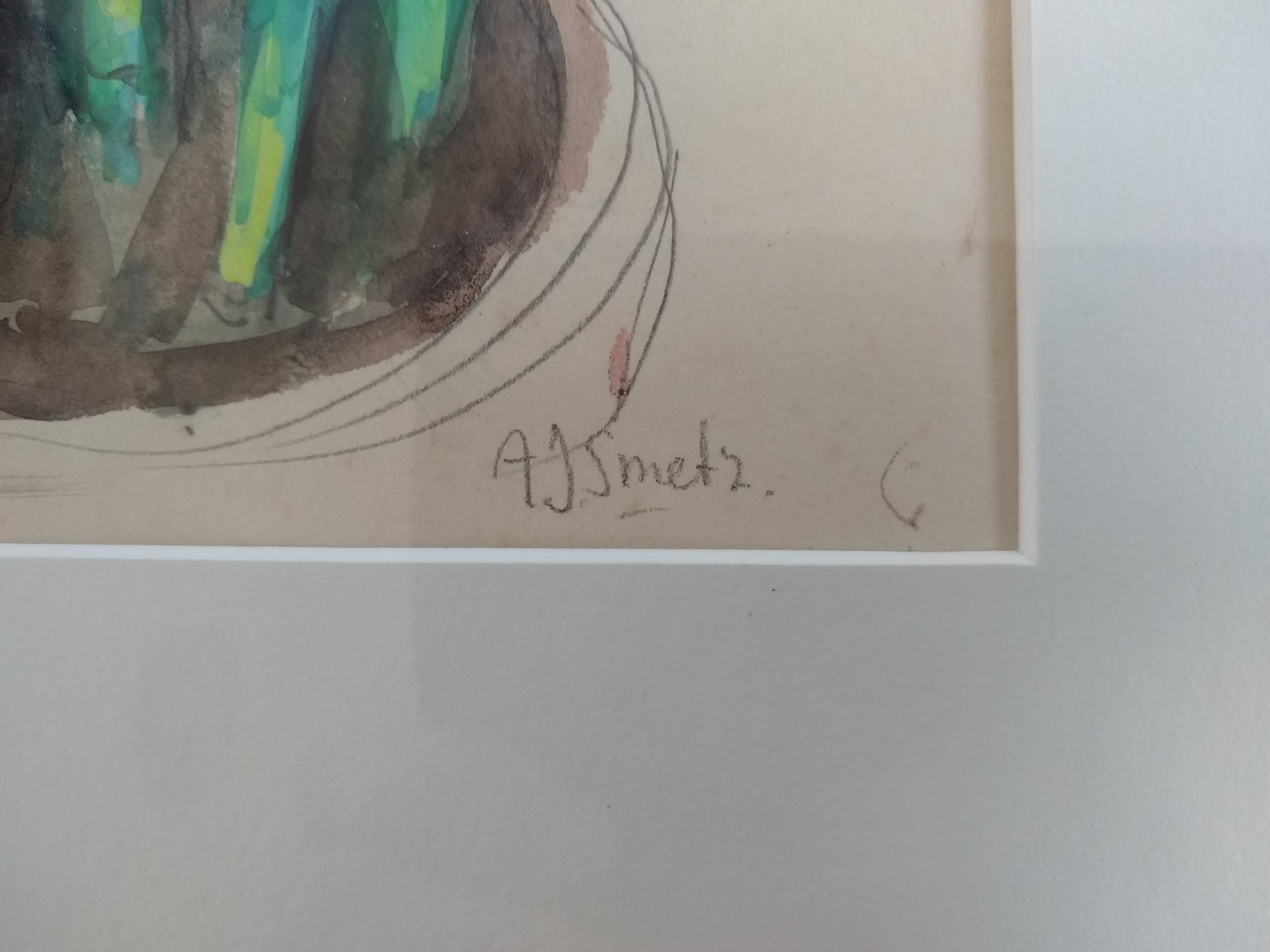 Sprekende aquarel, keurig ingelijst met passe-partout en wortelnoten lijst.