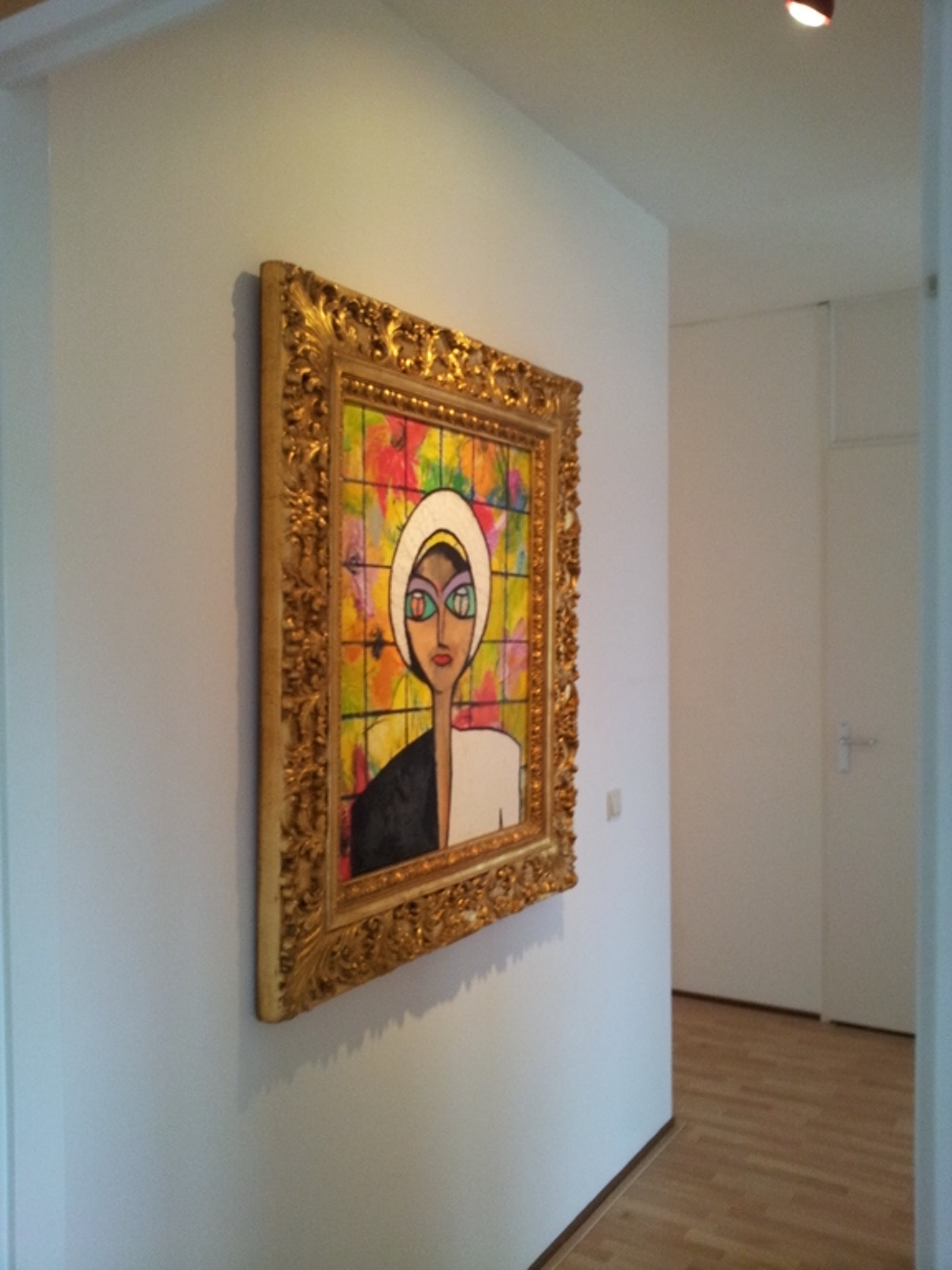 Schilderij, olieverf op doek, in prachtige gouden lijst, afm 100 x 120 cm. titel: "black & white in church"