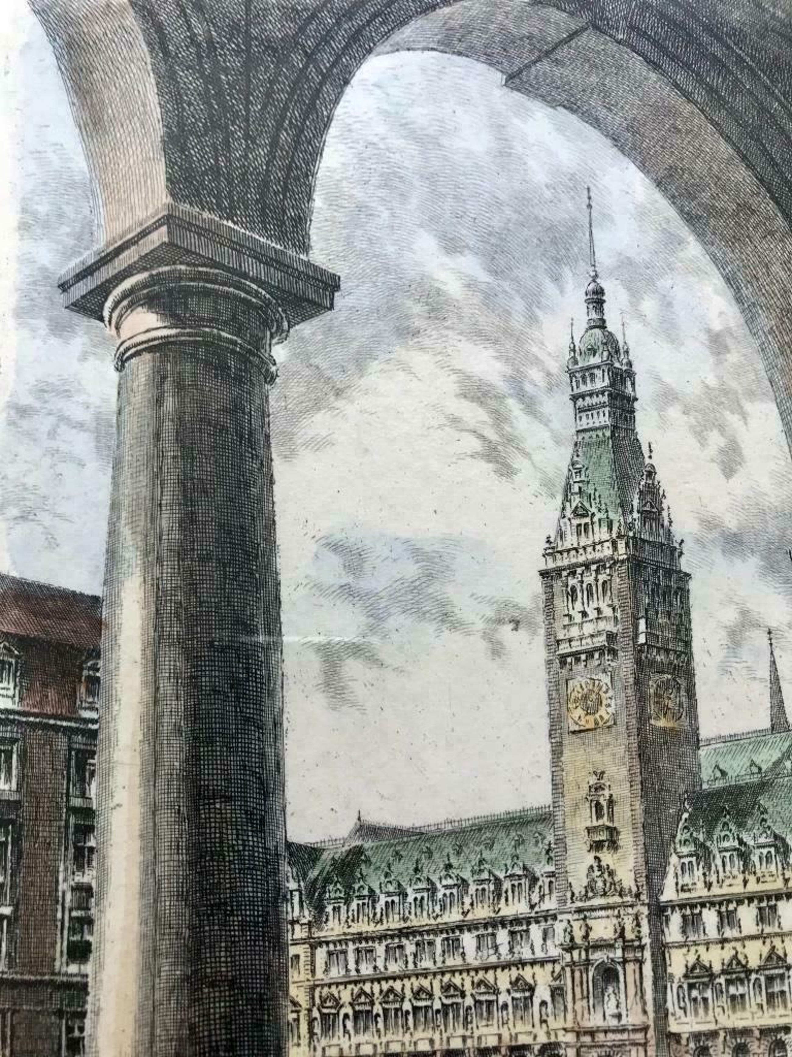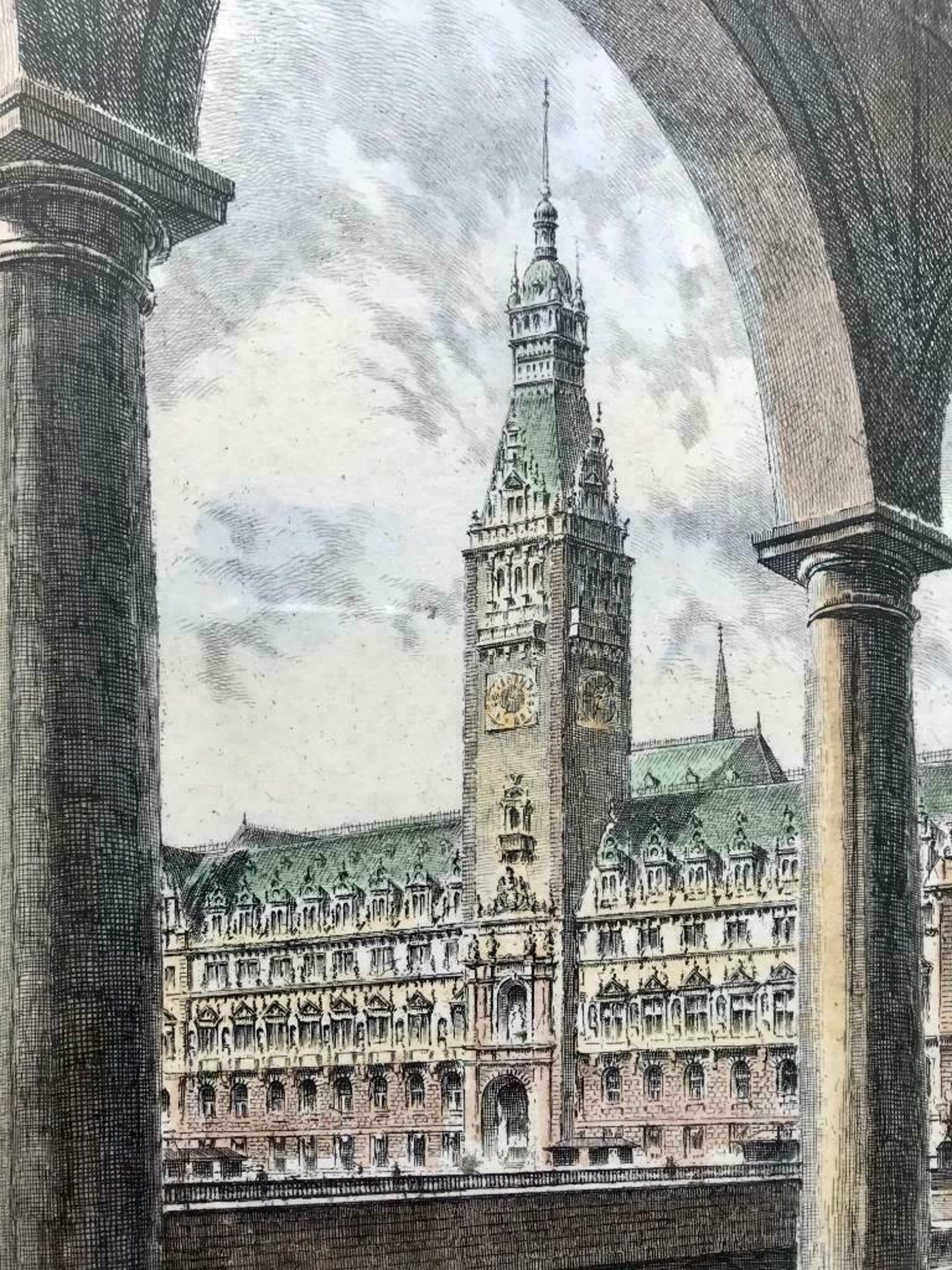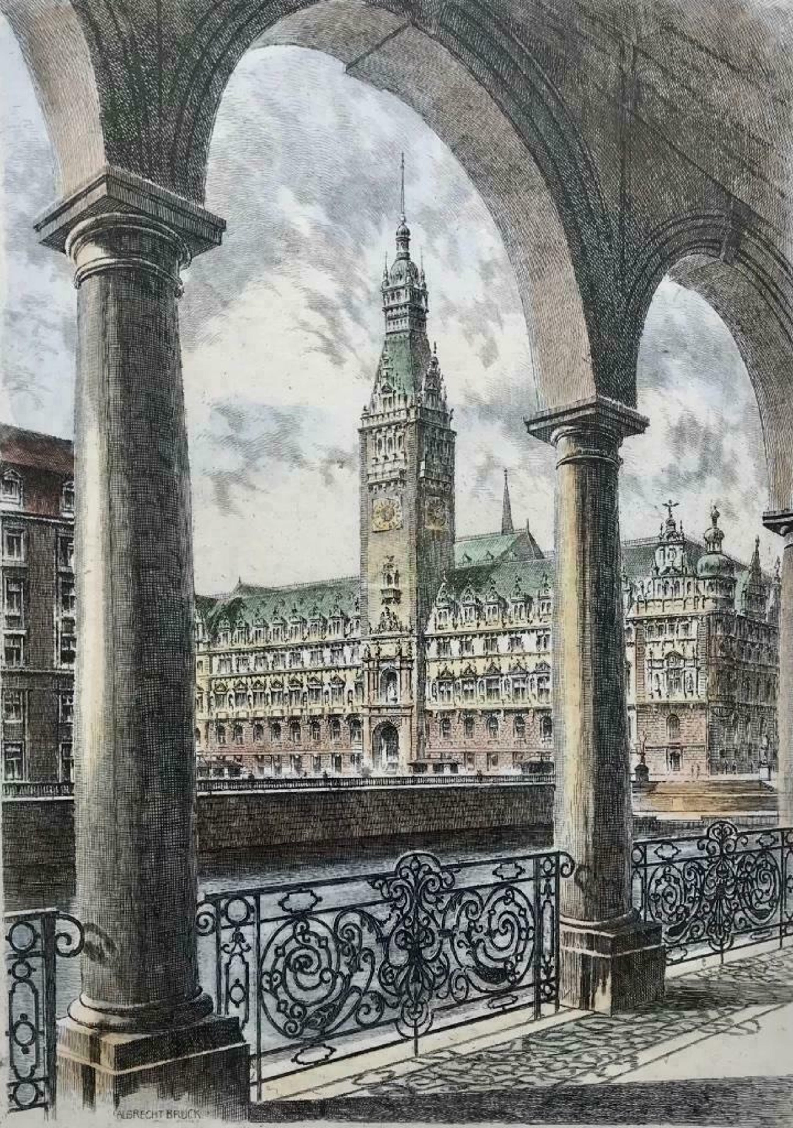 In lijst: een handgesigneerde kleurenets van het oude stadshuis te Hamburg, Duitsland, bezien vanaf een balkon. Door Albrecht Bruck (1874 -1964) Bruck staat/stond bekend als een gerenommeerde etser, graveur en schilder. (Hieronder meer info.) Professioneel ingelijst. De ets is zowel hand- en in de druk gesigneerd. Helaas zijn er geen gegevens van Brucks artistieke activiteit tijdens het DDR-tijdperk. Volgens Wikipedia is deze ets gemaakt tussen 1900 en 1940.