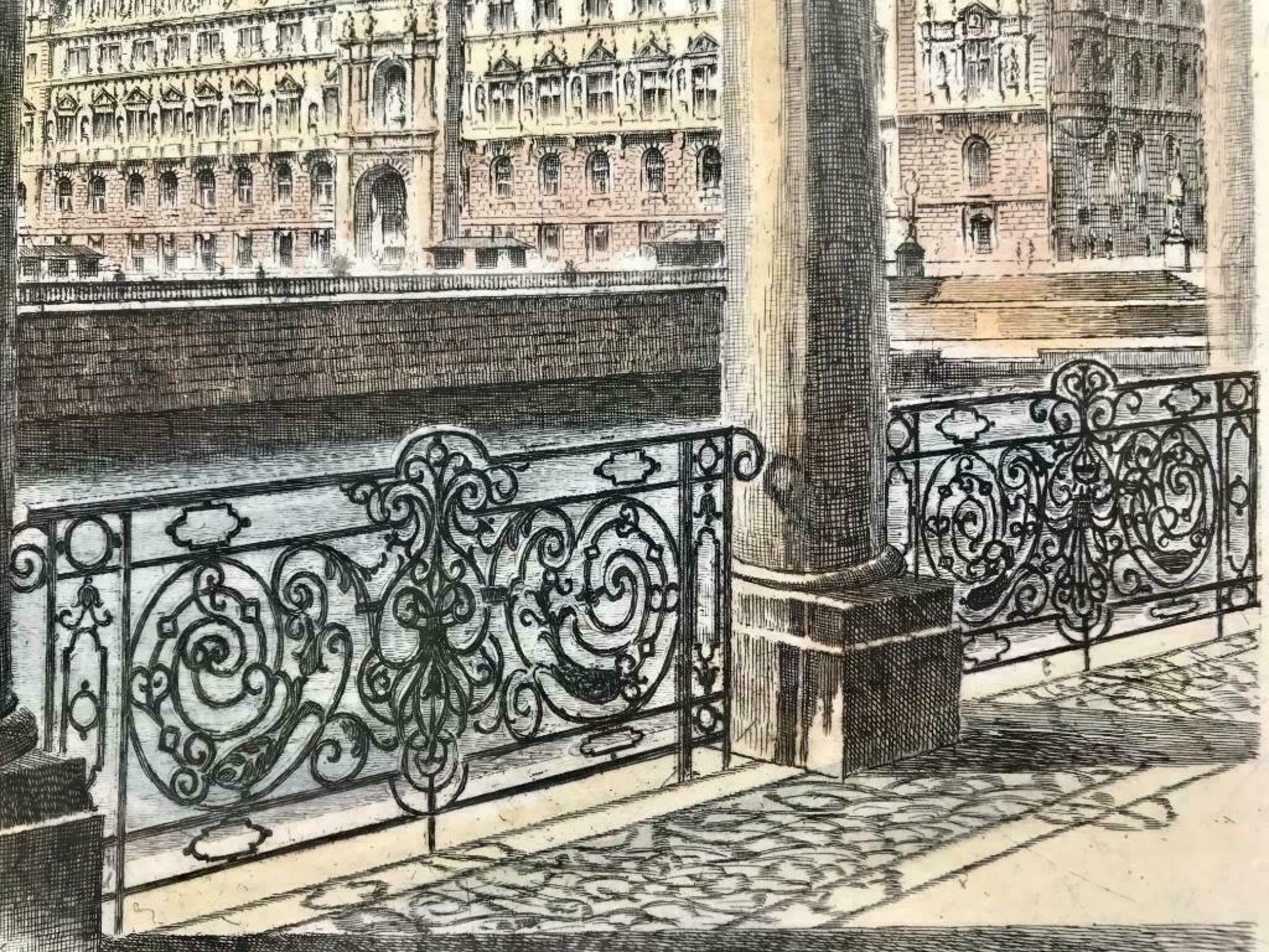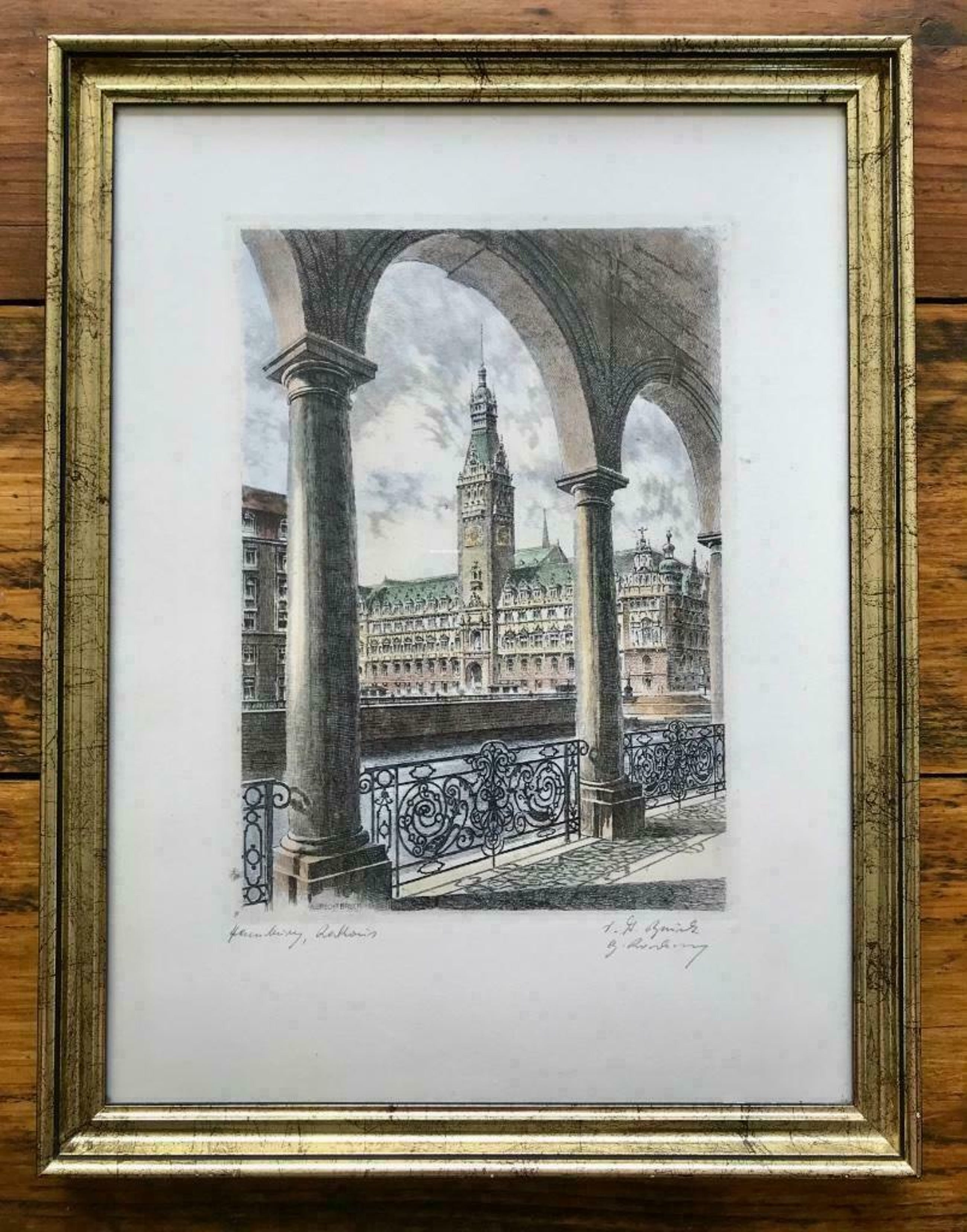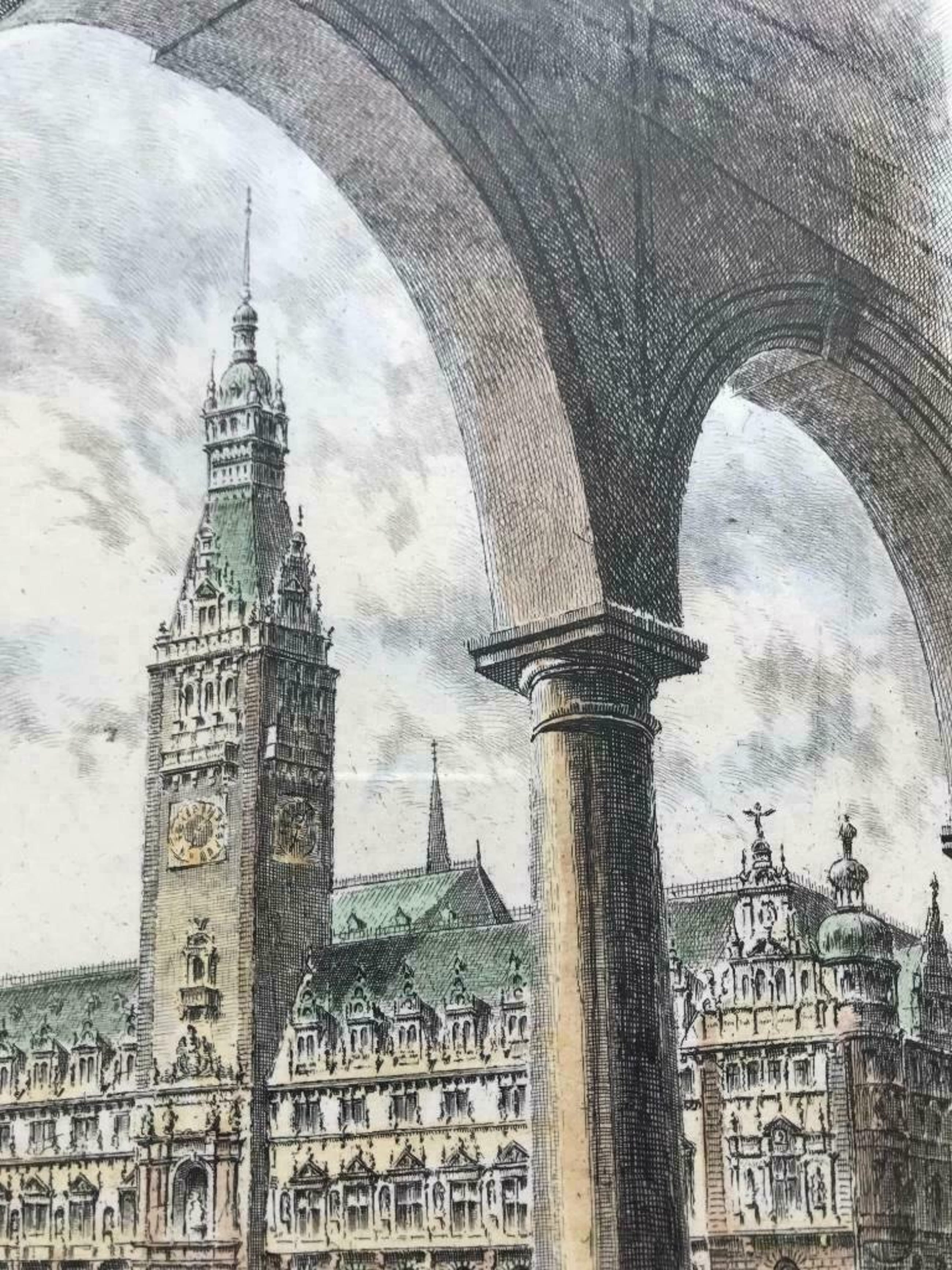 In lijst: een handgesigneerde kleurenets van het oude stadshuis te Hamburg, Duitsland, bezien vanaf een balkon. Door Albrecht Bruck (1874 -1964) Bruck staat/stond bekend als een gerenommeerde etser, graveur en schilder. (Hieronder meer info.) Professioneel ingelijst. De ets is zowel hand- en in de druk gesigneerd. Helaas zijn er geen gegevens van Brucks artistieke activiteit tijdens het DDR-tijdperk. Volgens Wikipedia is deze ets gemaakt tussen 1900 en 1940.