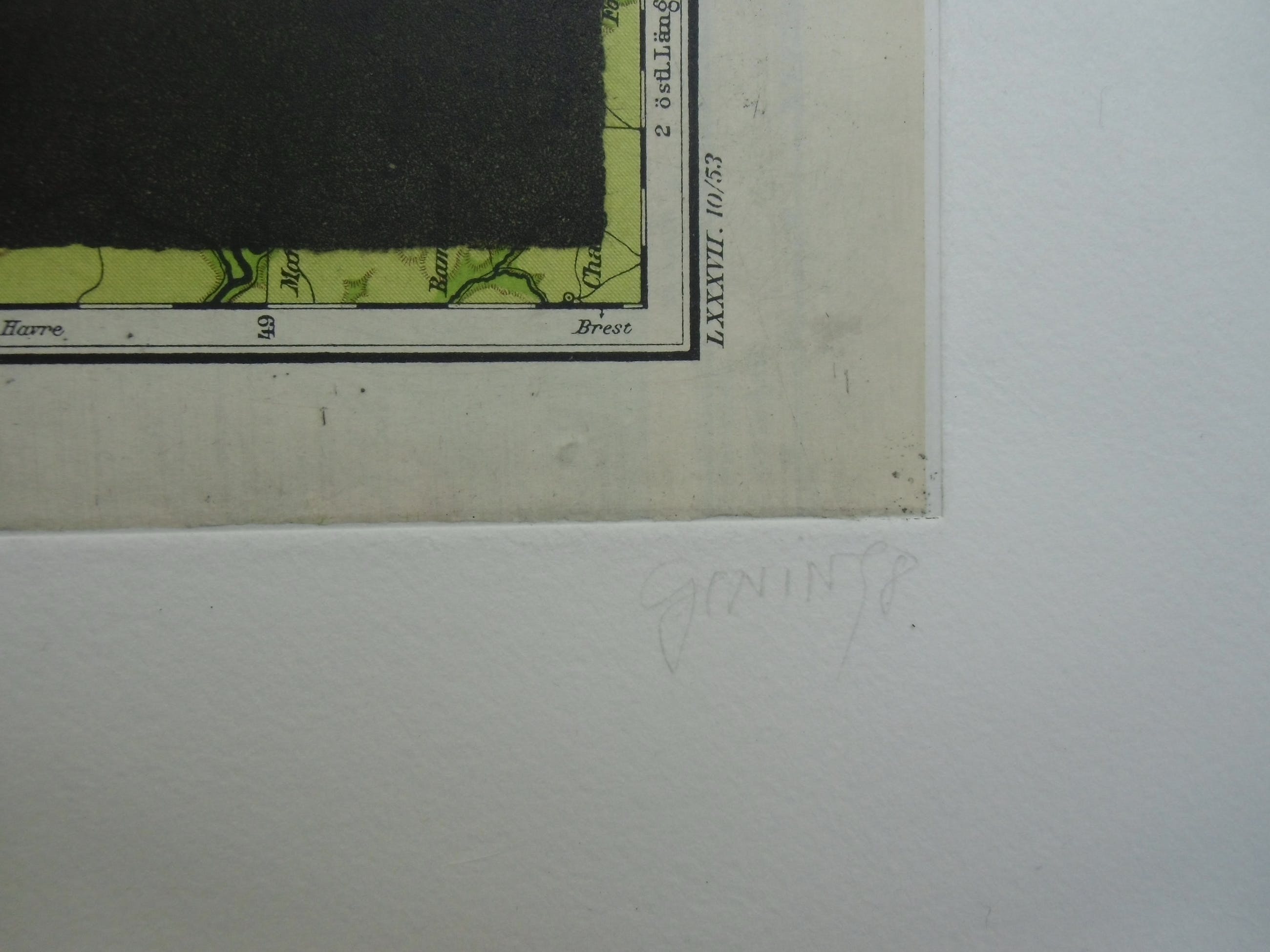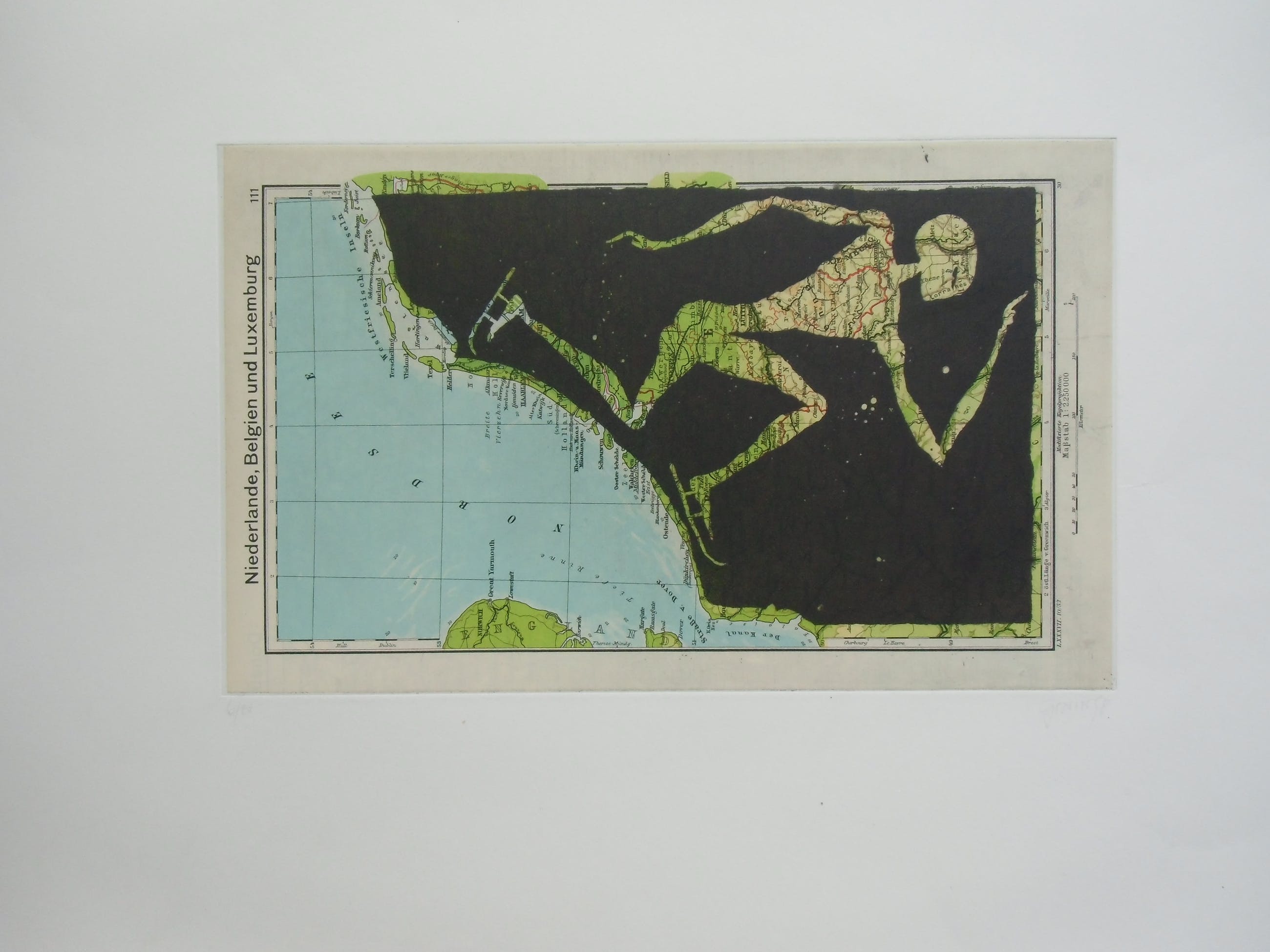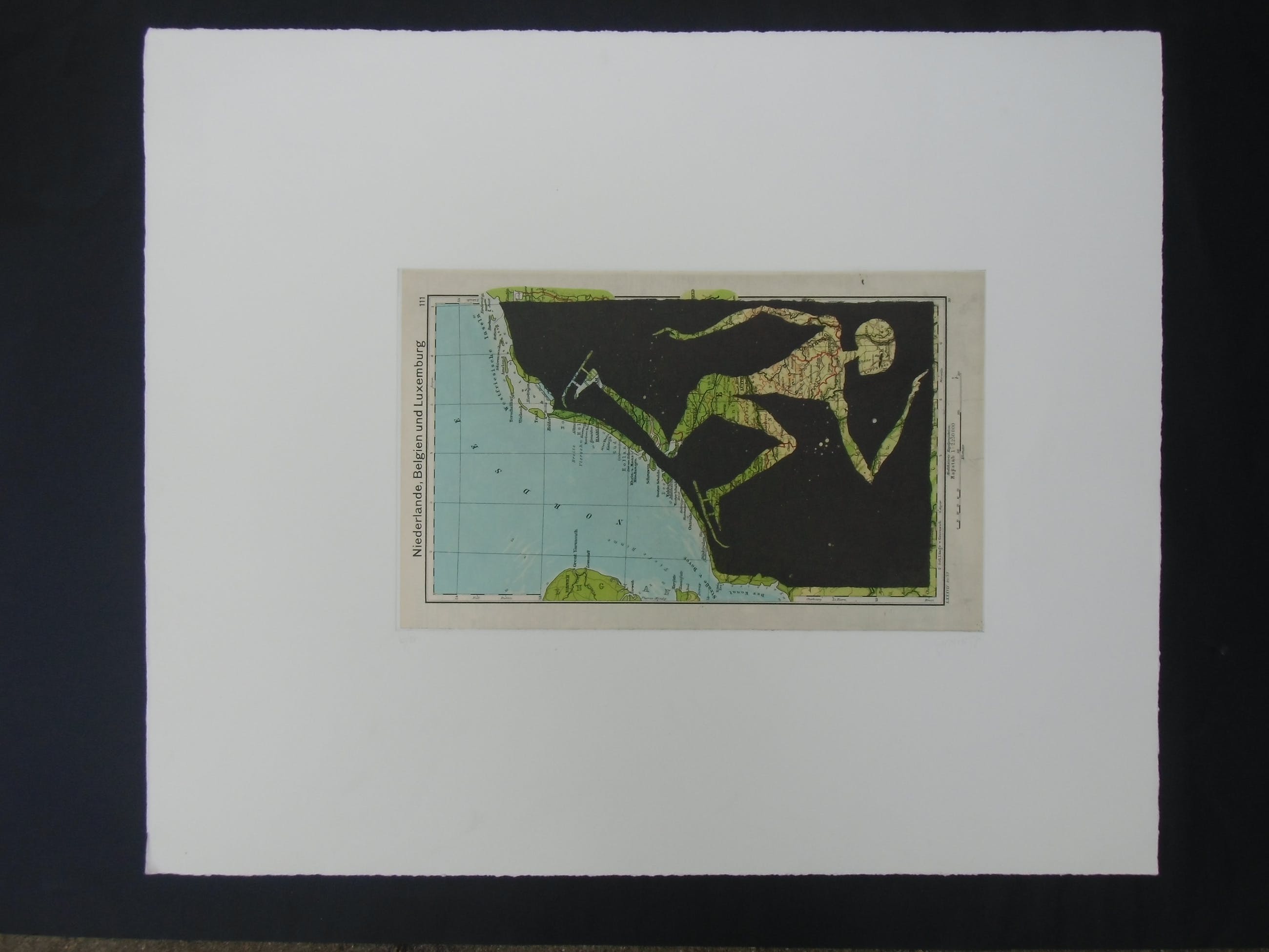 Grafiek van de Duitse kunstenaar Albrecht Genin (1945-2013) in een oplage van 6/20 , gedateerd 1998 en gesigneerd met potlood.Genin verwerkt zijn mens- en dierfiguren bij voorkeur op reeds bedrukte ondergronden als landkaarten en boekbladzijden. De grafiek is gemonteerd op wit geschept papier waarop signering, datering en oplage te vinden zijn. Het blad meet 50 x 60 cm. het eigenlijke werk 21 x 34.5 cm.