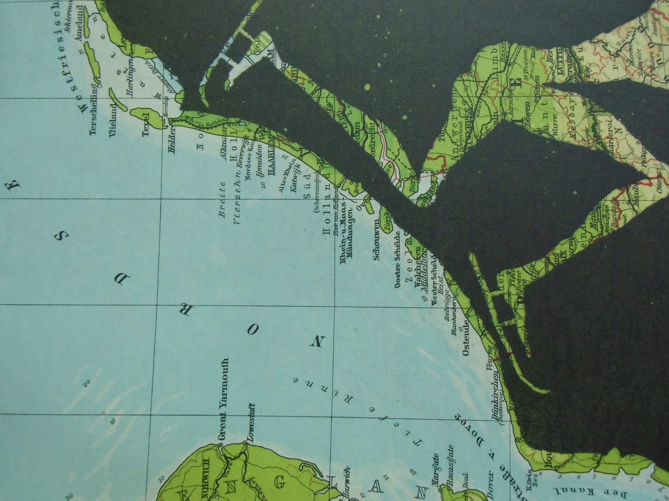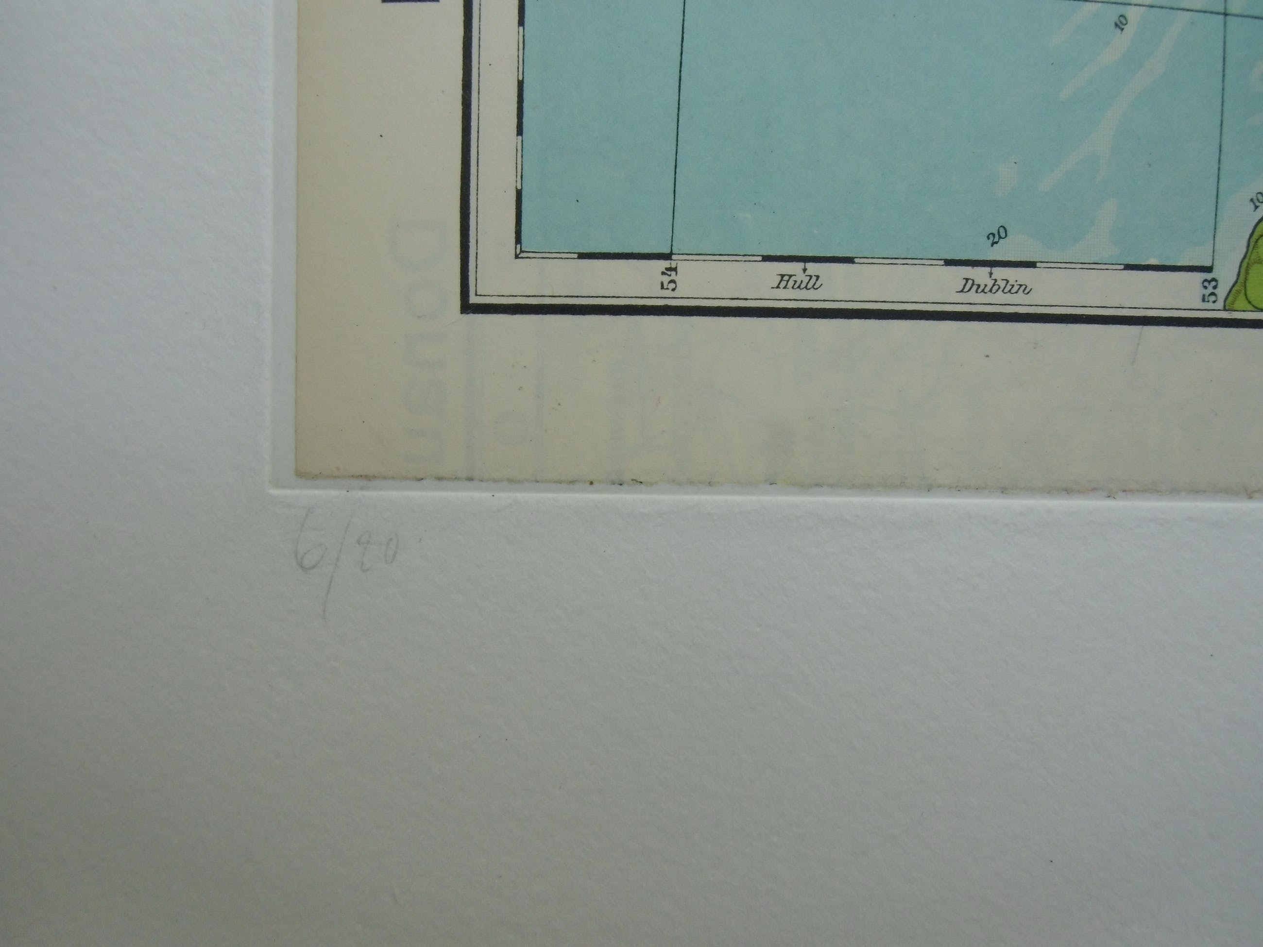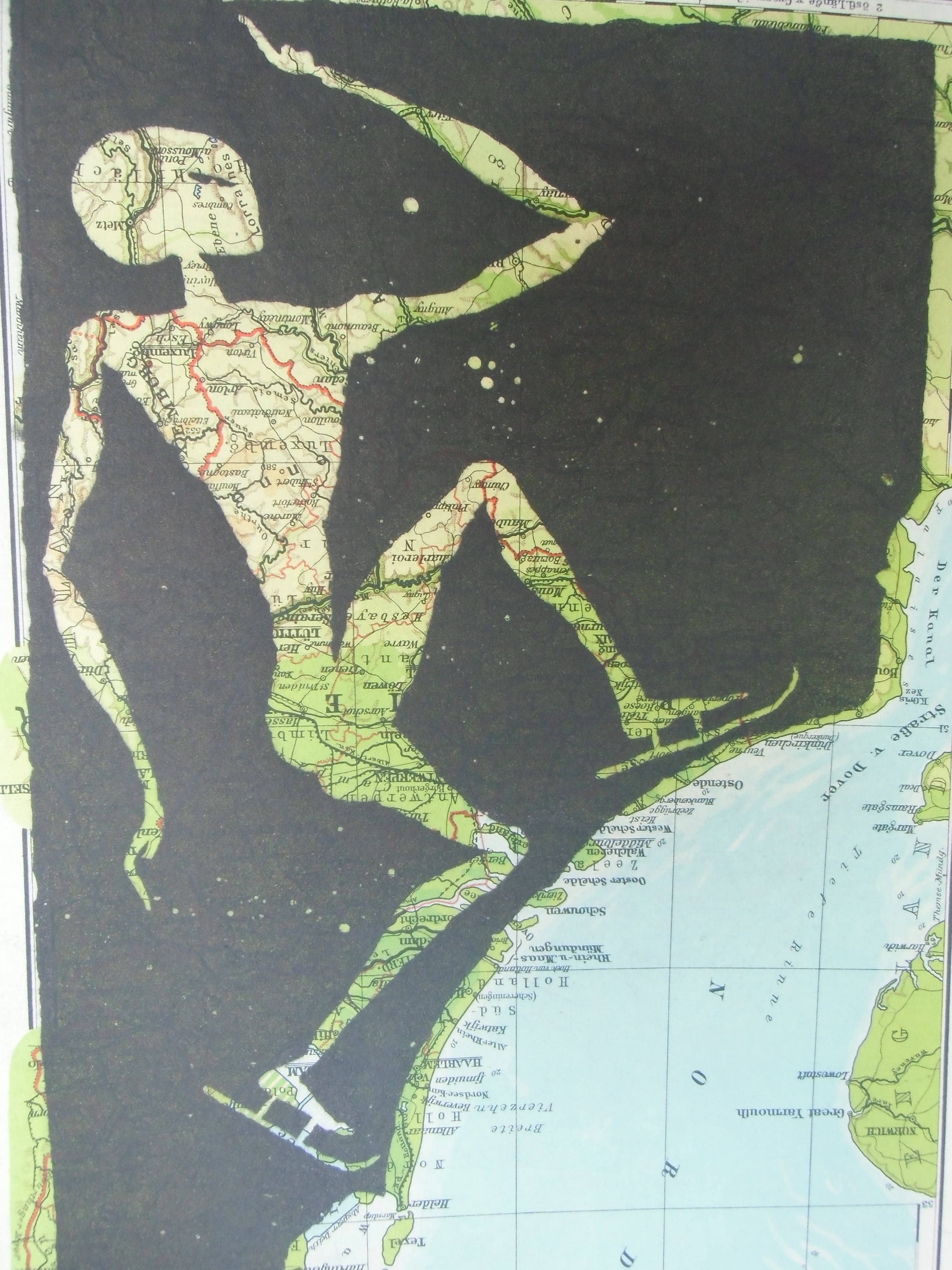 Grafiek van de Duitse kunstenaar Albrecht Genin (1945-2013) in een oplage van 6/20 , gedateerd 1998 en gesigneerd met potlood.Genin verwerkt zijn mens- en dierfiguren bij voorkeur op reeds bedrukte ondergronden als landkaarten en boekbladzijden. De grafiek is gemonteerd op wit geschept papier waarop signering, datering en oplage te vinden zijn. Het blad meet 50 x 60 cm. het eigenlijke werk 21 x 34.5 cm.
