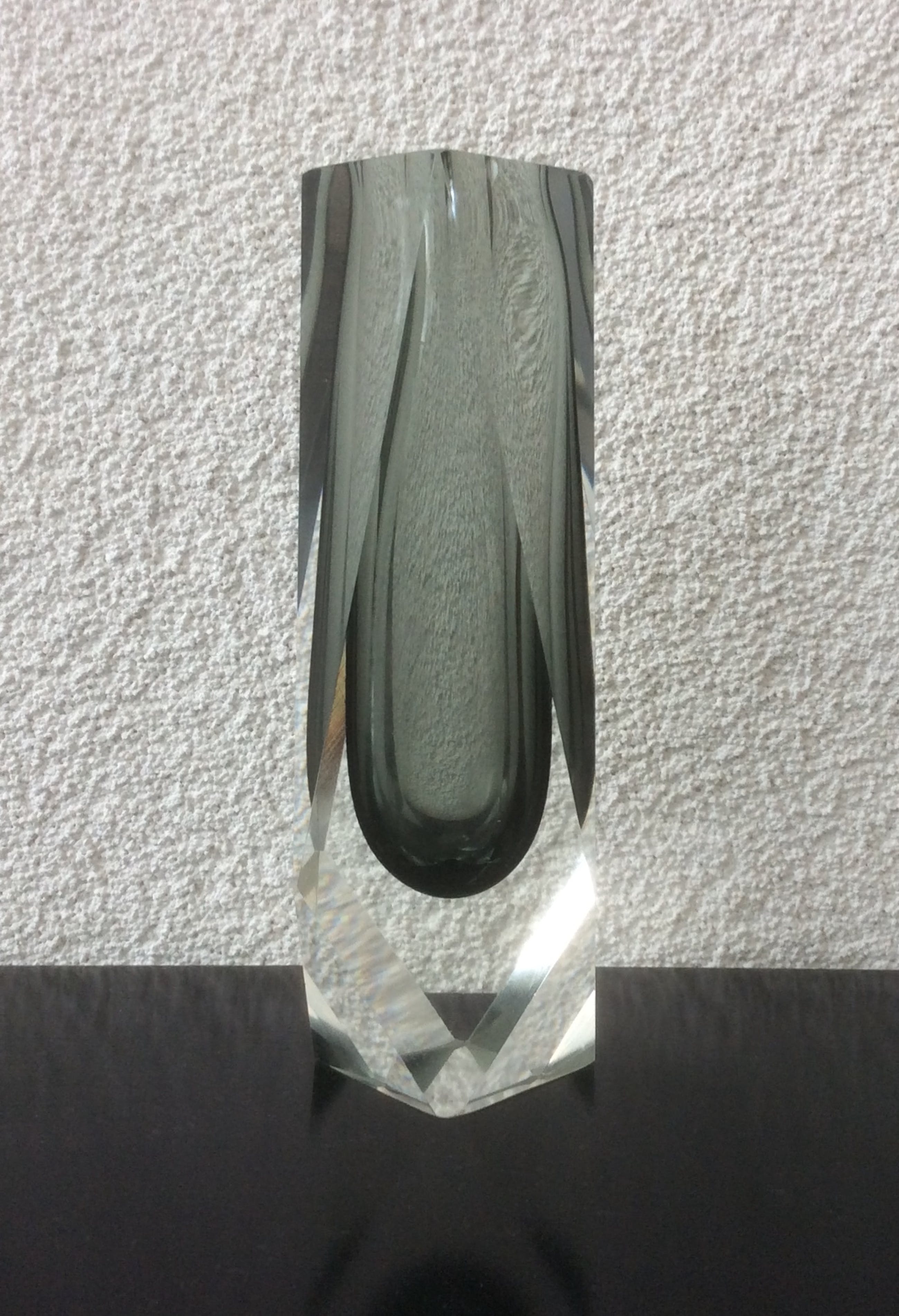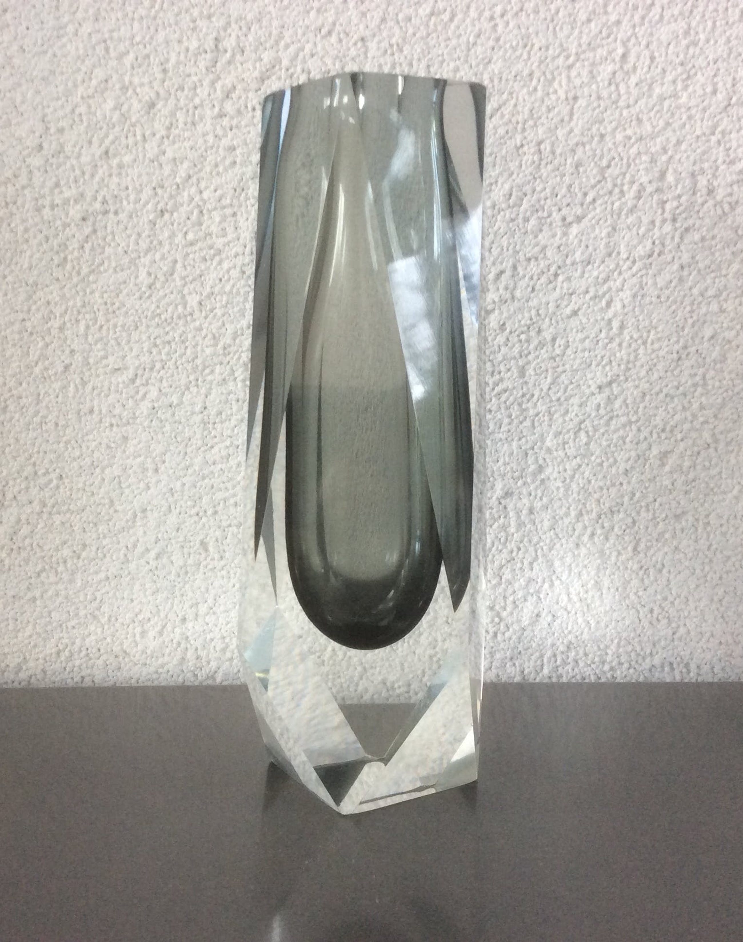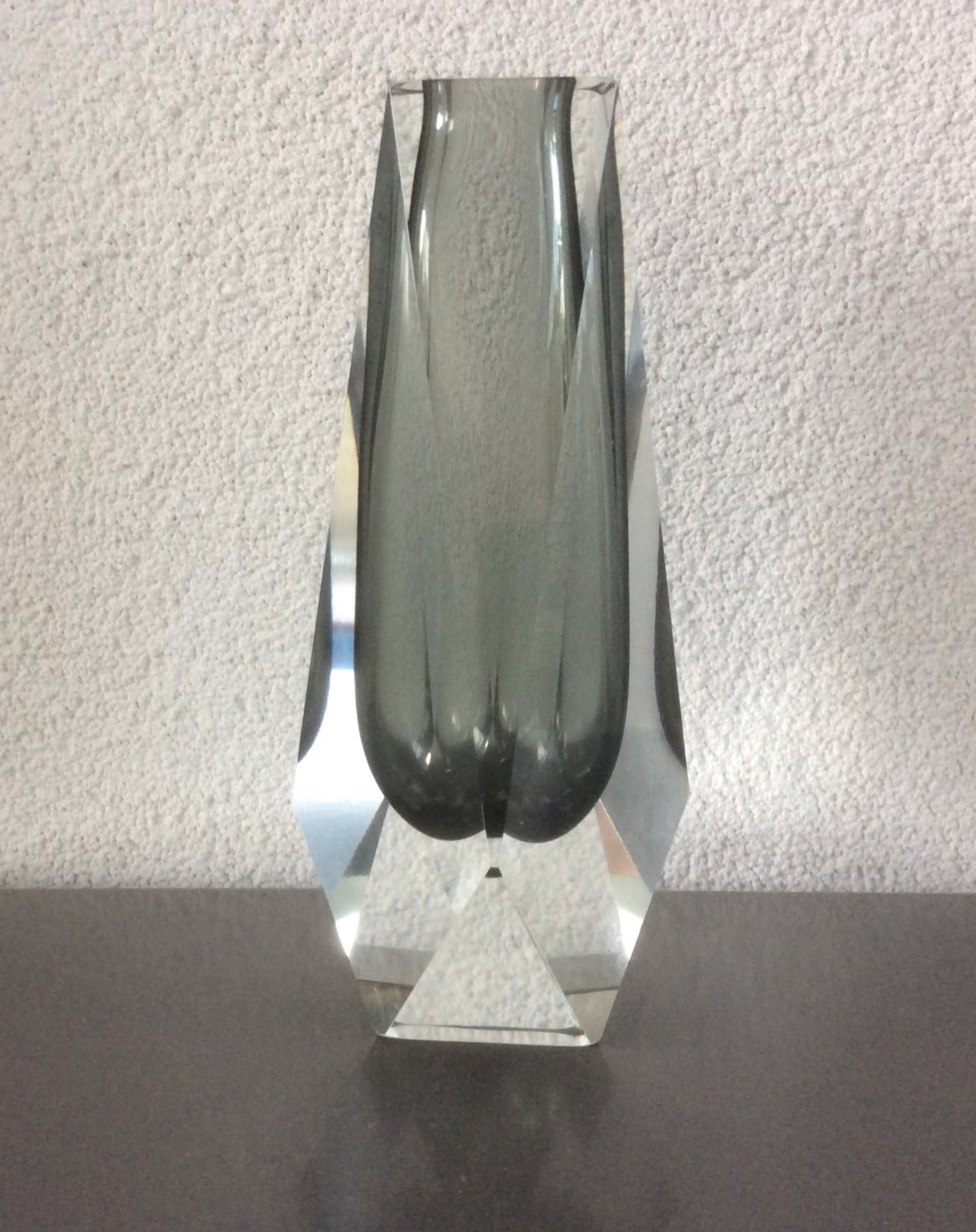 Een Mandruzzato Murano facetgeslepen blokvaas, uitgevoerd met de Sommerso techniek in de kleur donkergrijs en omsloten in helder glas. De vaas heeft twaalf facetten.