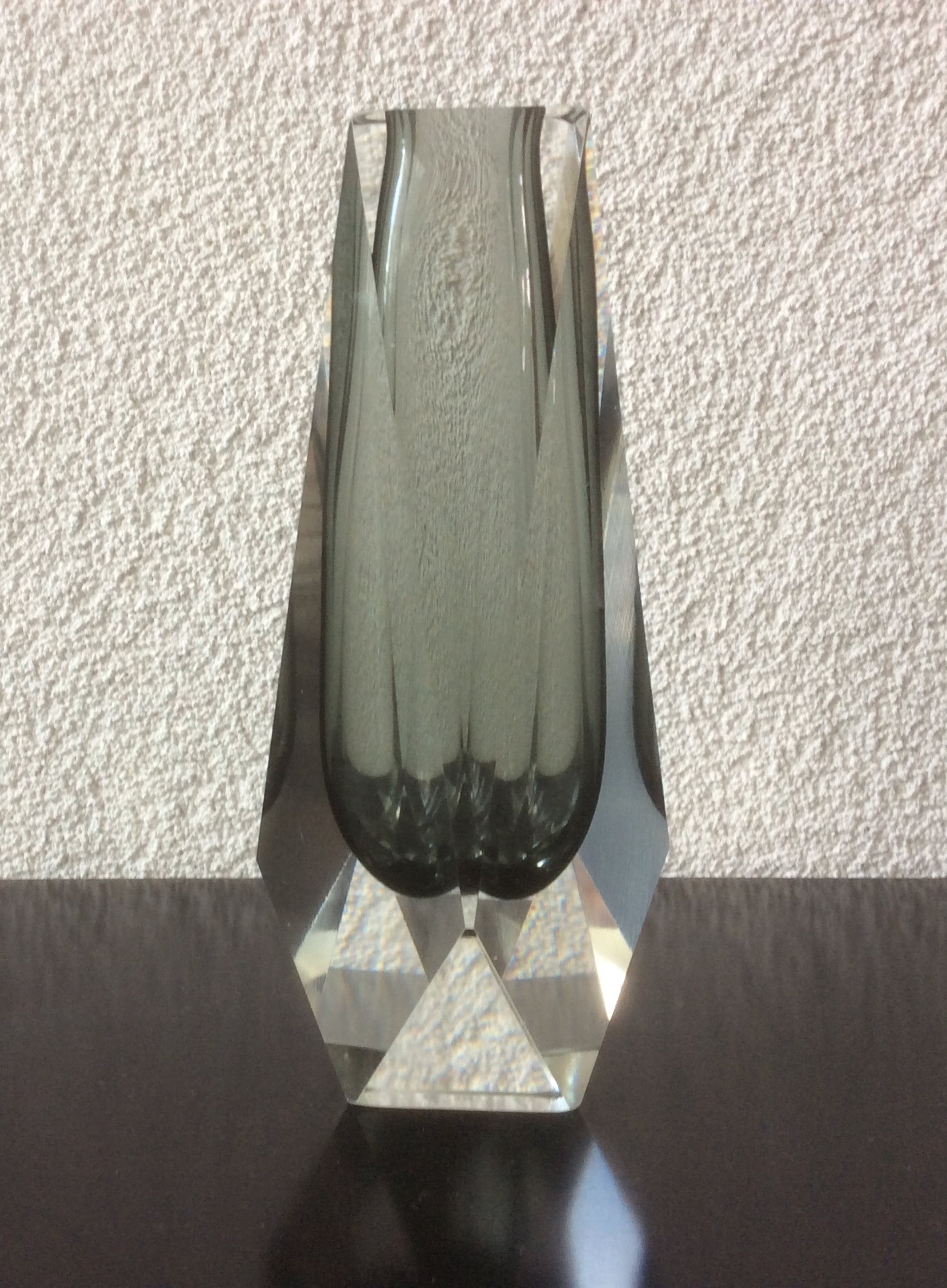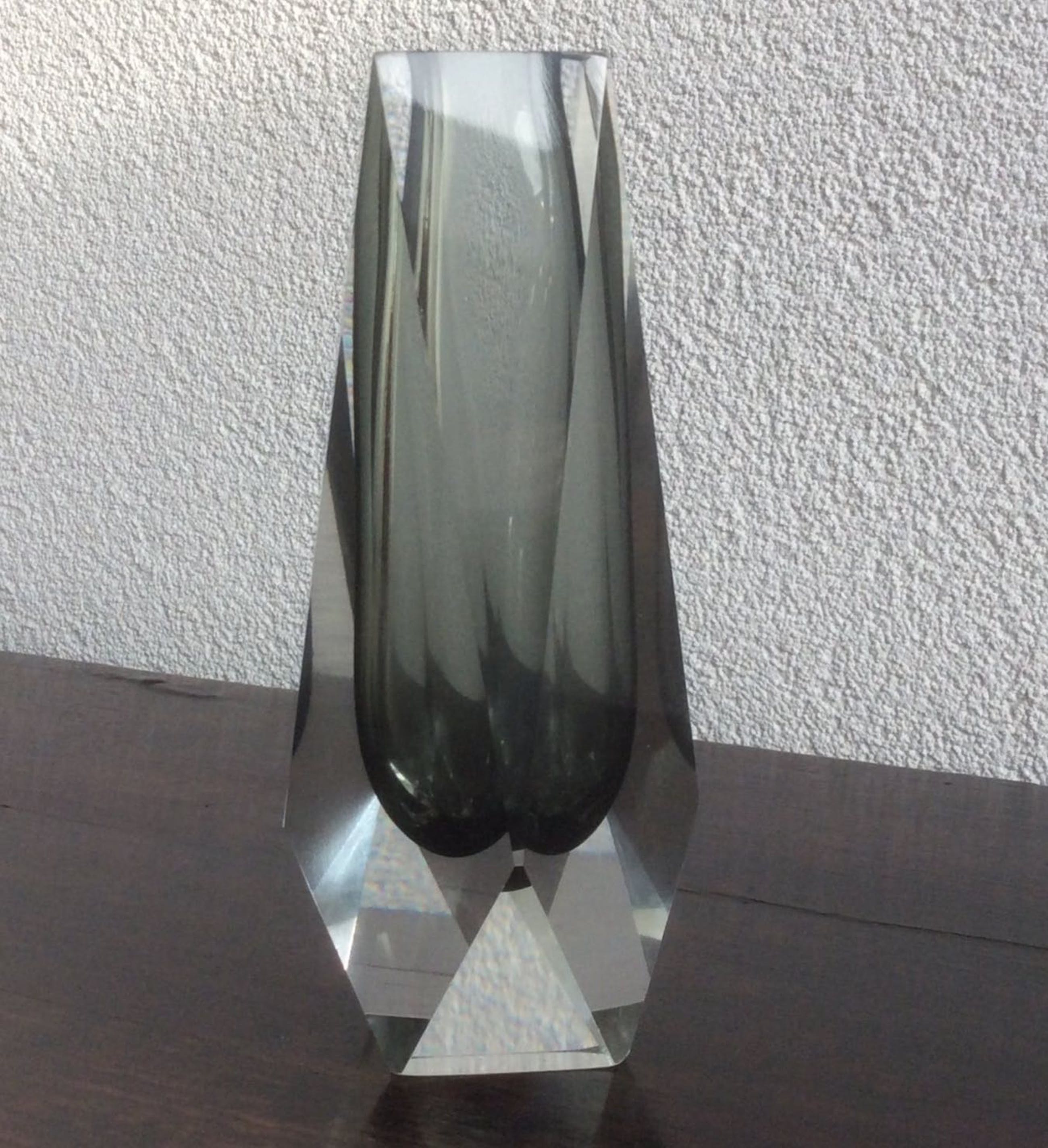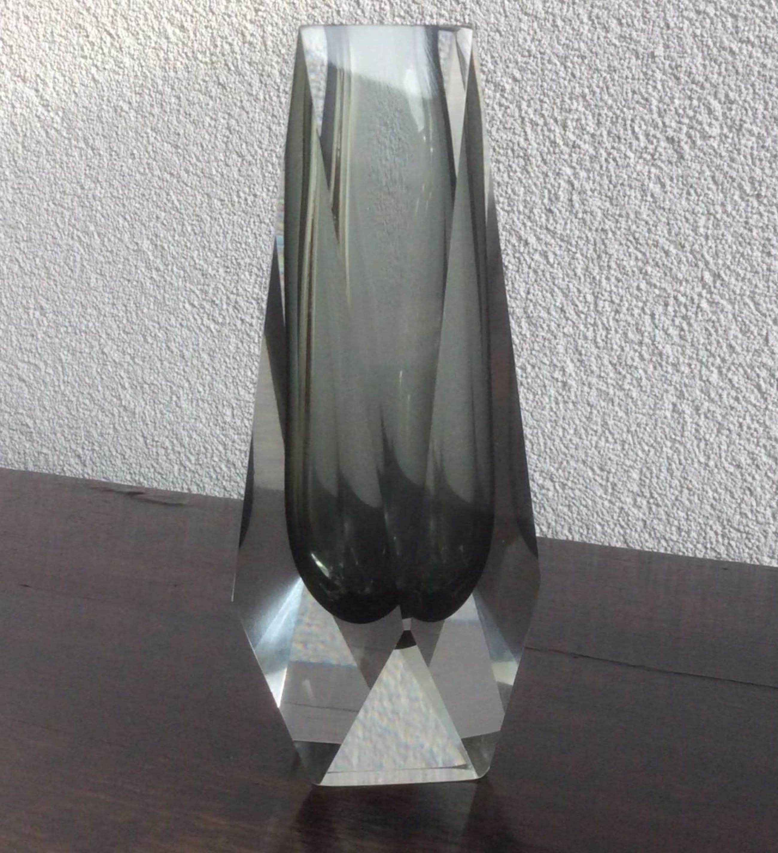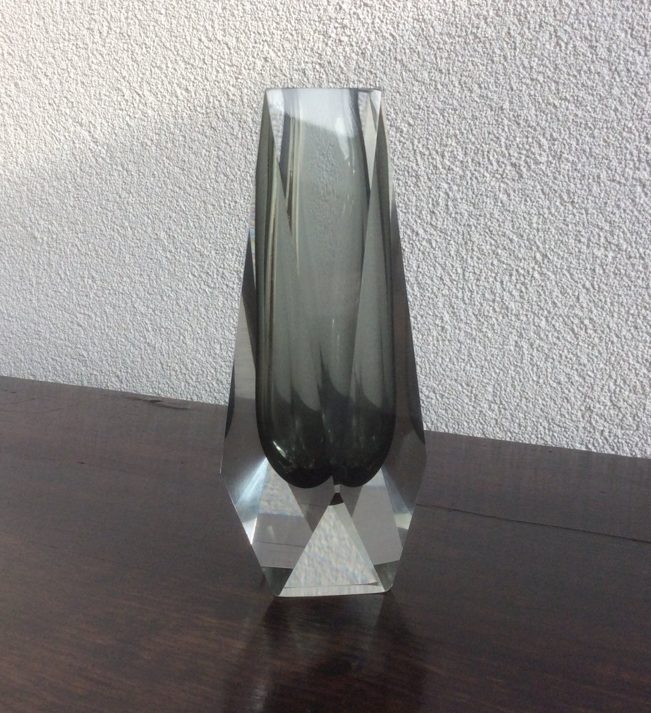 Een Mandruzzato Murano facetgeslepen blokvaas, uitgevoerd met de Sommerso techniek in de kleur donkergrijs en omsloten in helder glas. De vaas heeft twaalf facetten.