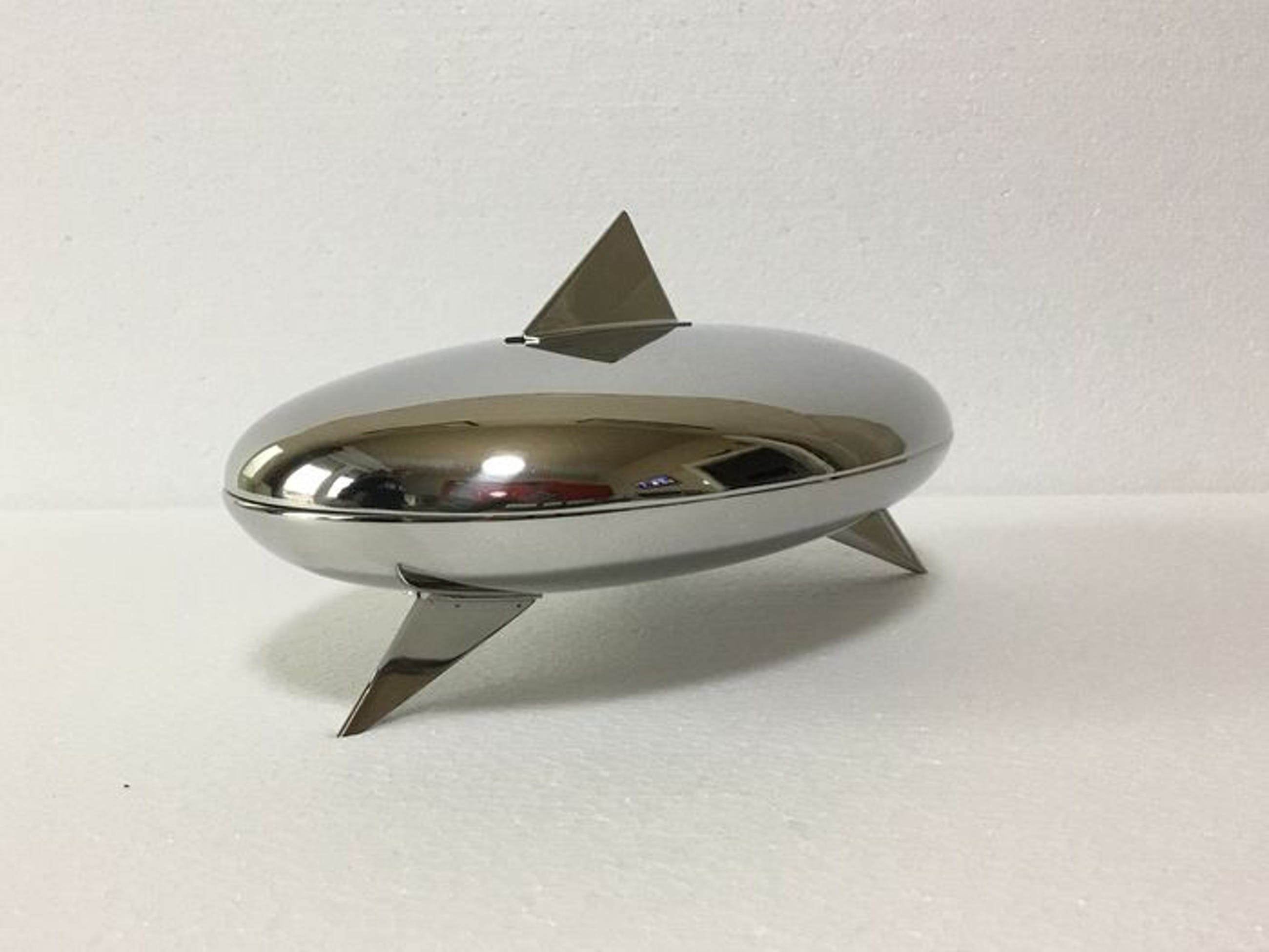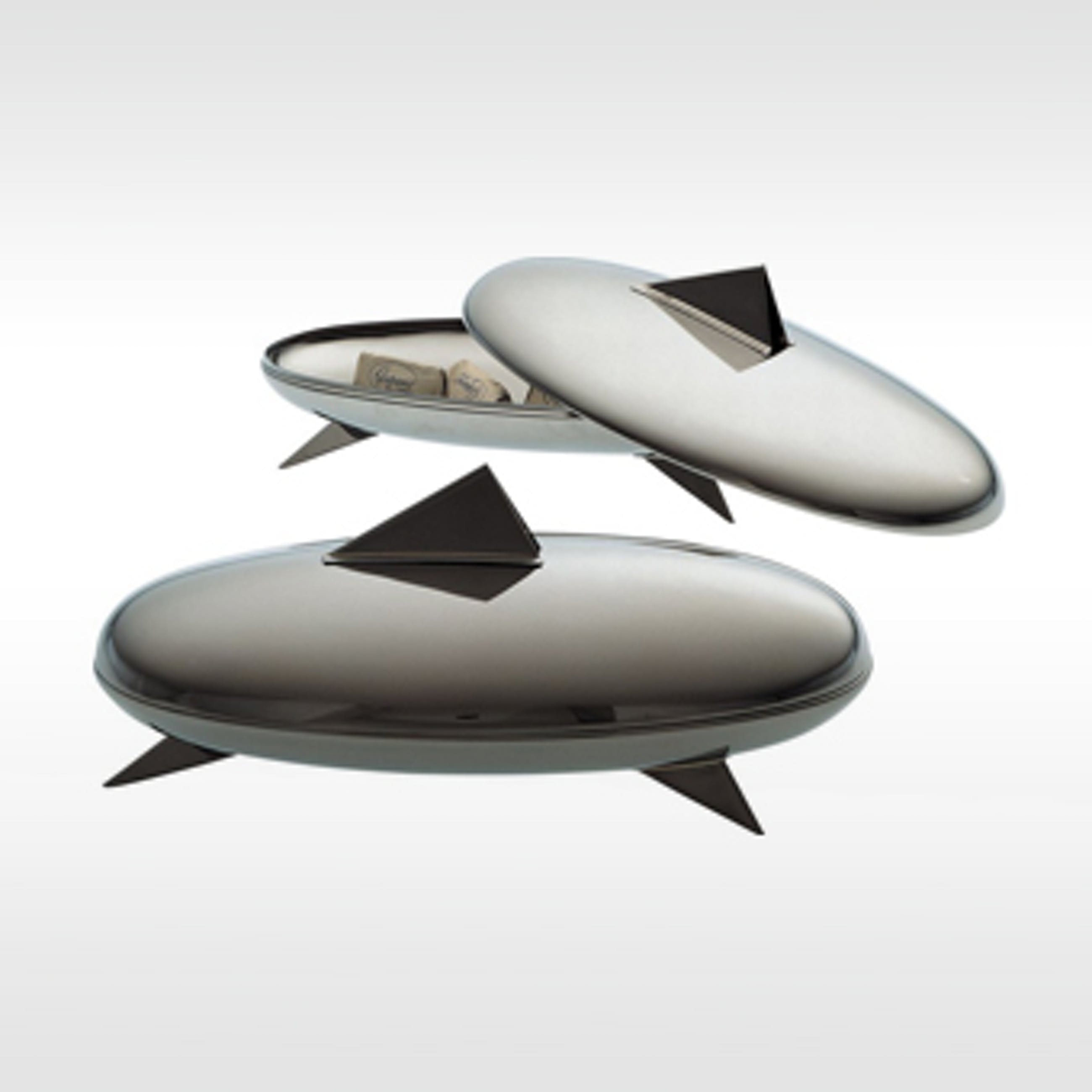 Een van de mooie design iconen uit de Alessi collectie. De ovale chromen chocoladedoos is gemerkt met: Officina Alessi Lengte 28 cm x breedte 18 cm x hoogte 12 cm.