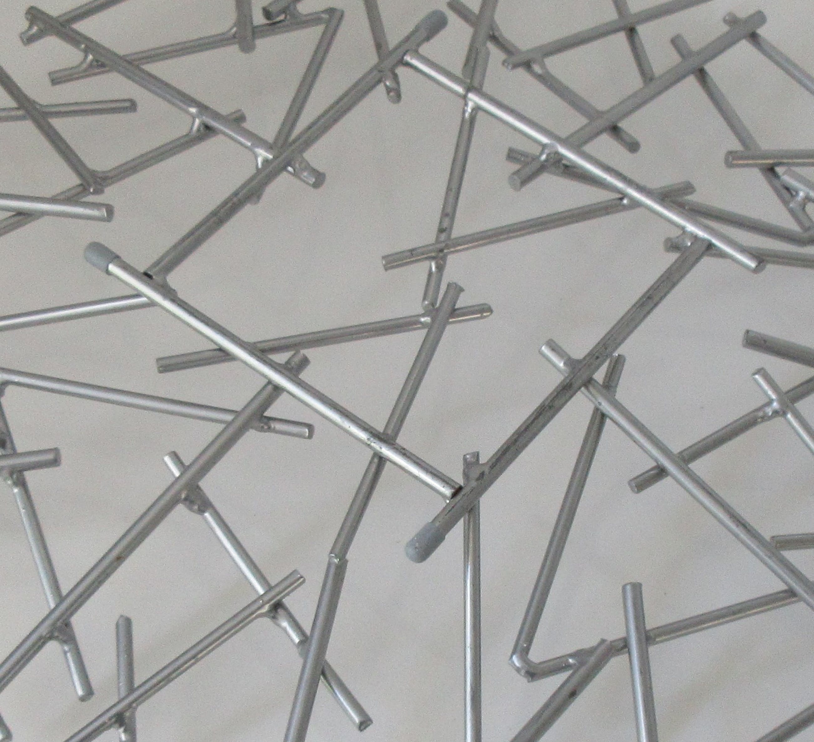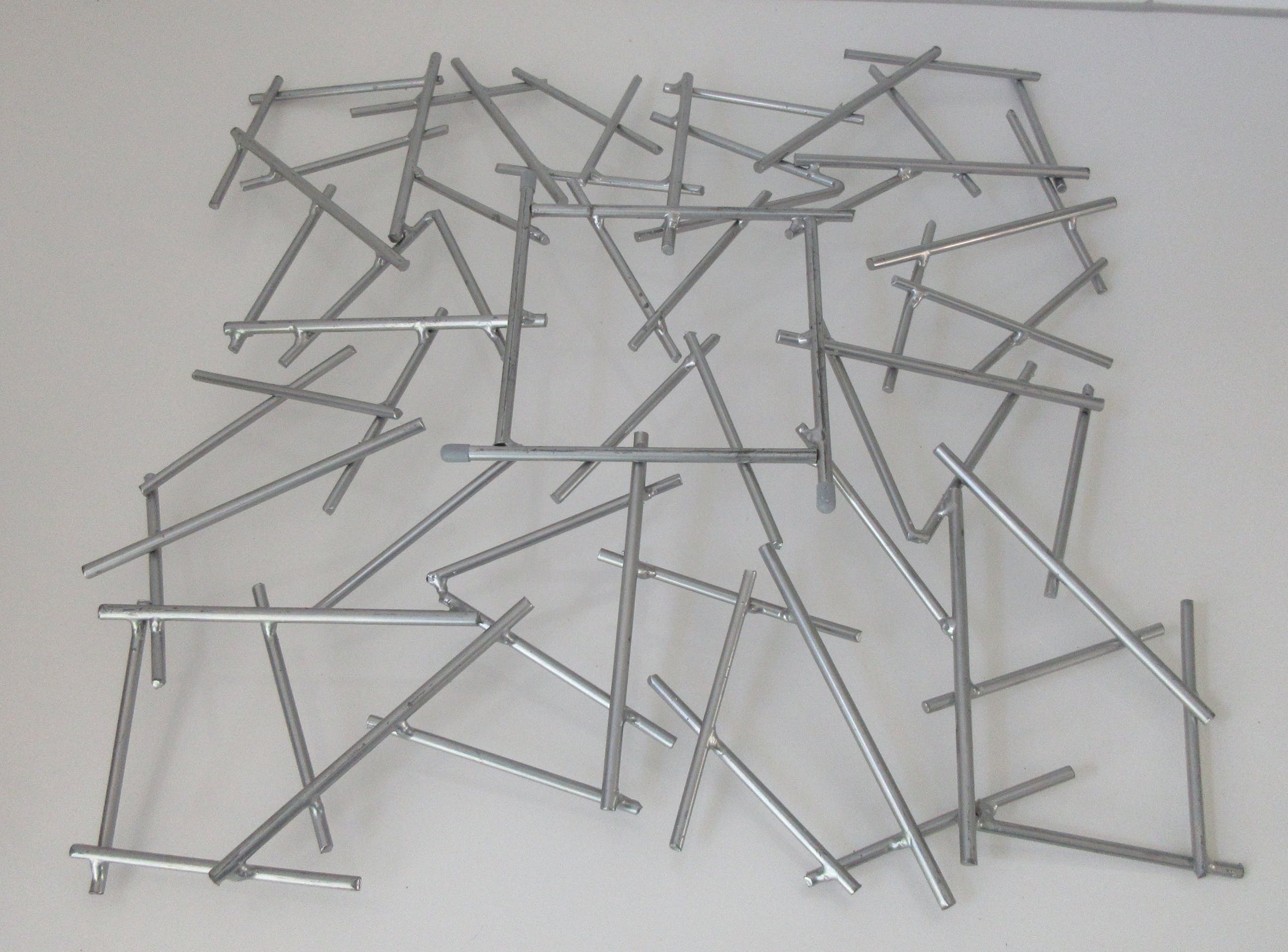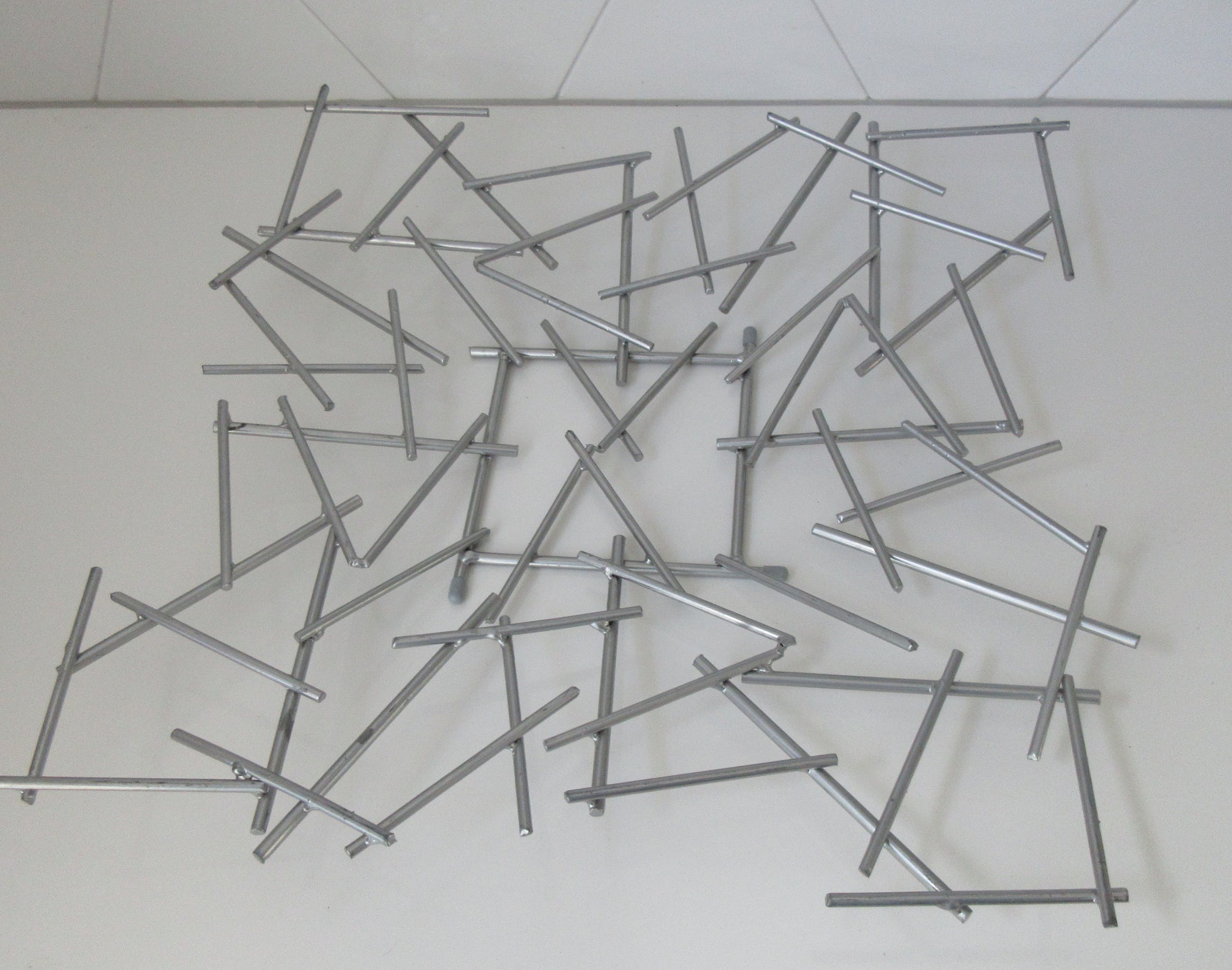 Een moderne, grote centerpiece schaal van Alessi. Unieke design met een aparte constructie. Van gesoldeerd of gelaste RVS staafjes is het opgebouwd ontwerp. De schaal is een grote variant. De afmetingen zijn circa H 10 x L 53 x B 45 cm. De conditie is zeer goed. De schaal als fruitschaal of als sierschaal tegen een muur te gebruiken.