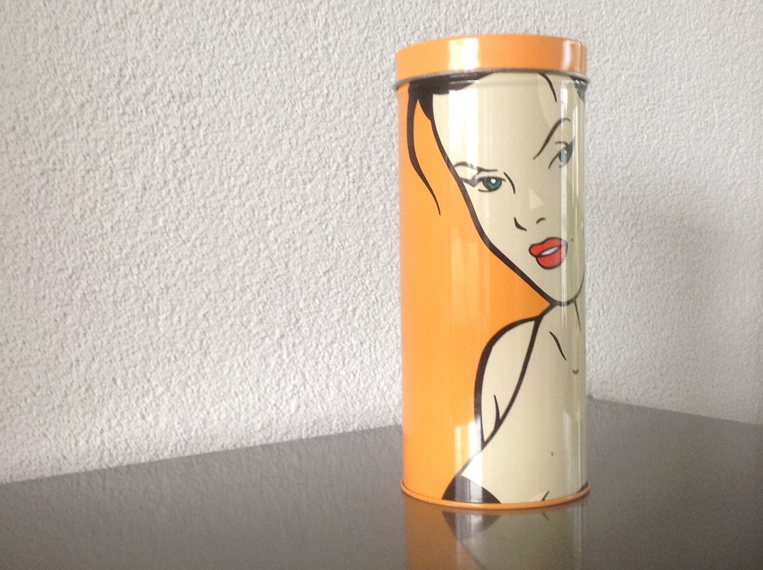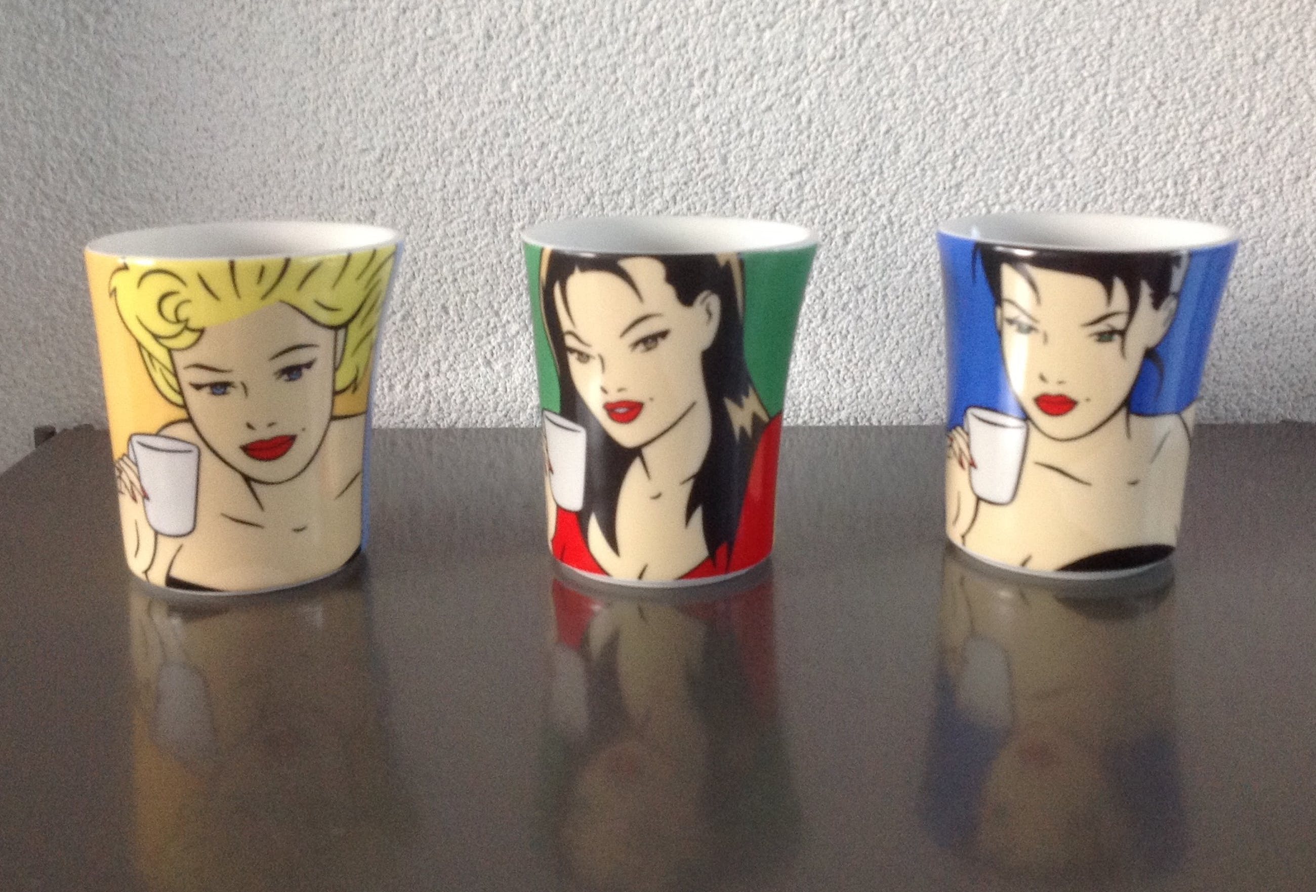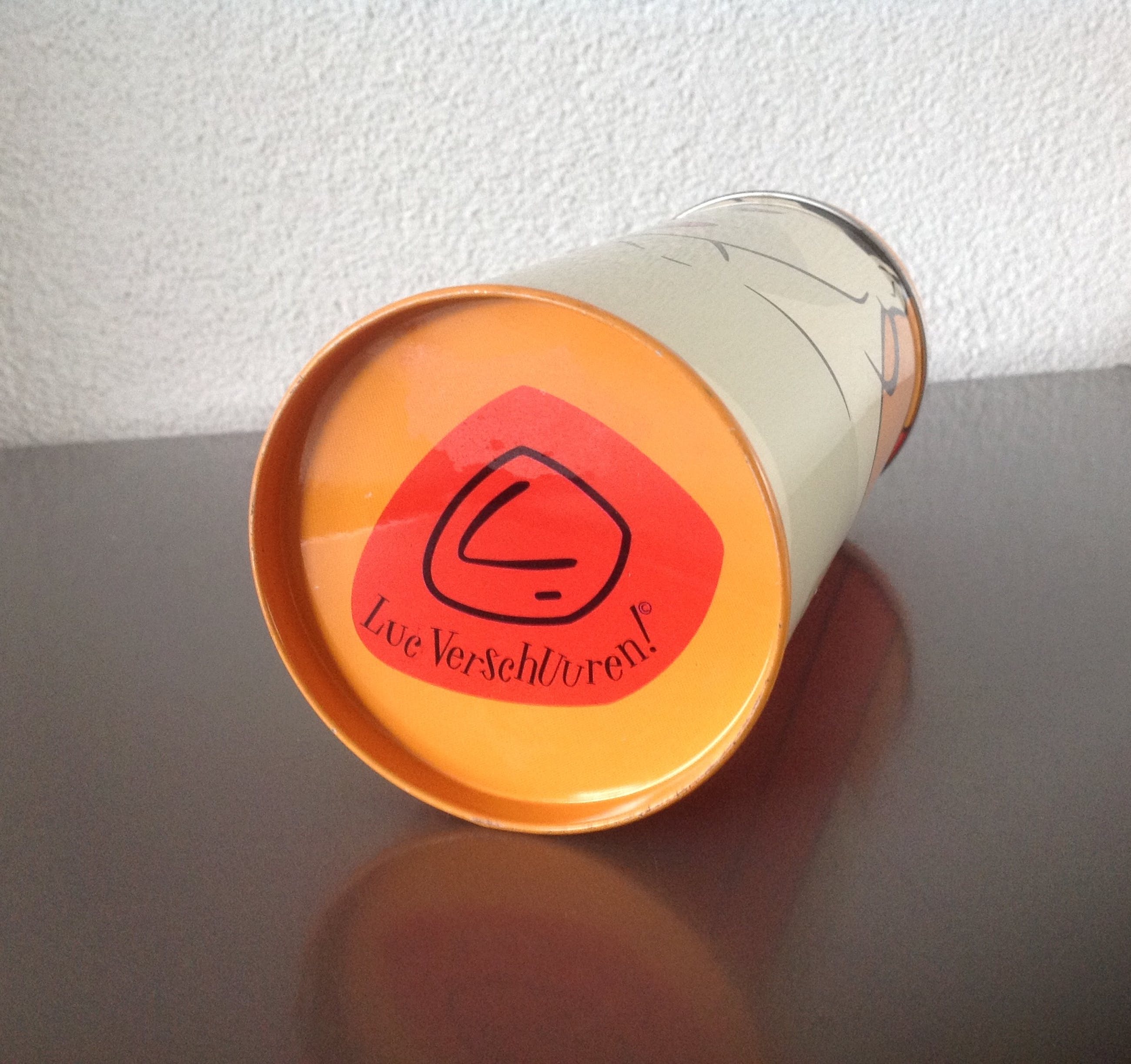 De vier Alessi lepeltjes, voorzien van de merknaam, zitten in de originele doos en zijn 14 cm lang.De drie kopjes en de bus tonen werk van Luc Verschuuren. Hij is een pop- art kunstenaar die werkt in de traditie van Andy Warhol en Roy Lichtenstein, maar zich ook laat inspireren door striptekenaars