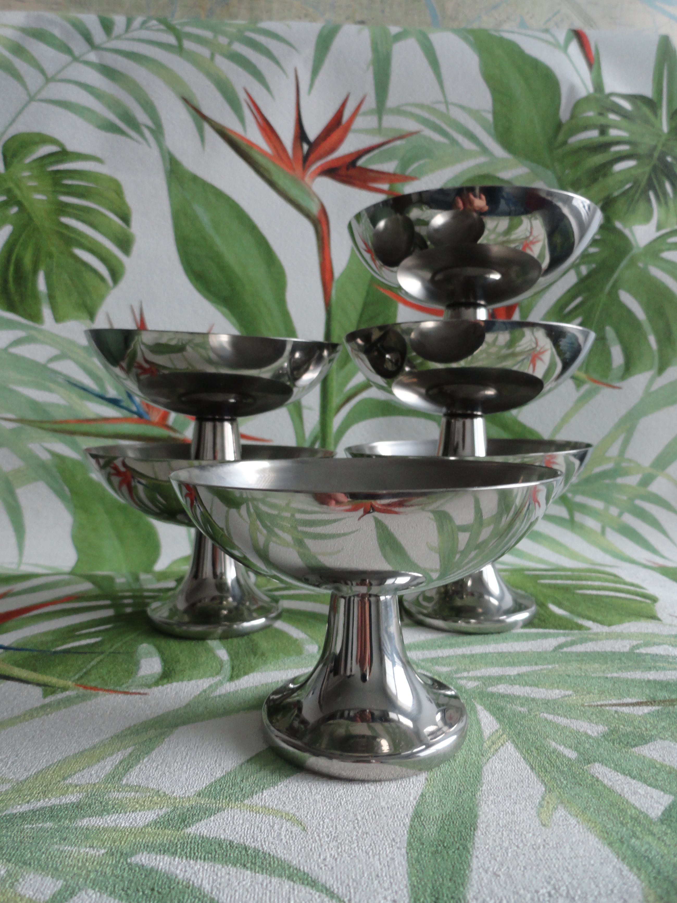 Vintage en tijdloos ! Design Carlo Alessi jaren 1940 / 50 set ijscoupes van RVS Inox 18/8