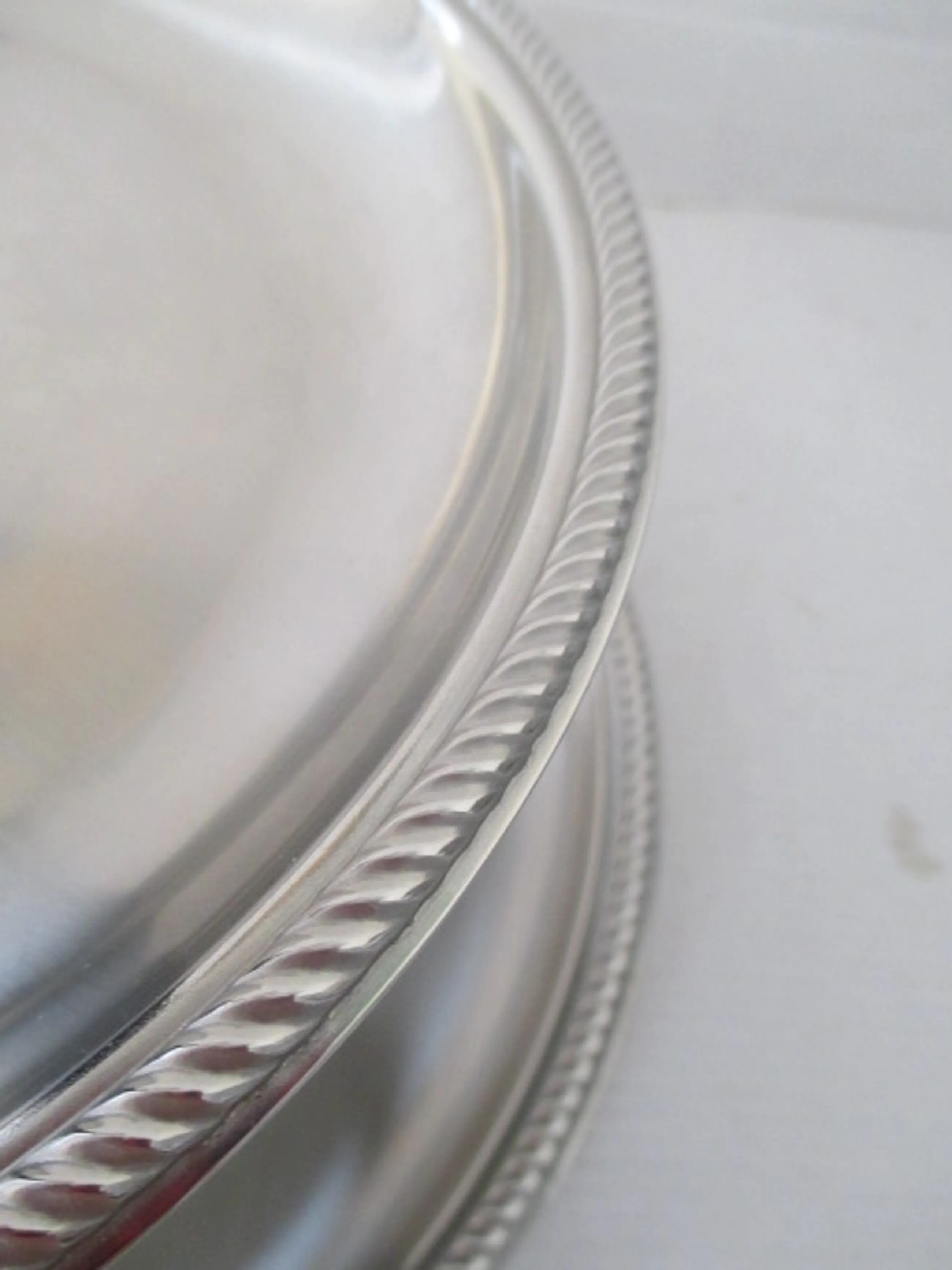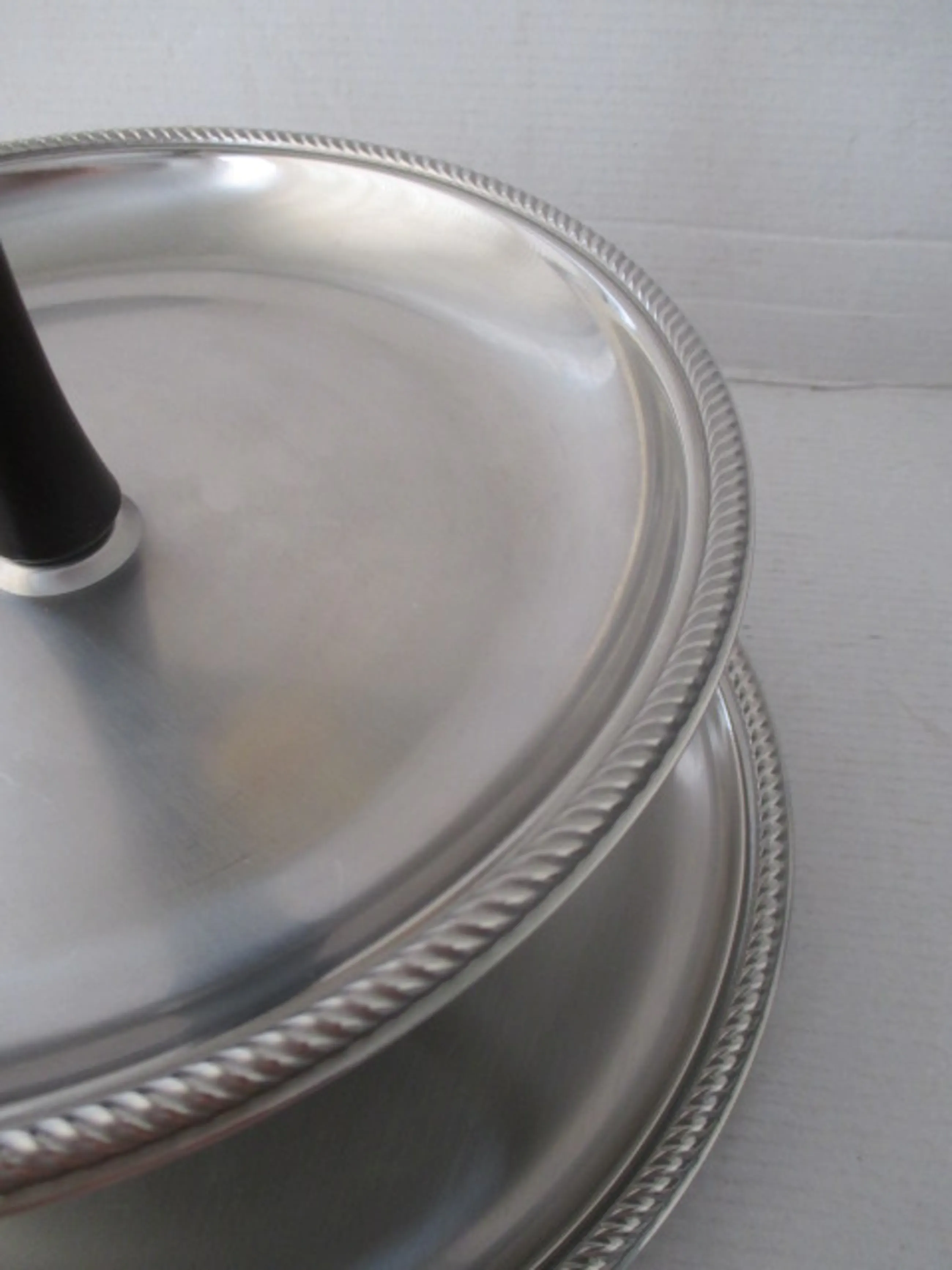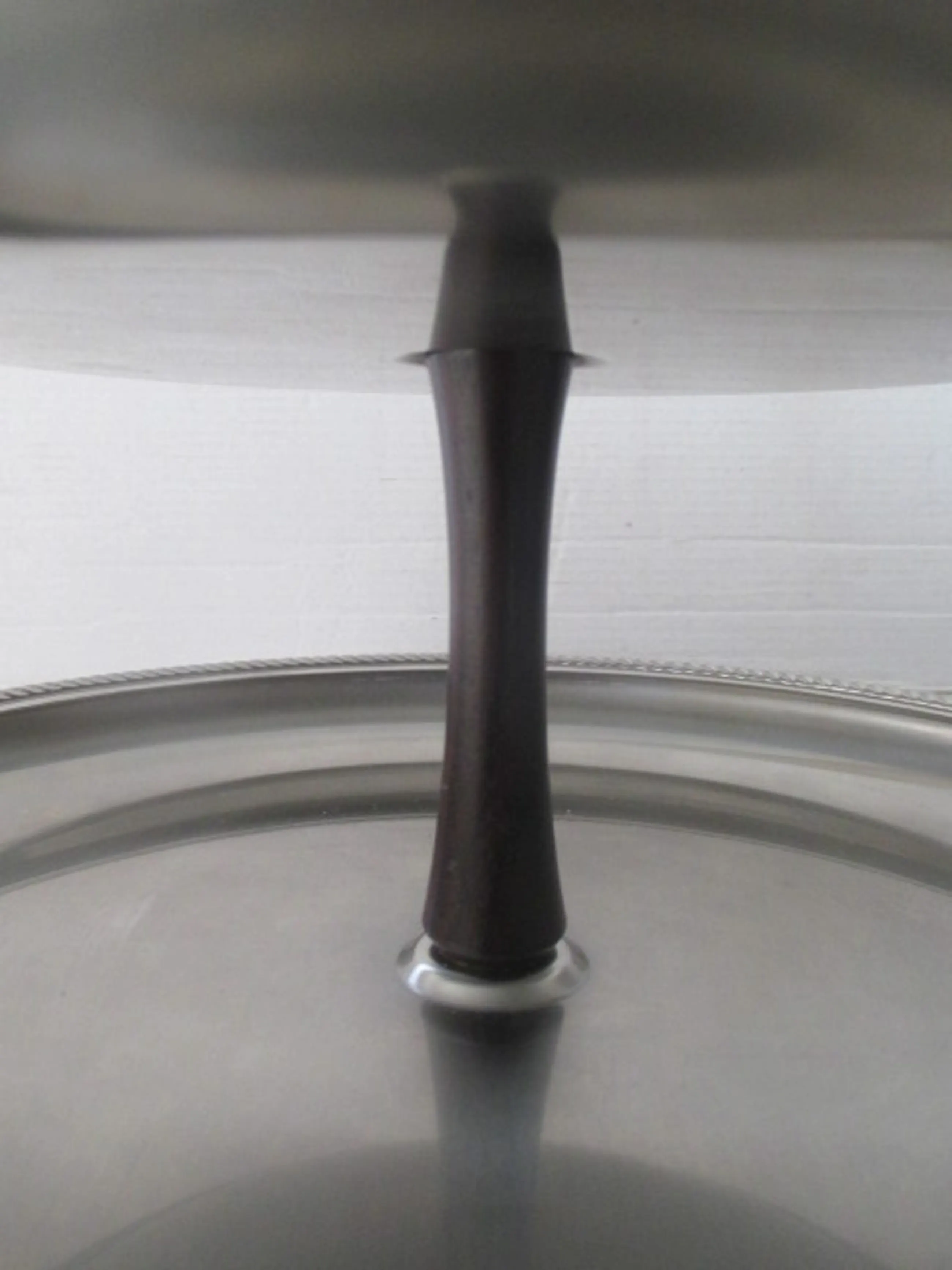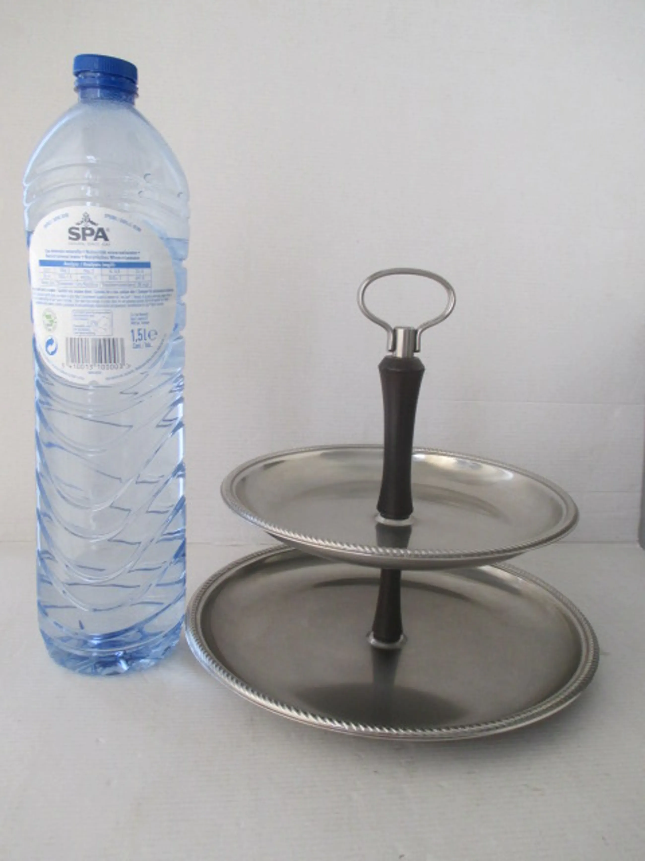 Afm.: totaal hoogte bedraagt 23 cm, diameter van de bovenste schaal is 21 cm, diameter van onderste schaal is 25 cm.