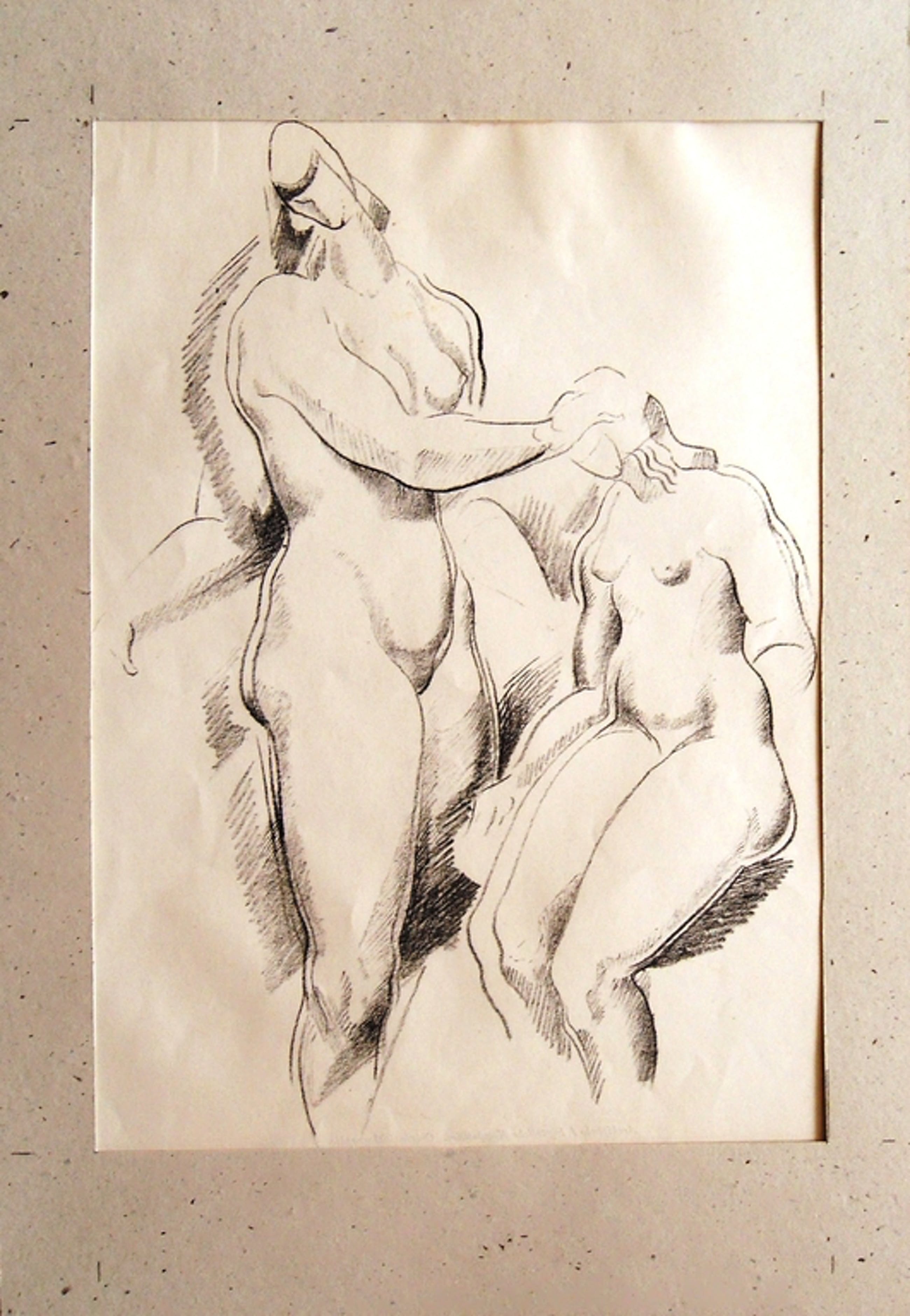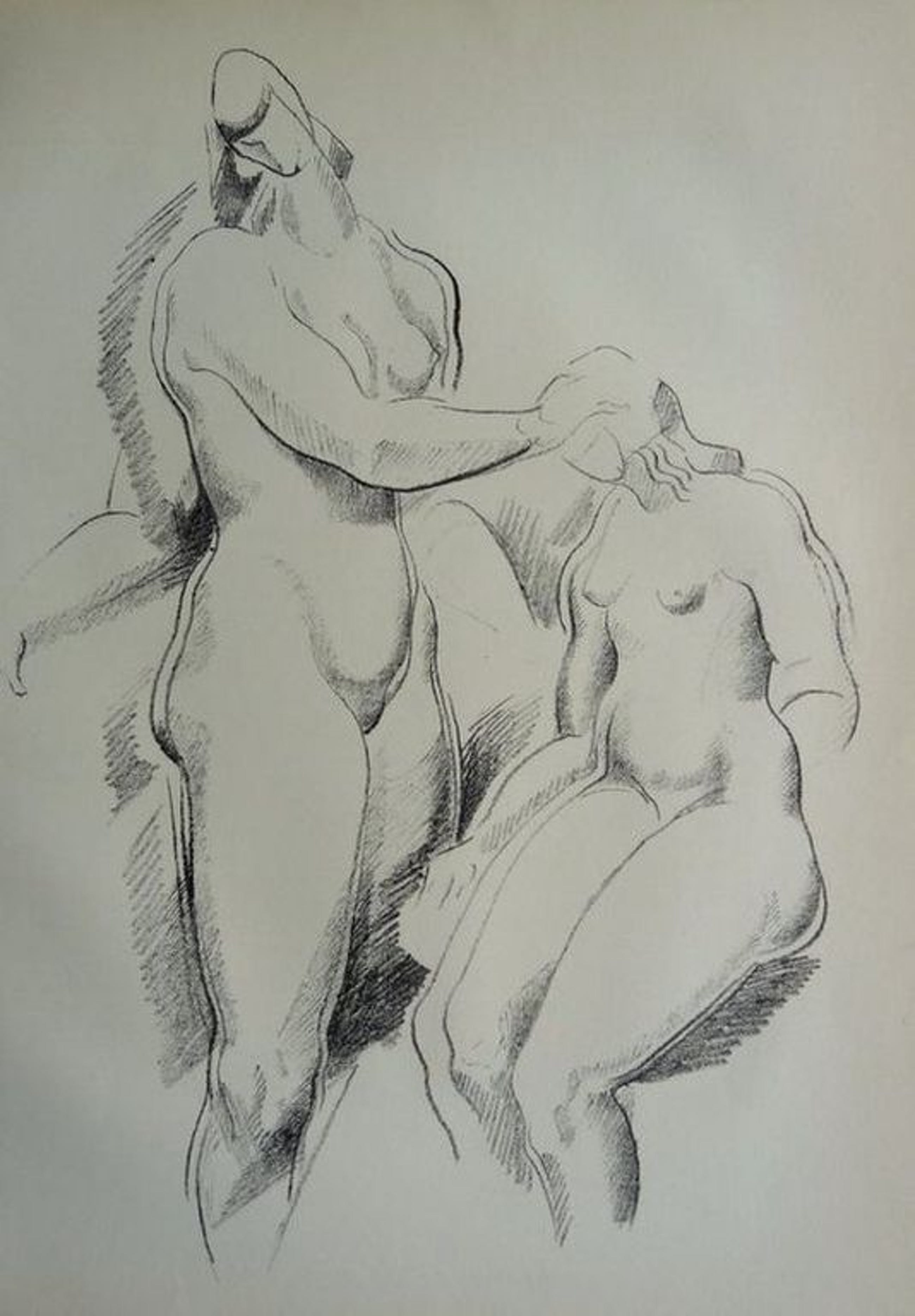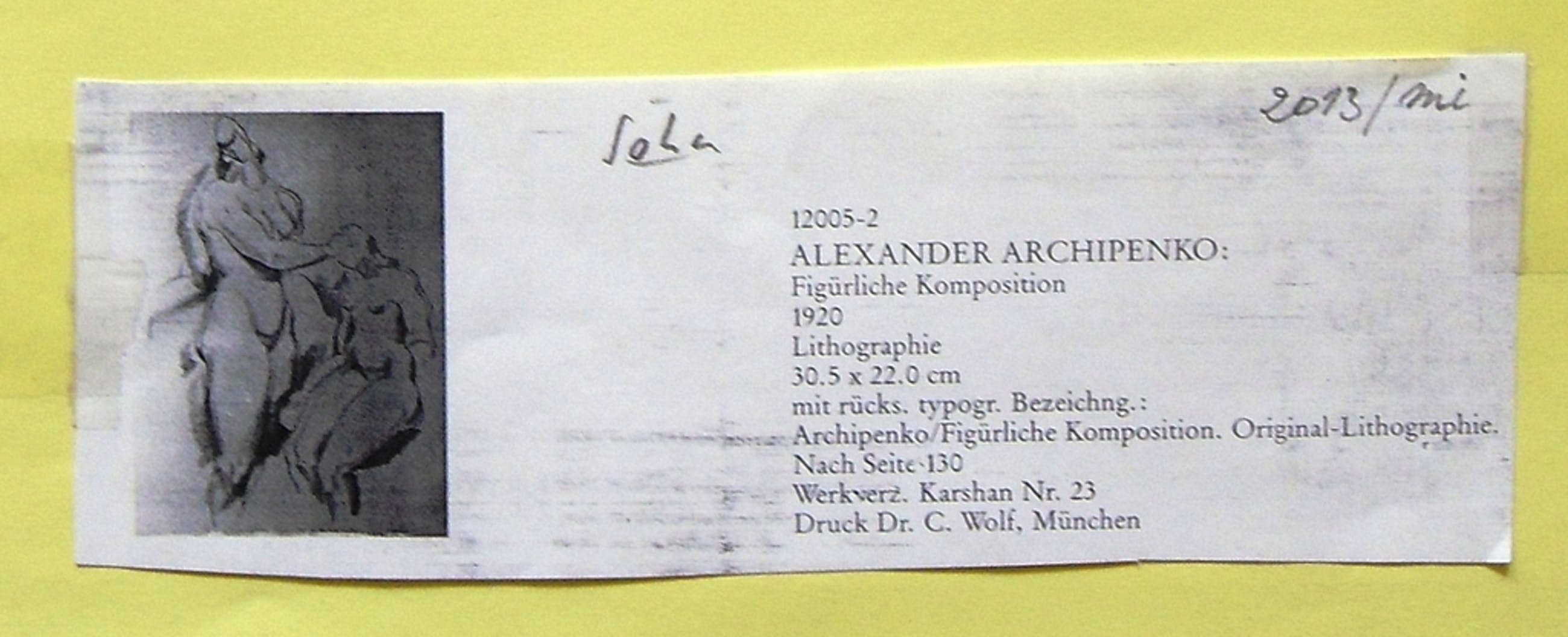 Techniek: originele lithografie uit 1920 op papier, op de achterzijde betiteld: Archipenko / figürliche Komposition Originallithographie