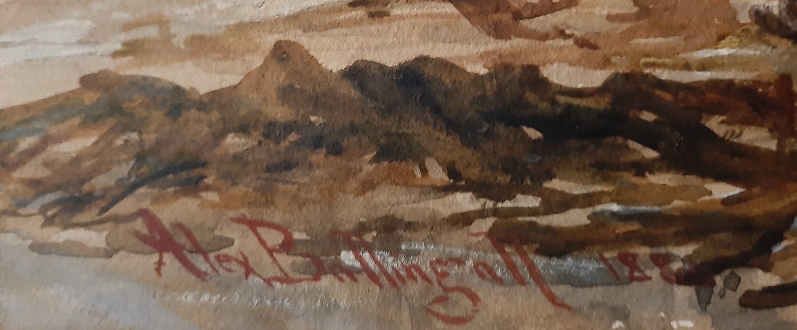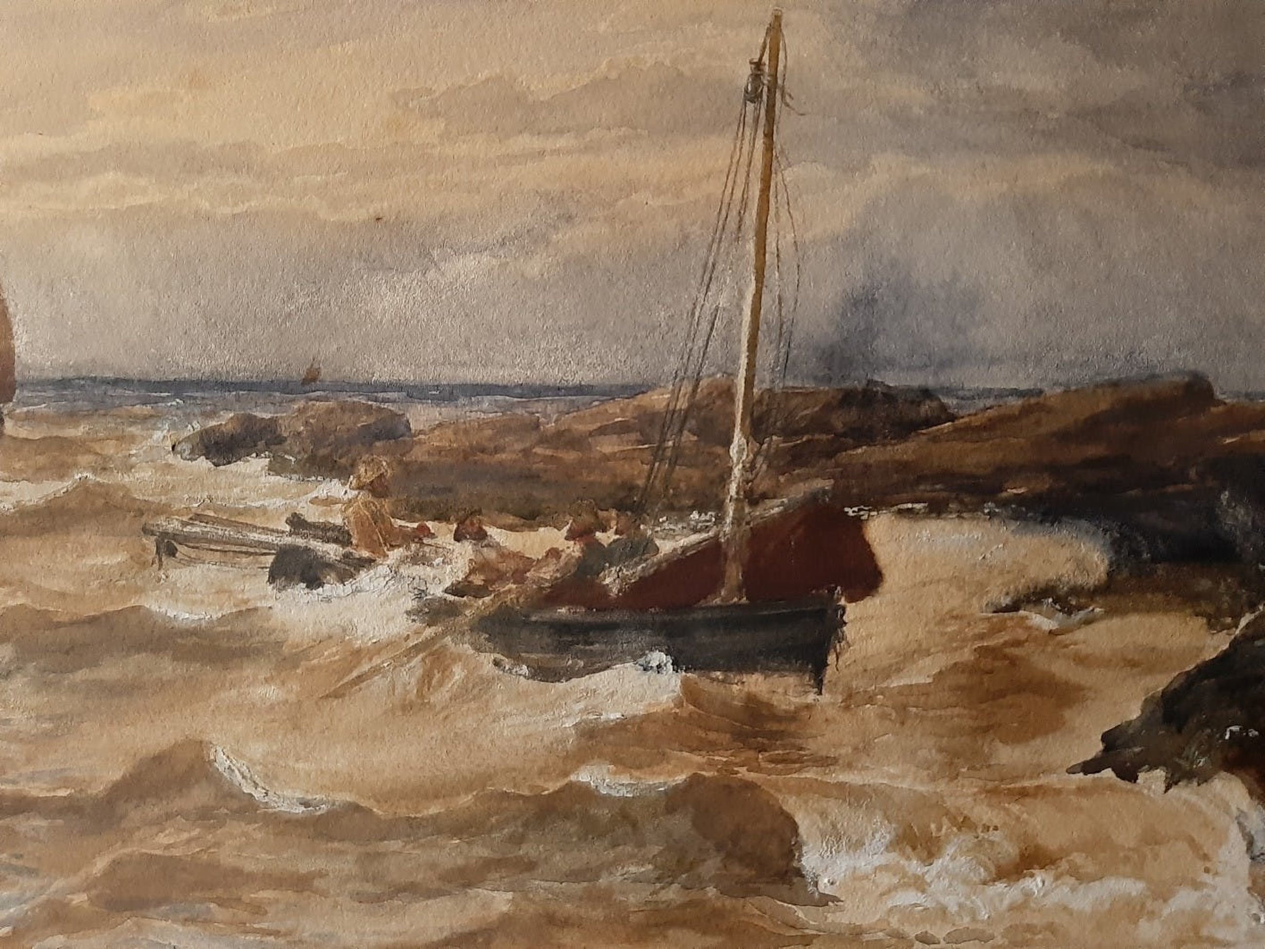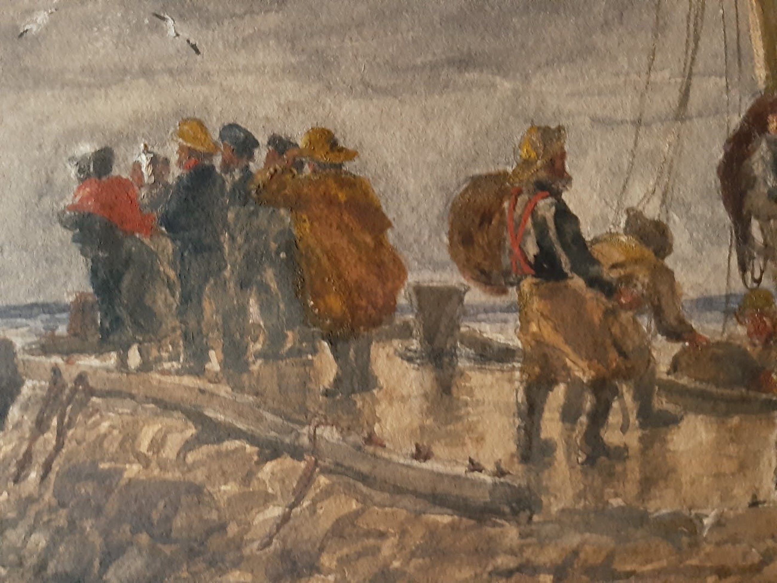 Een prachtige aquarel met de titel: 'Crossing the Bar-Largo'. Dit is een baai in Schotland.De aquarel is in prima conditie, het papier is gemonteerd op een spieraam, een werkwijze die in schotland en Engeland vaker werd toegepast.
