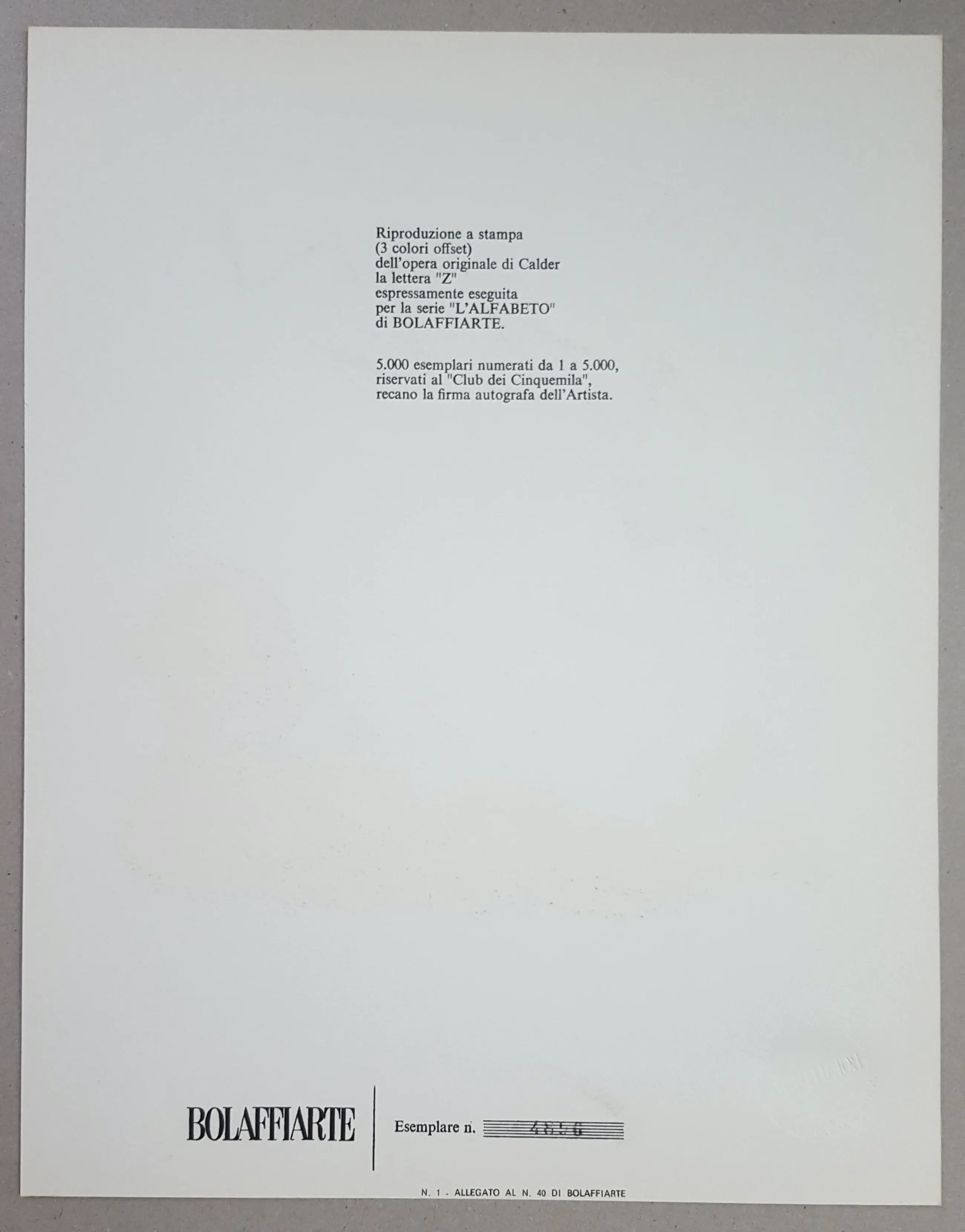 Alexander Calder: "Lettera Z" Photolithographie 1974 Bolaffi Arte signiert, gerahmt / mit Rahmen