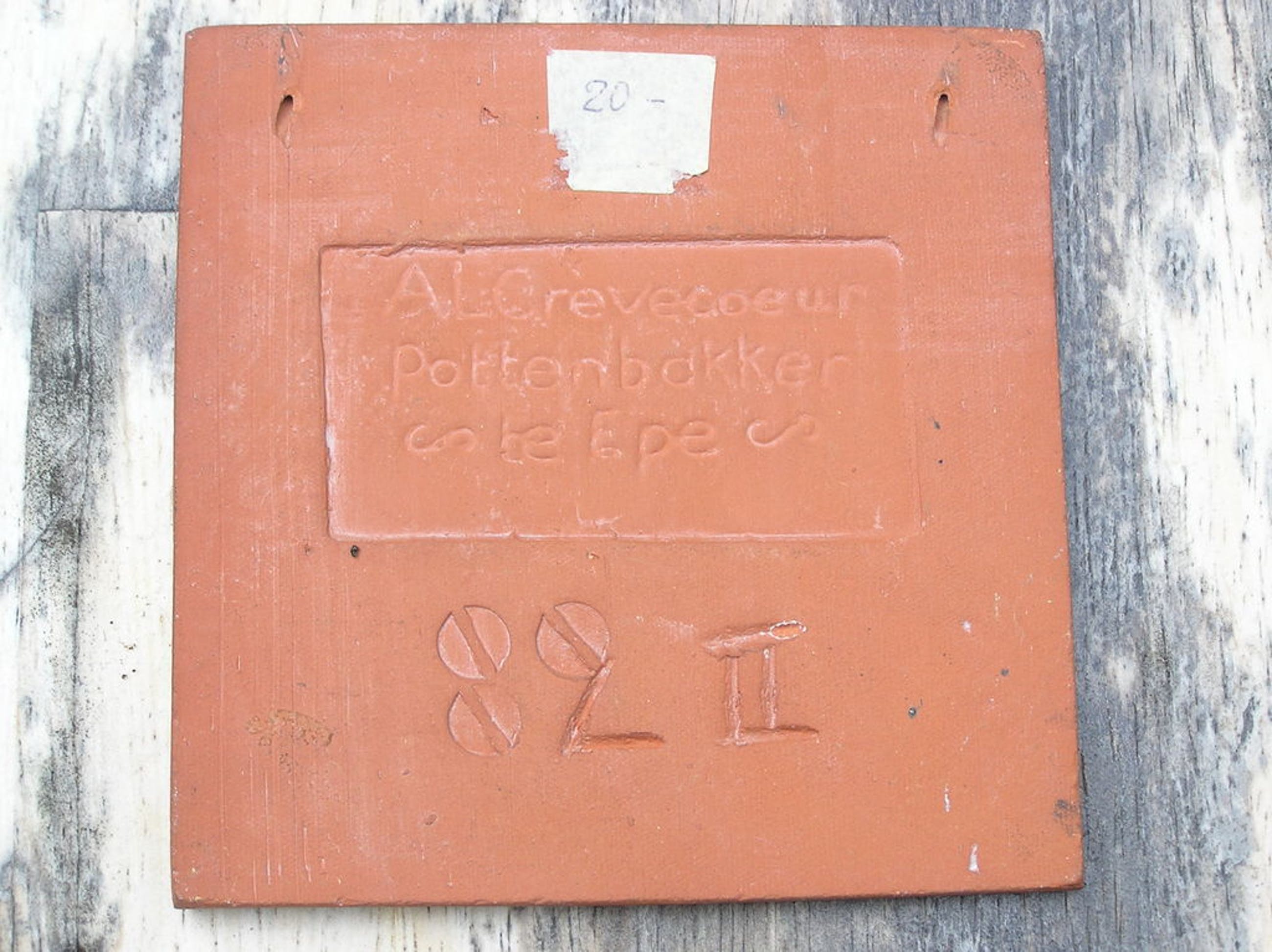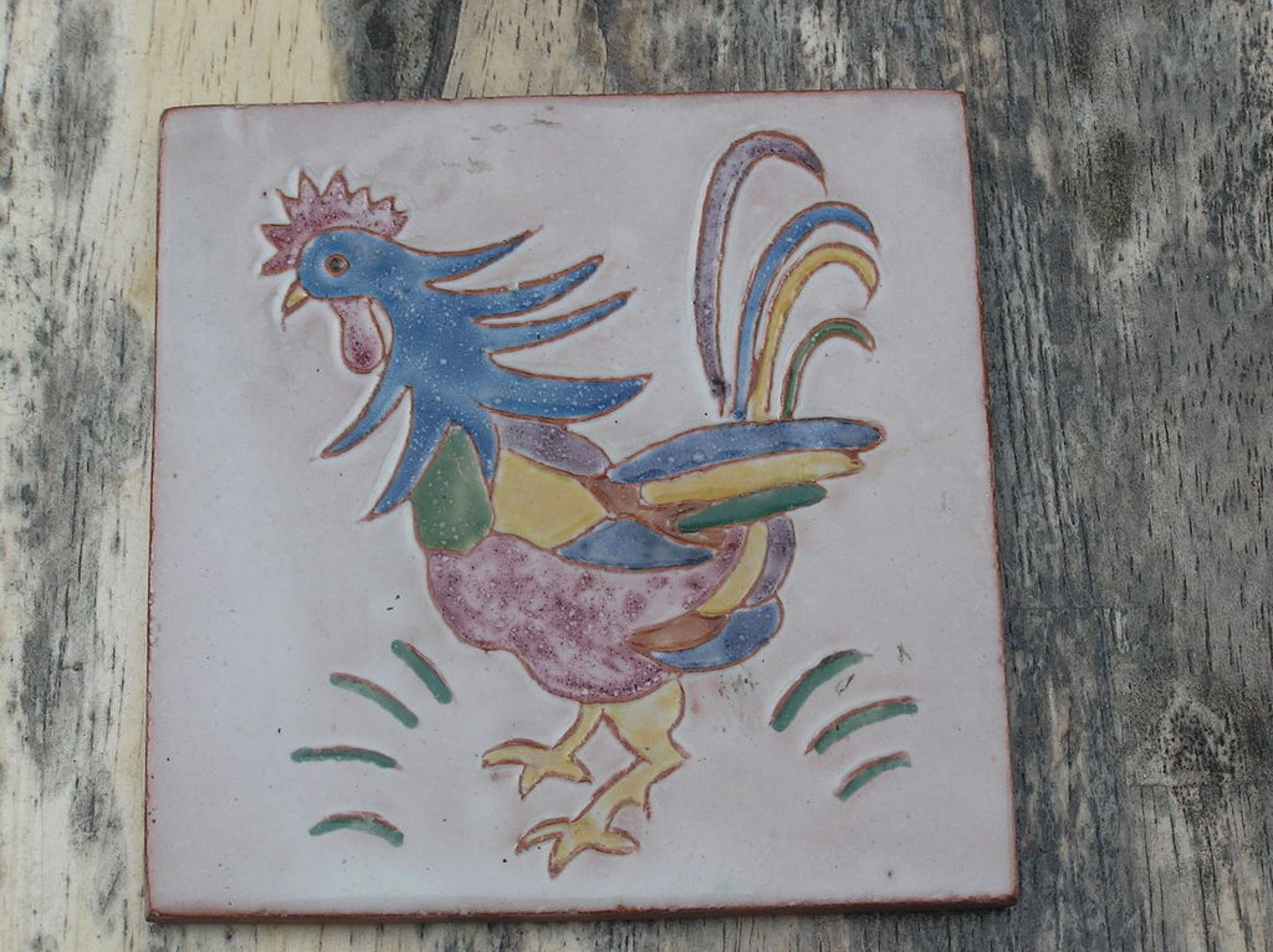 Andre Crevecoeur, kunstkeramische handbeschilderde wandtegel van een haan uitgevoerd in eigen pottenbakkerij. Achterzijde gemerkt; A.L. Crevecoeur, Pottenbakker te Epe, genummerd 82 en II. Afmetingen; 11 x 11 cm.