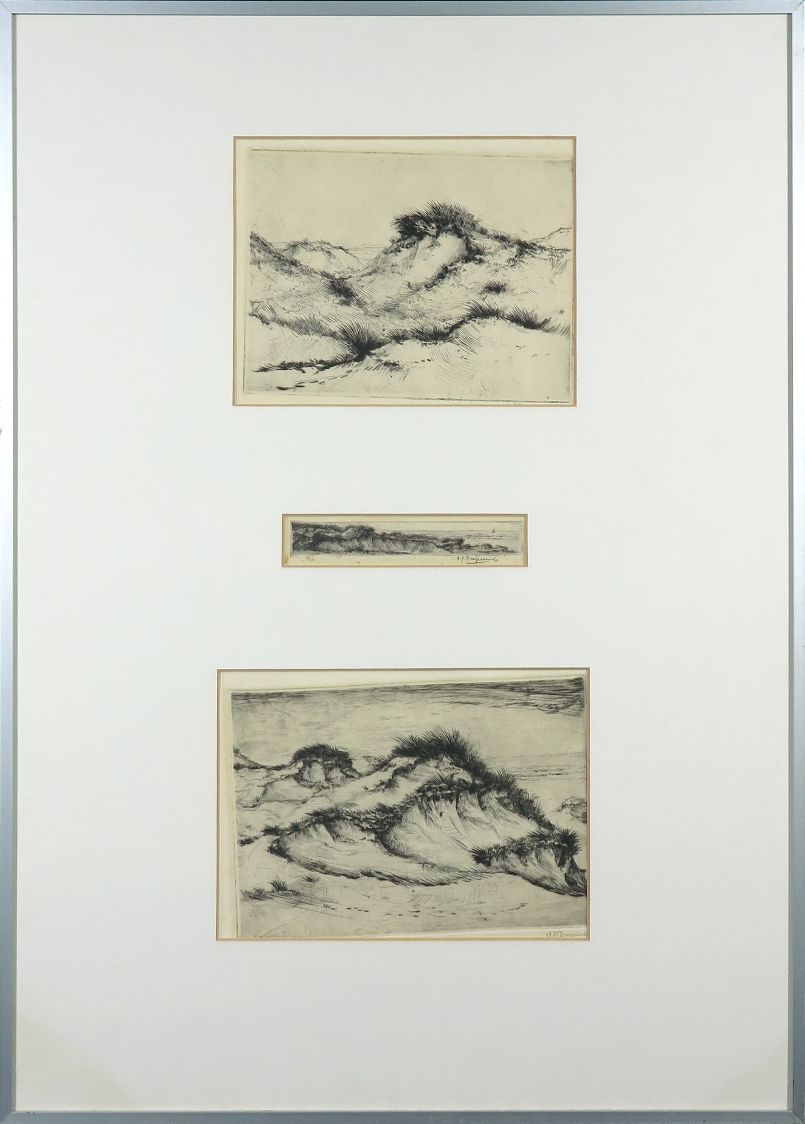 | Goede staat gezien leeftijd, maar wel wat vergeeld (met hier en daar lichte foxing). Zowel de bovenste als de onderste ets zitten niet meer recht achter het passe-partout. | |