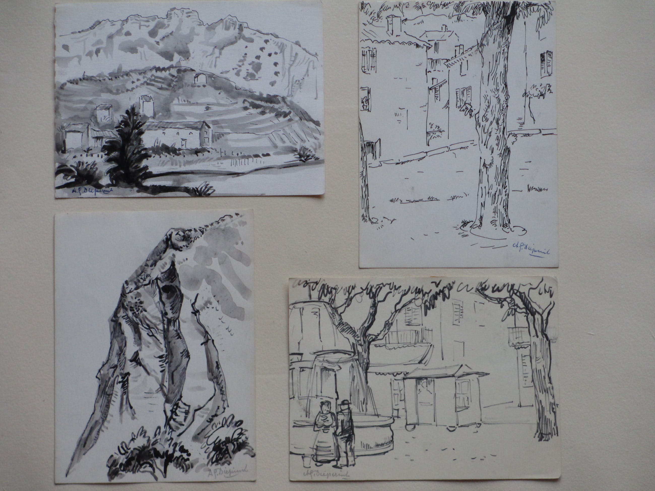 Vier gemengde technieken op papier door Alexander Gerhardus Dieperink (1901-1972). Voorstellingen van Italiaanse landschappen en dorpsgezichten. Losbladig, gemiddelde afmeting per tekening 13x18 cm. Allen gesigneerd in potlood of pen. Authenticiteit volledig gegarandeerd.