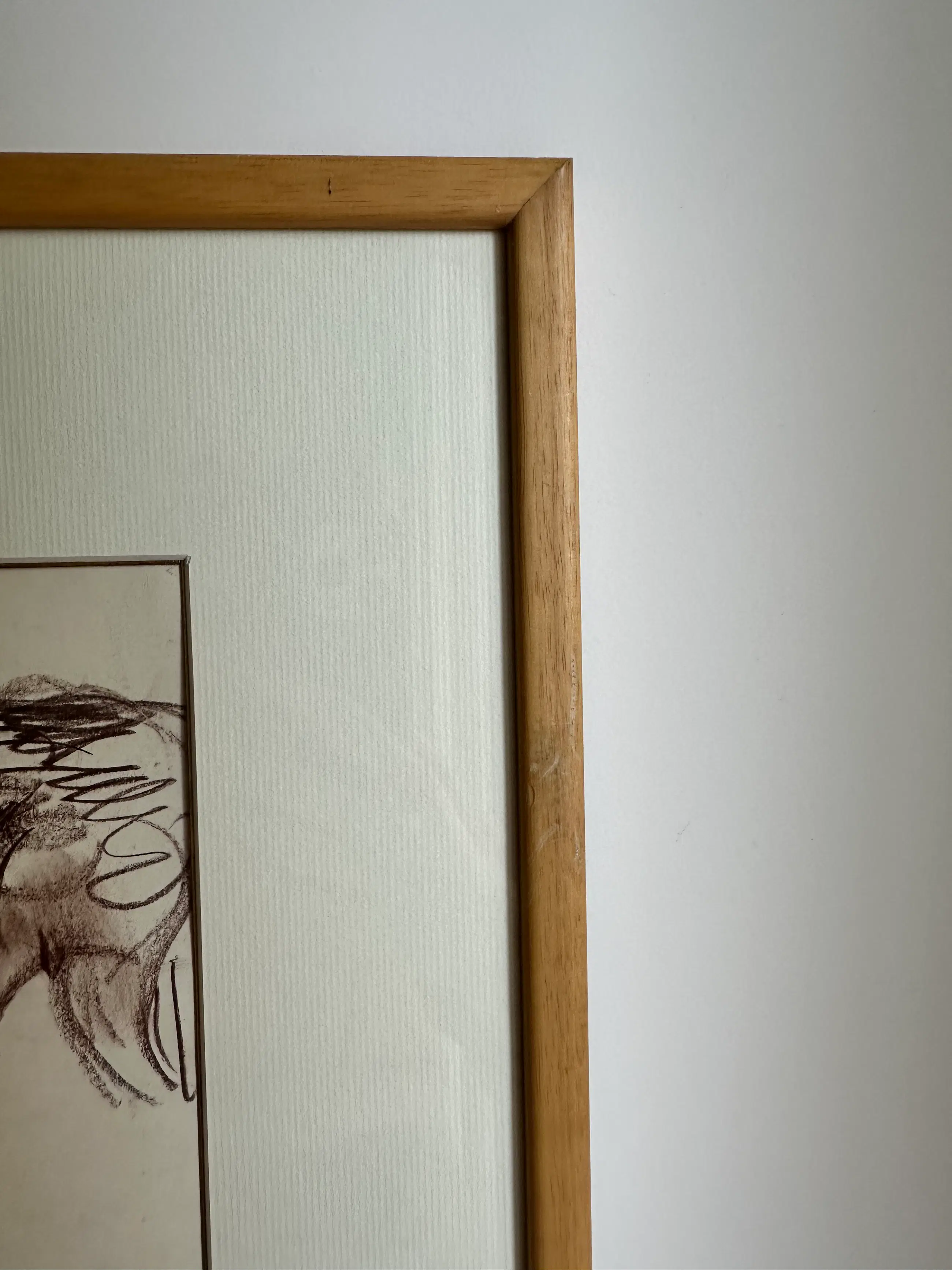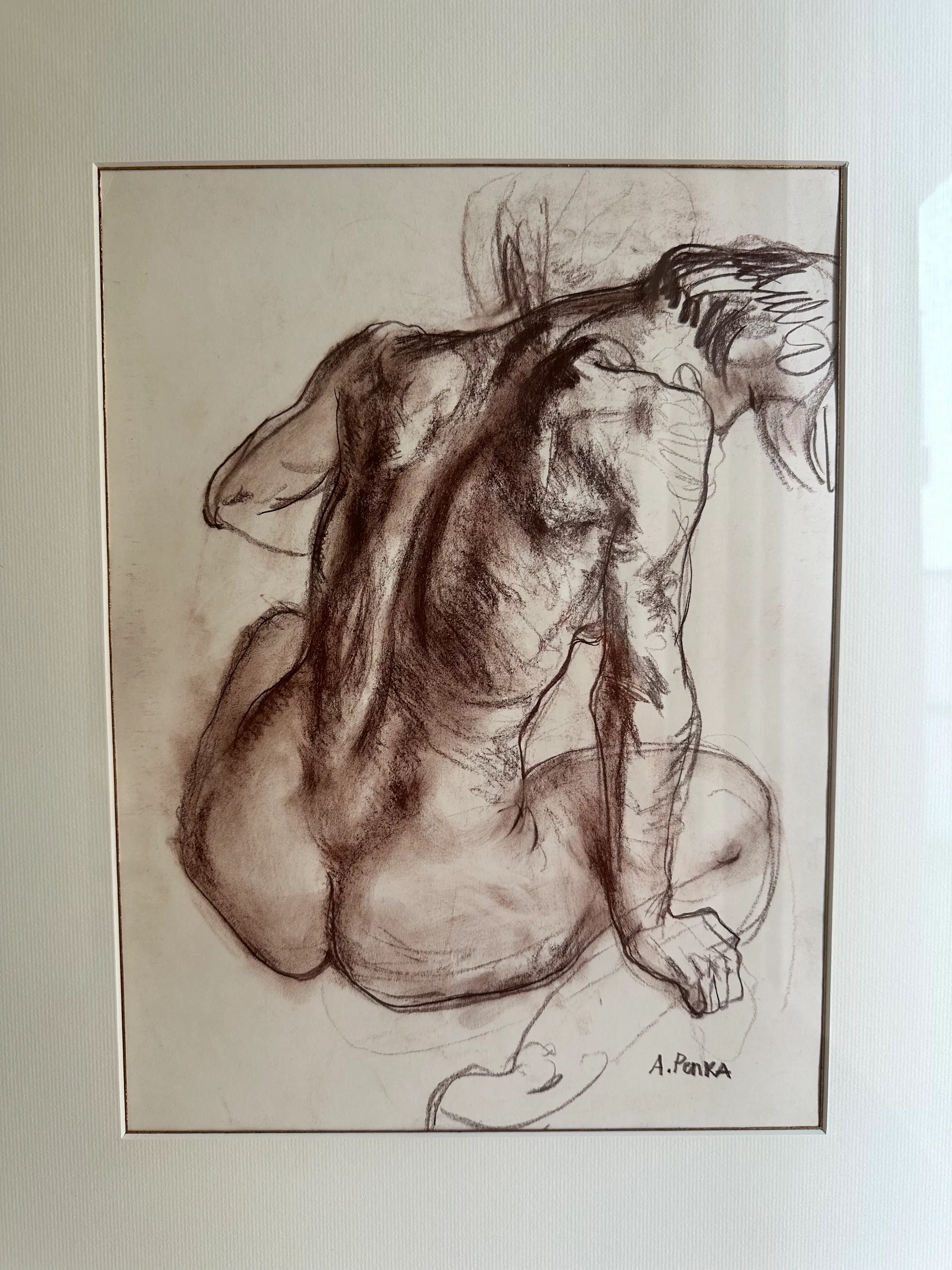 Expressieve schets van een rugaanzicht van een zittende vrouw, gevangen in een subtiele draaiing. Losse lijnen en zachte schaduwen benadrukken de vrouwelijke vormen en geven het werk een natuurlijke dynamiek. Warme sepia-tinten zorgen voor een tijdloze uitstraling.