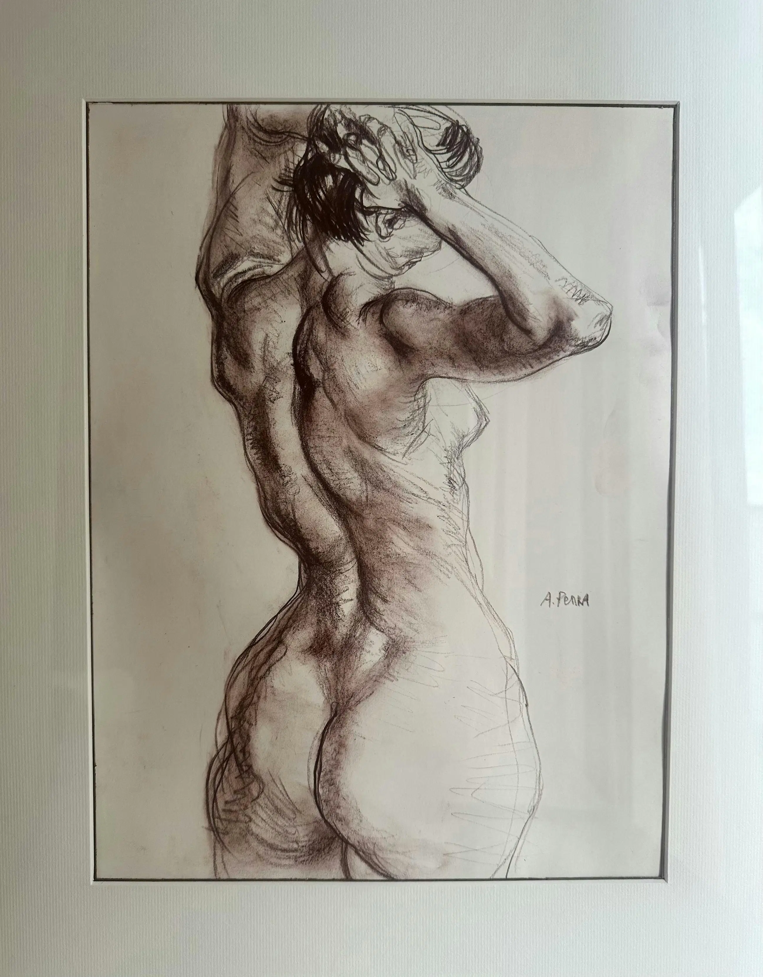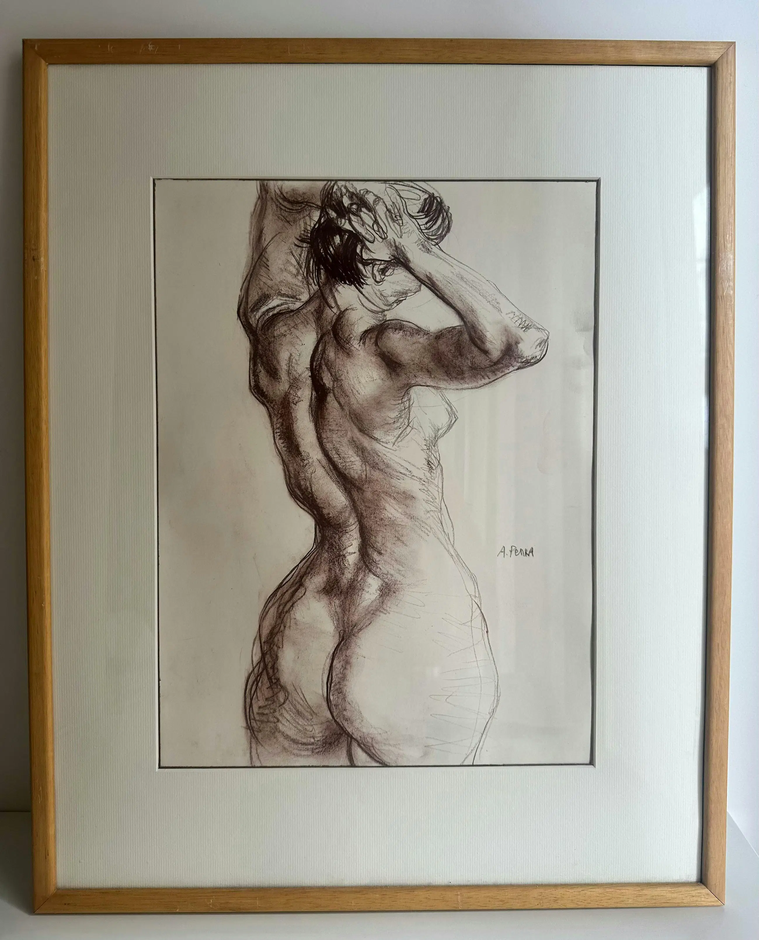 Dit handgetekende potloodschets is een subtiele viering van de vrouwelijke vorm en biedt een intieme en verfijnde blik op het model. Het maakt deel uit van een beperkte serie van schetsen die hetzelfde model vanuit verschillende hoeken toont, wat het een unieke meerwaarde geeft voor elke kunstverzameling.
