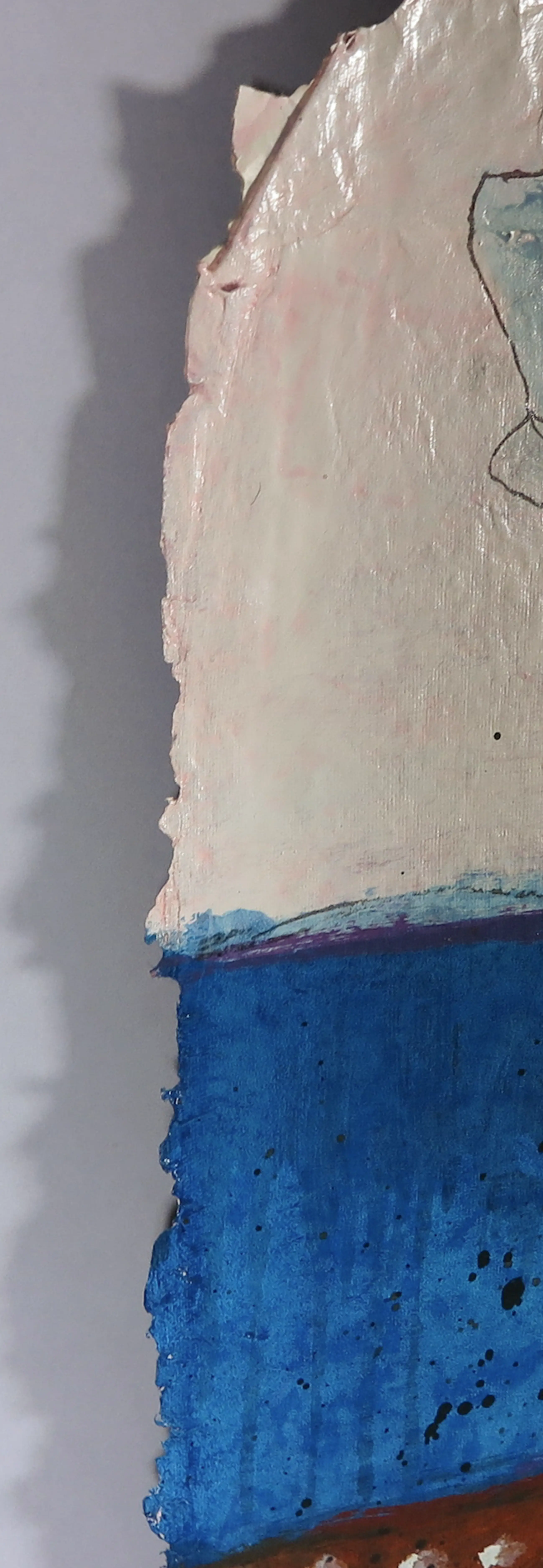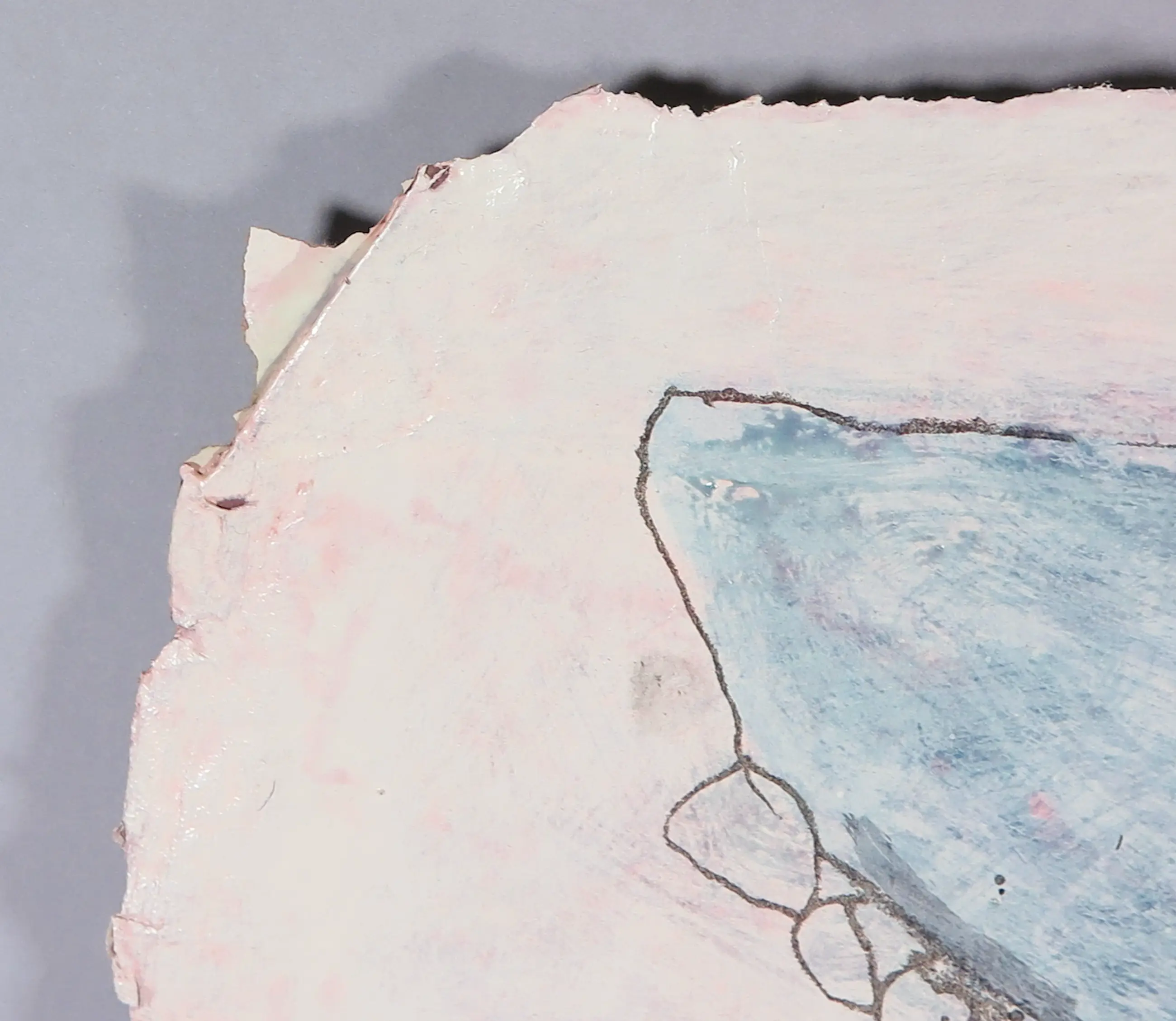 | Enkele slijtagesporen aan de randen van de zeefdruk, zo is er rechts aan de bovenzijde een klein scheurtje te zien. Onduidelijk of dit een beschadiging is of dat dit bij het robuuste karakter van het papier behoort. Enkele hoeken zijn wat minimaal gevouwen. | |