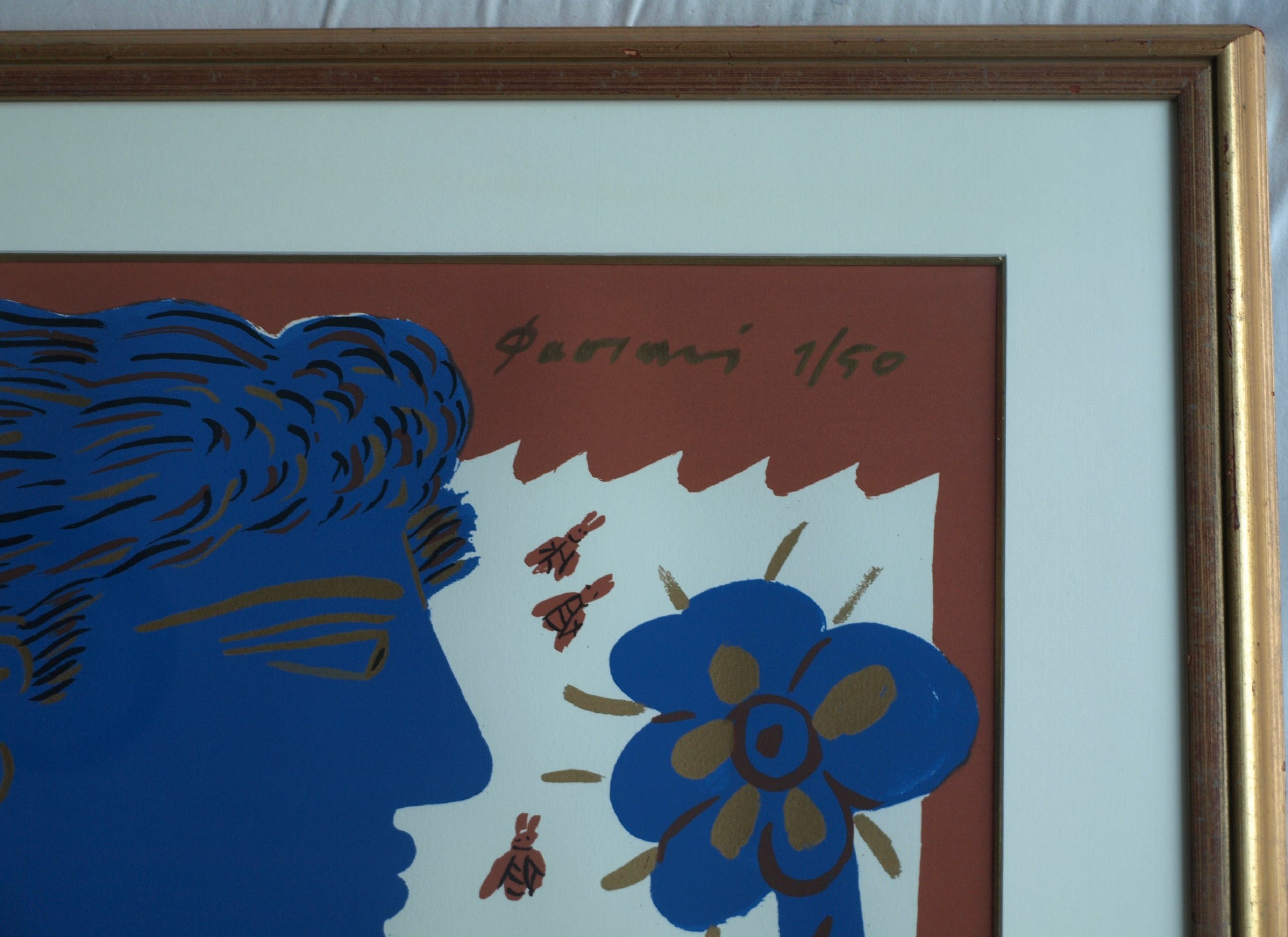Een werk van de Griekse kunstenaar Alekos Fassianos (1935), ook bekend onder de naamvarianten Alexandre Fassianos en Alecos Fassianos. -Handgesigneerd en - genummerd met stift rechtsboven in het werk. Nr. 1 van 50. -Jaartal onbekend. Waarschijnlijk ca. 1985. -Ingelijst in de originele houten lijst met passe-partout en glasplaat. -Afmetingen: Lijst, 71,5 x 62,5 cm. Beeld, ca. 49 x 41,5 cm. -Herkomst: Uit de inboedel van een kunstverzamelaar. -Conditie: De litho is in zeer goede staat. De lijst heeft slijtplekjes. Zie ook de foto’s. Kan zo aan de muur.