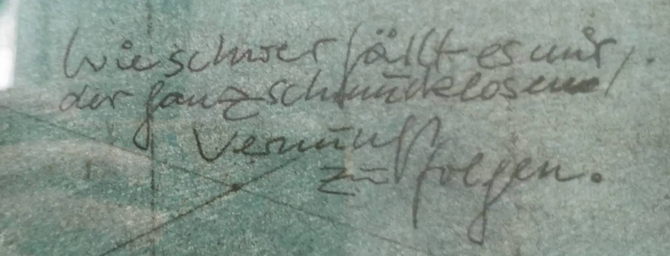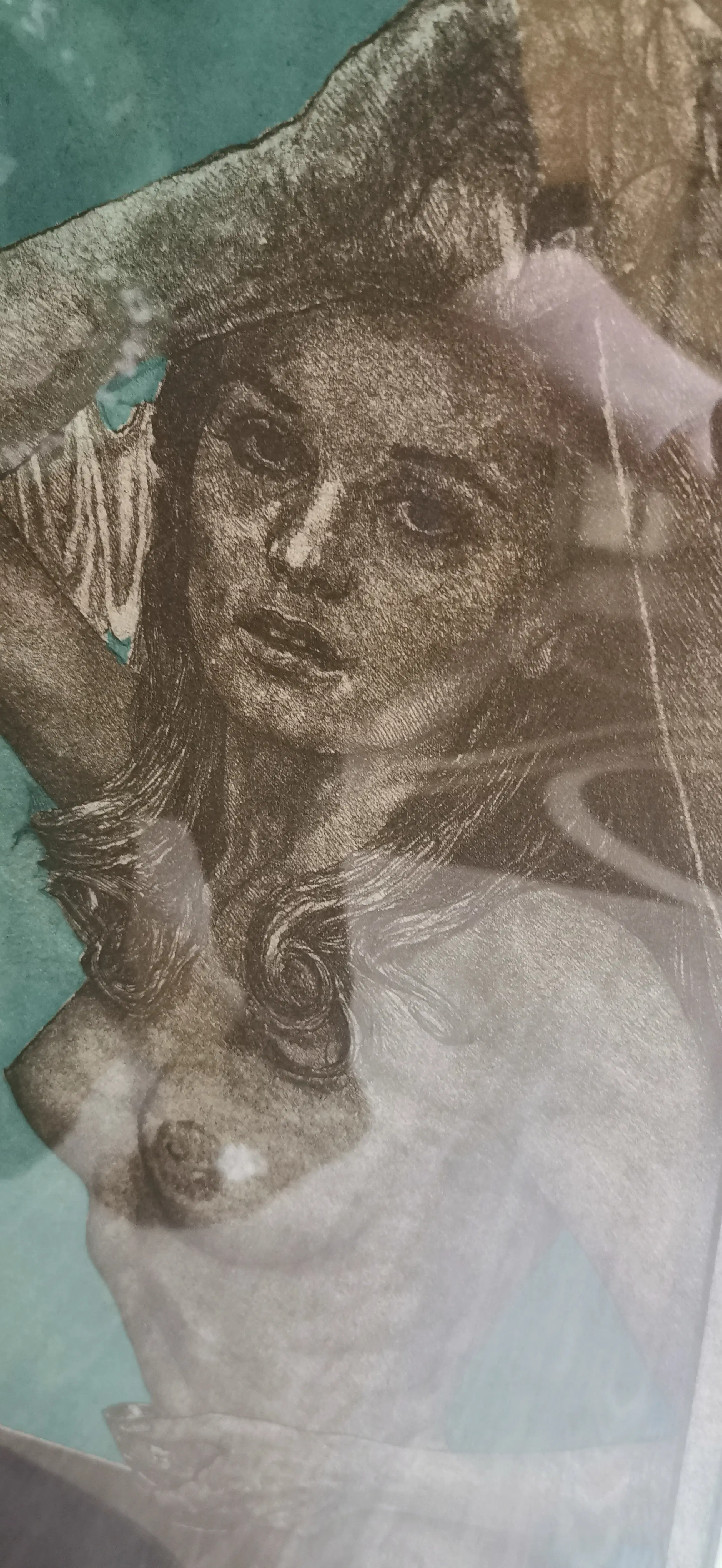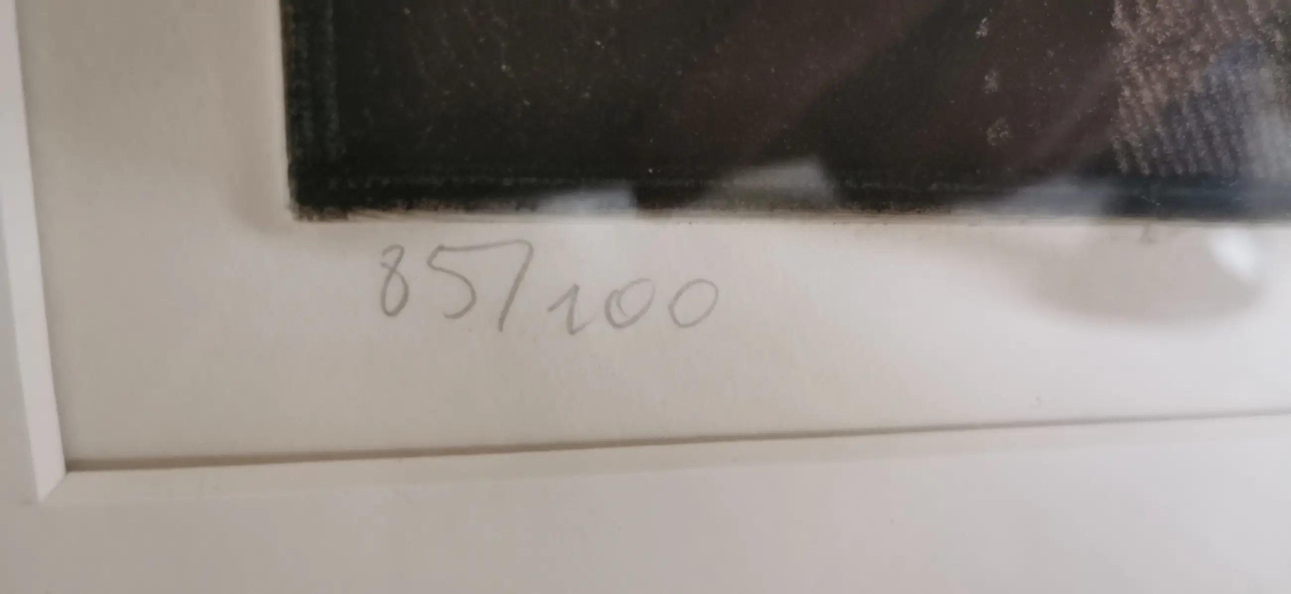 Handgesigneerd vel 85/100 met spiegelinscriptie "Hoe moeilijk is het voor mij om de volledig onopgesmukte reden te volgen." Het zou een zelfportret kunnen zijn (zie man op de voorgrond). Het is erg moeilijk om een goede foto te maken vanwege de reflectie van het glas. Ik hoop dat je het geweldige onderwerp kunt zien!