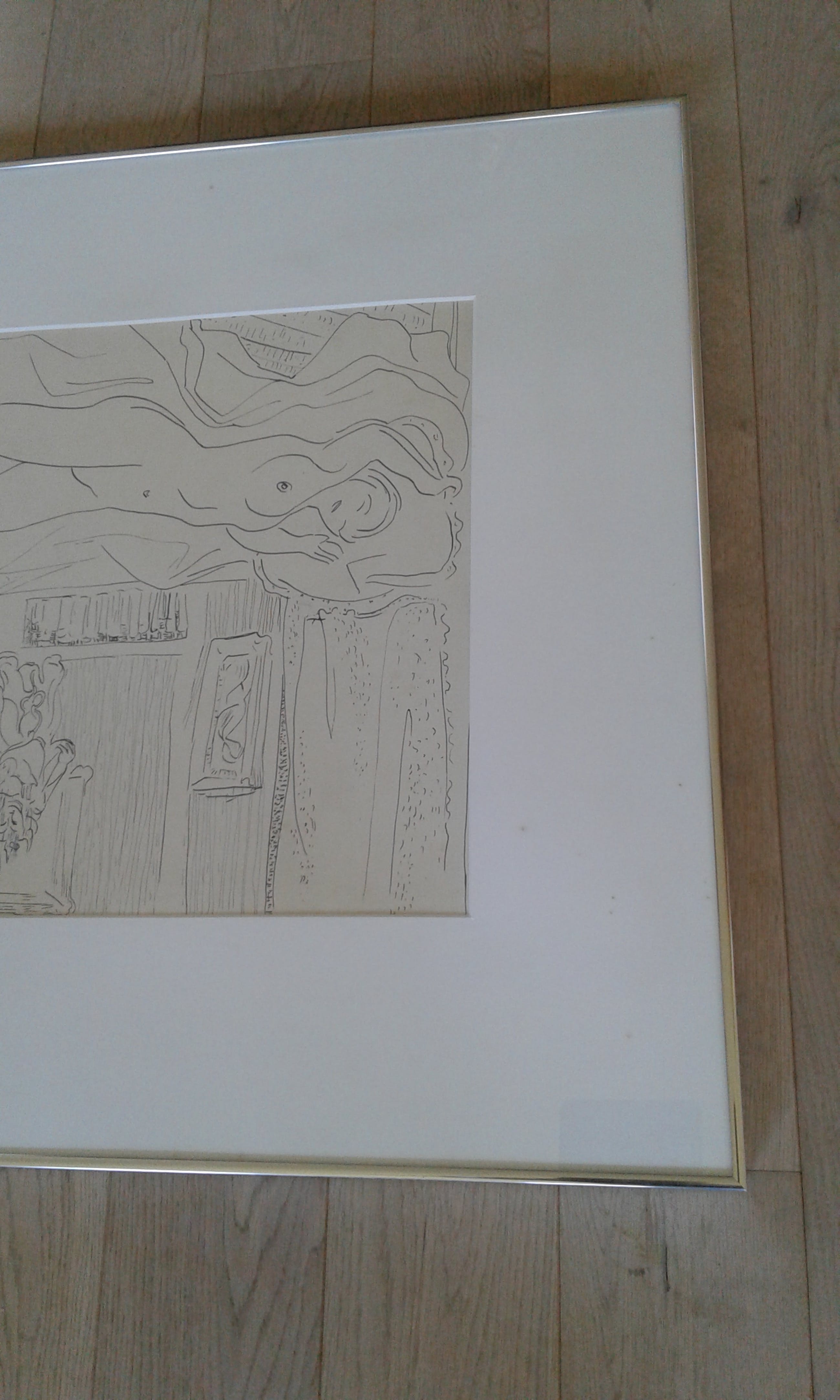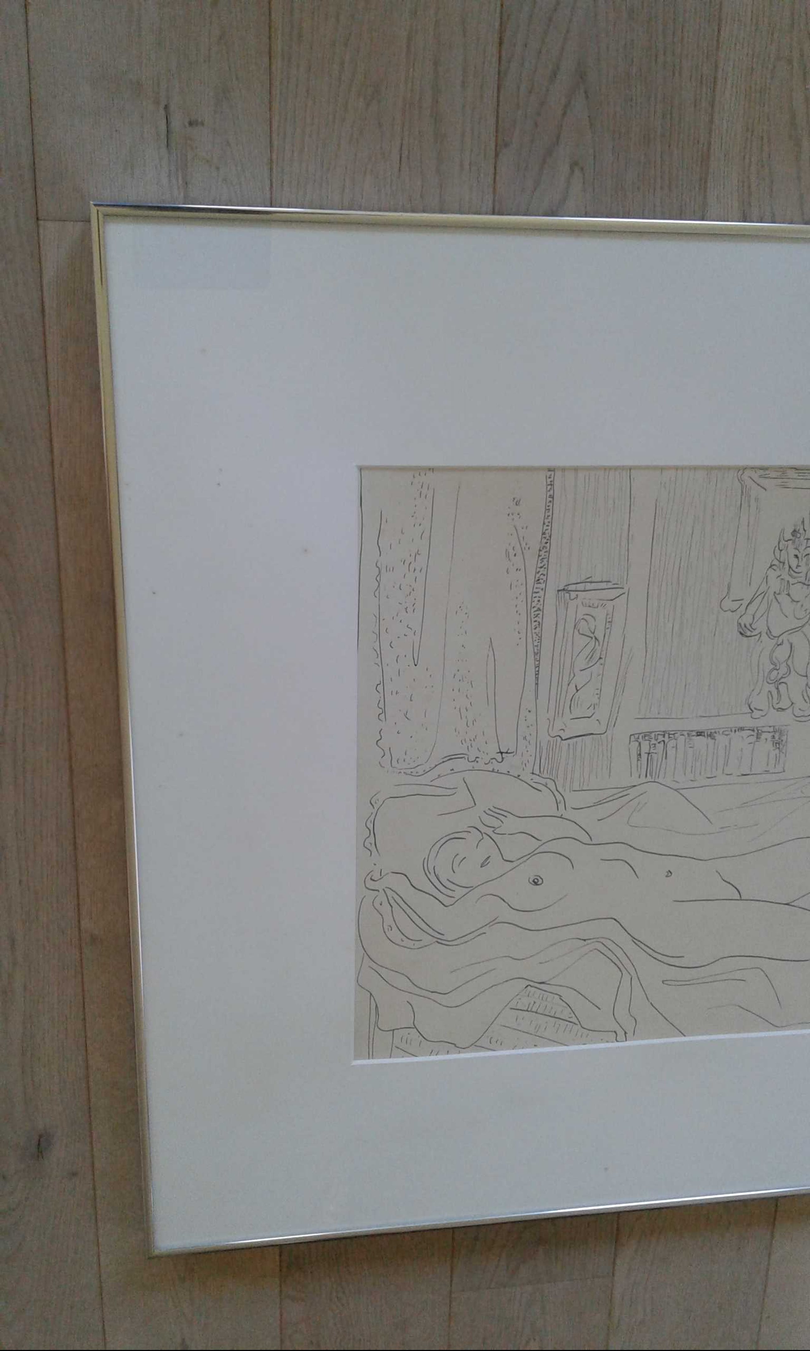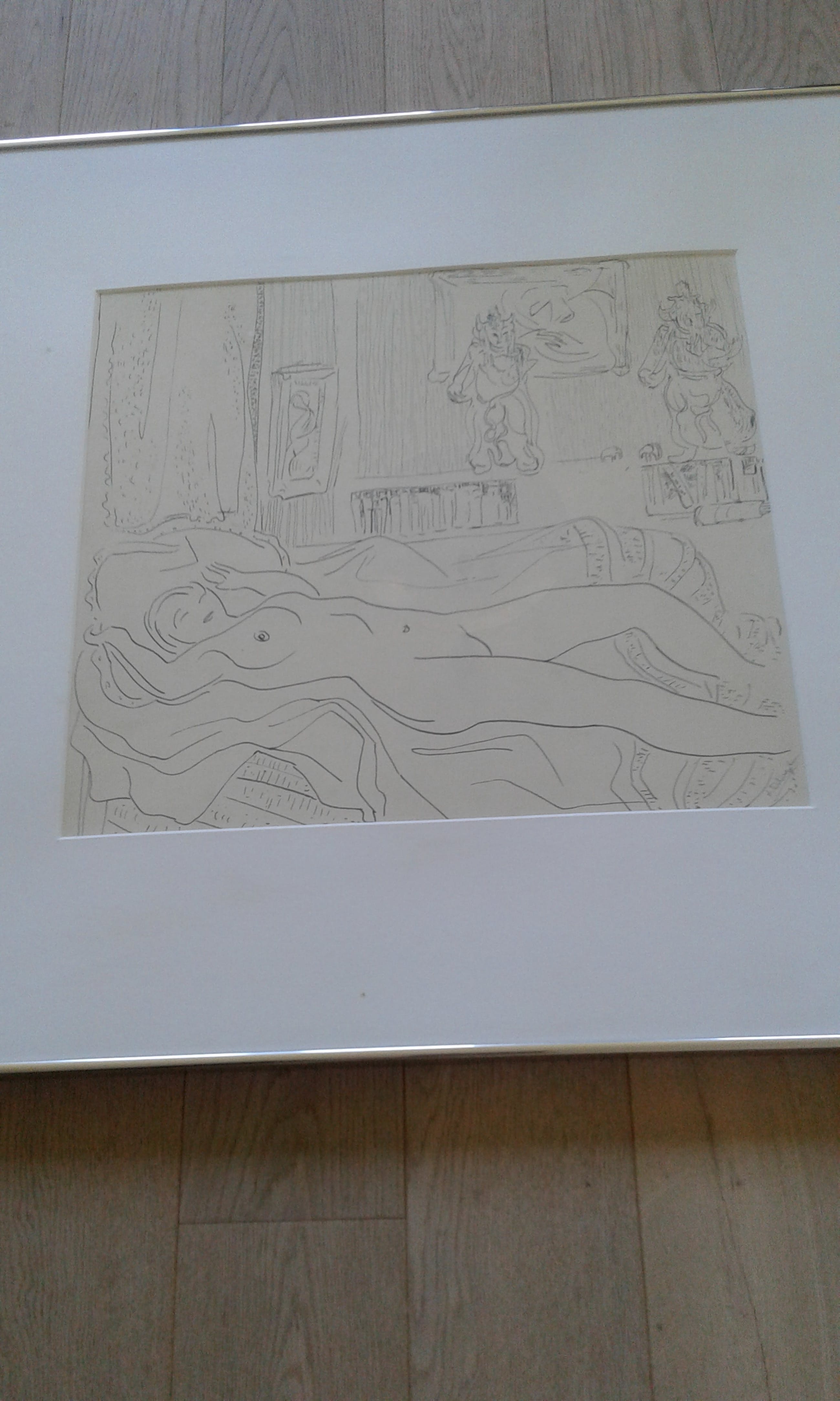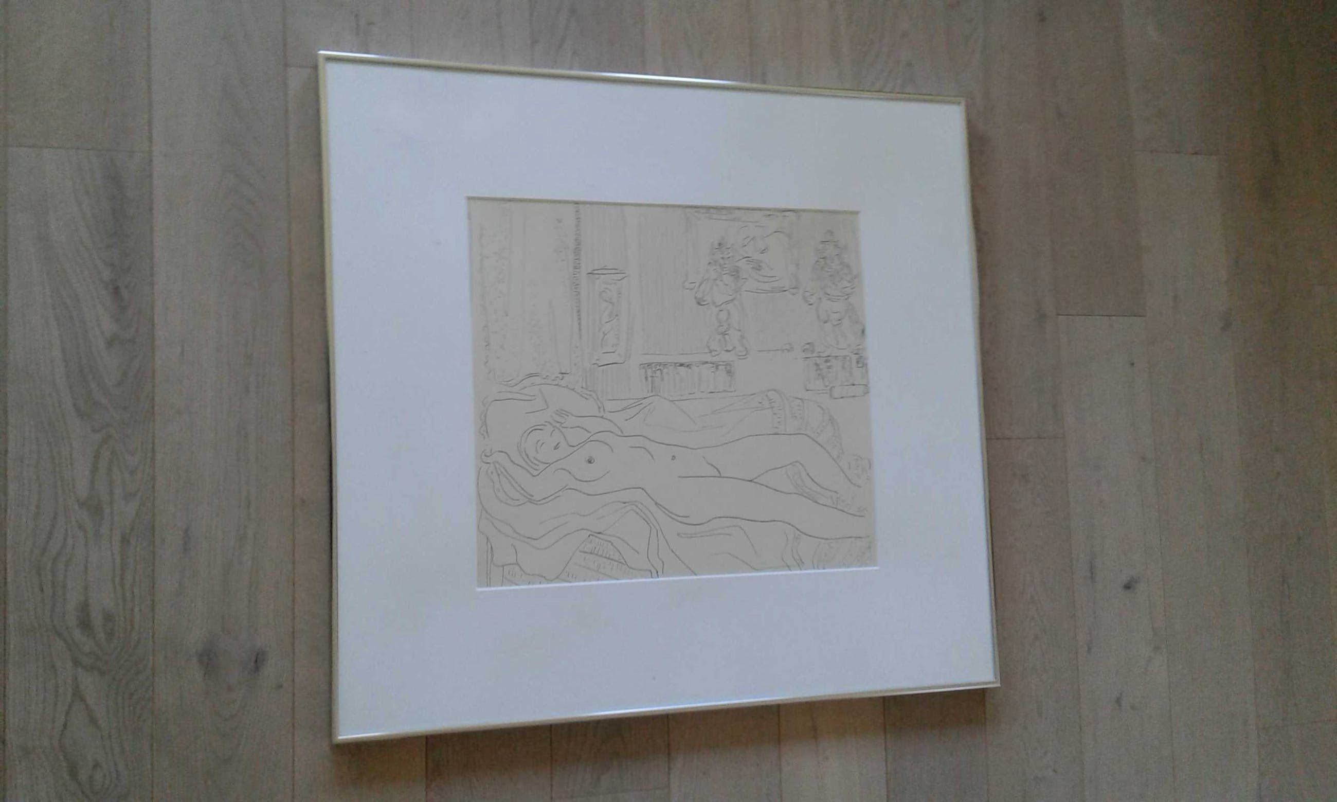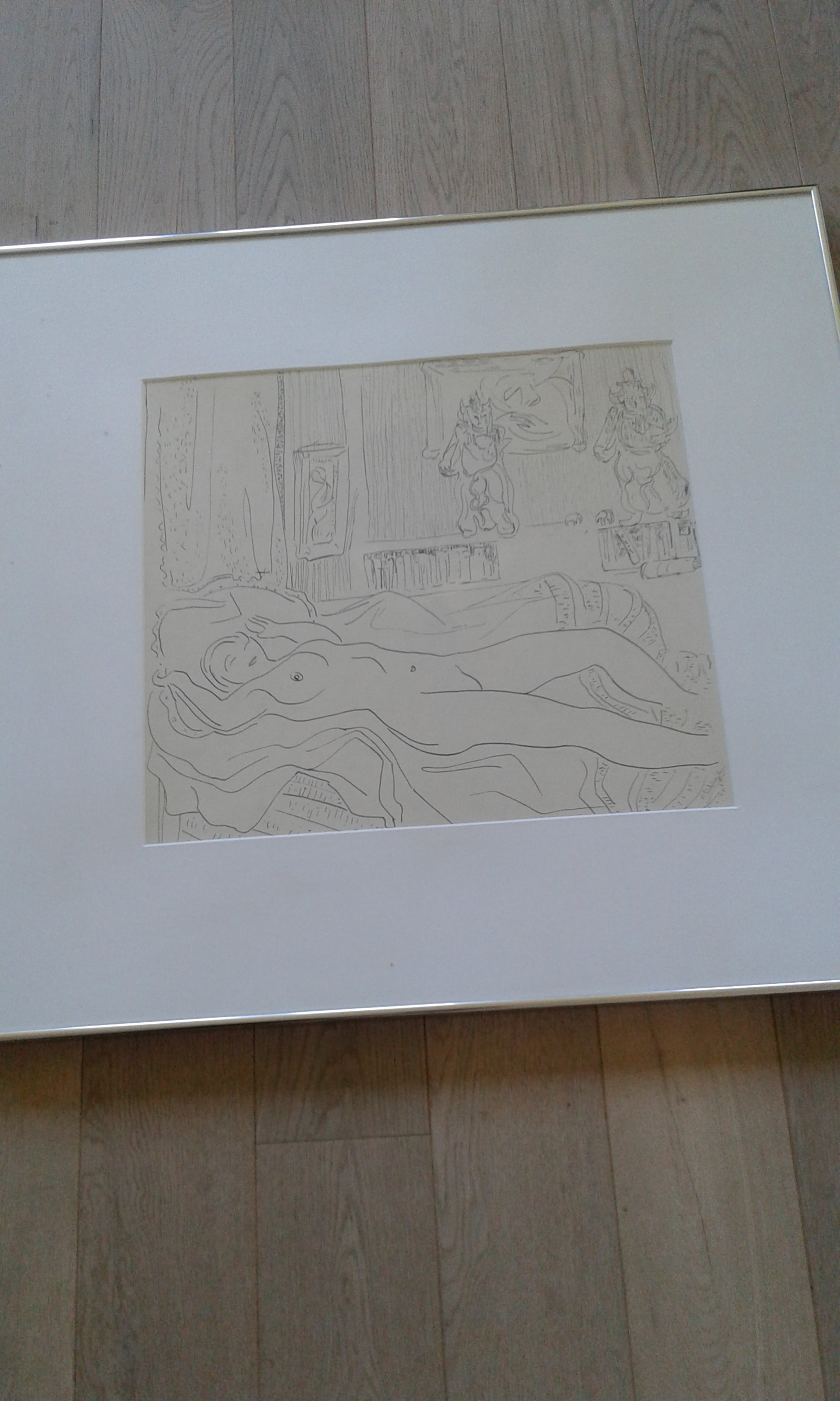 Is kwalitatief ingelijst met brede passe-partout en ophang door Schleiper, etiket achteraan.