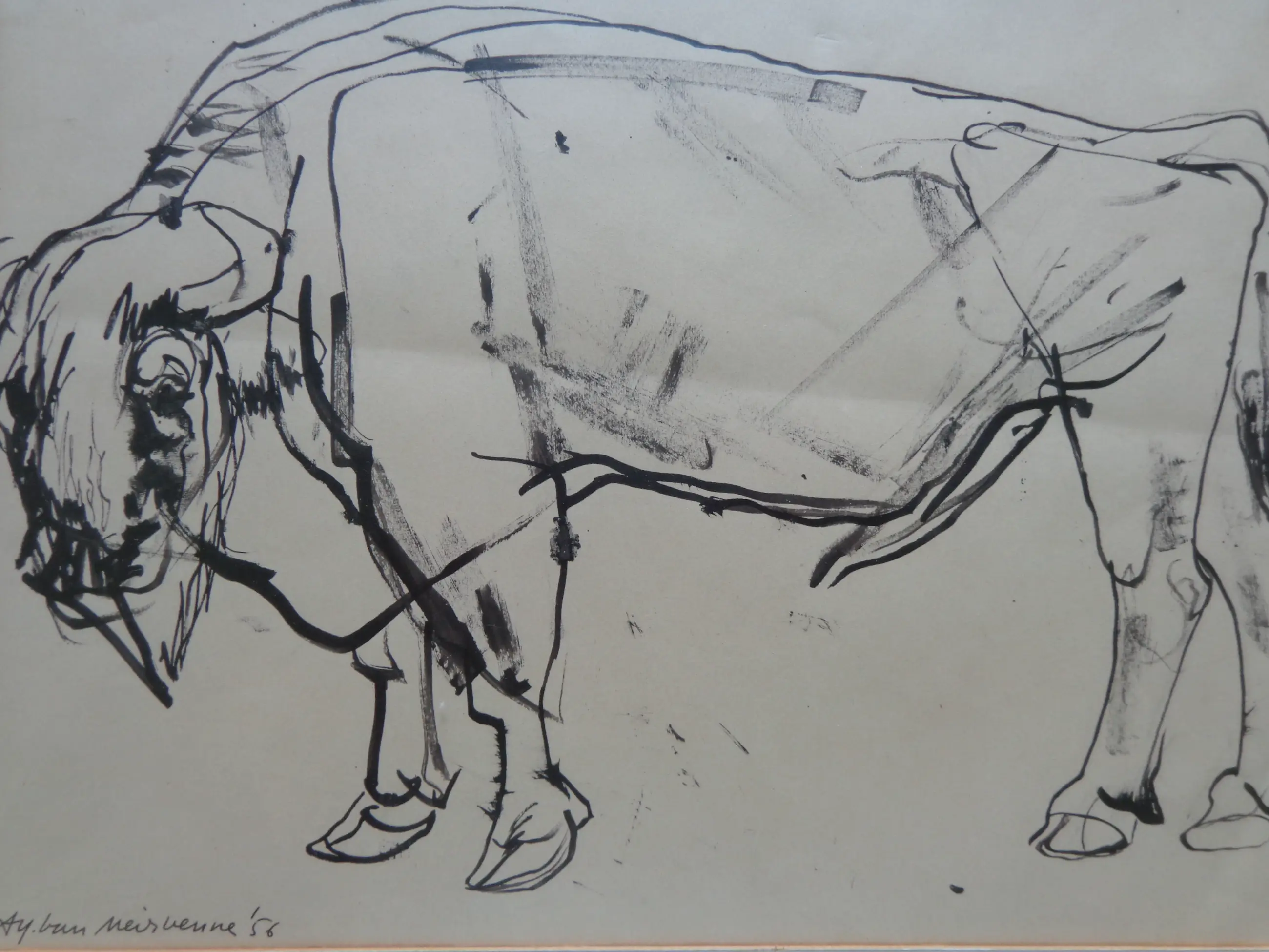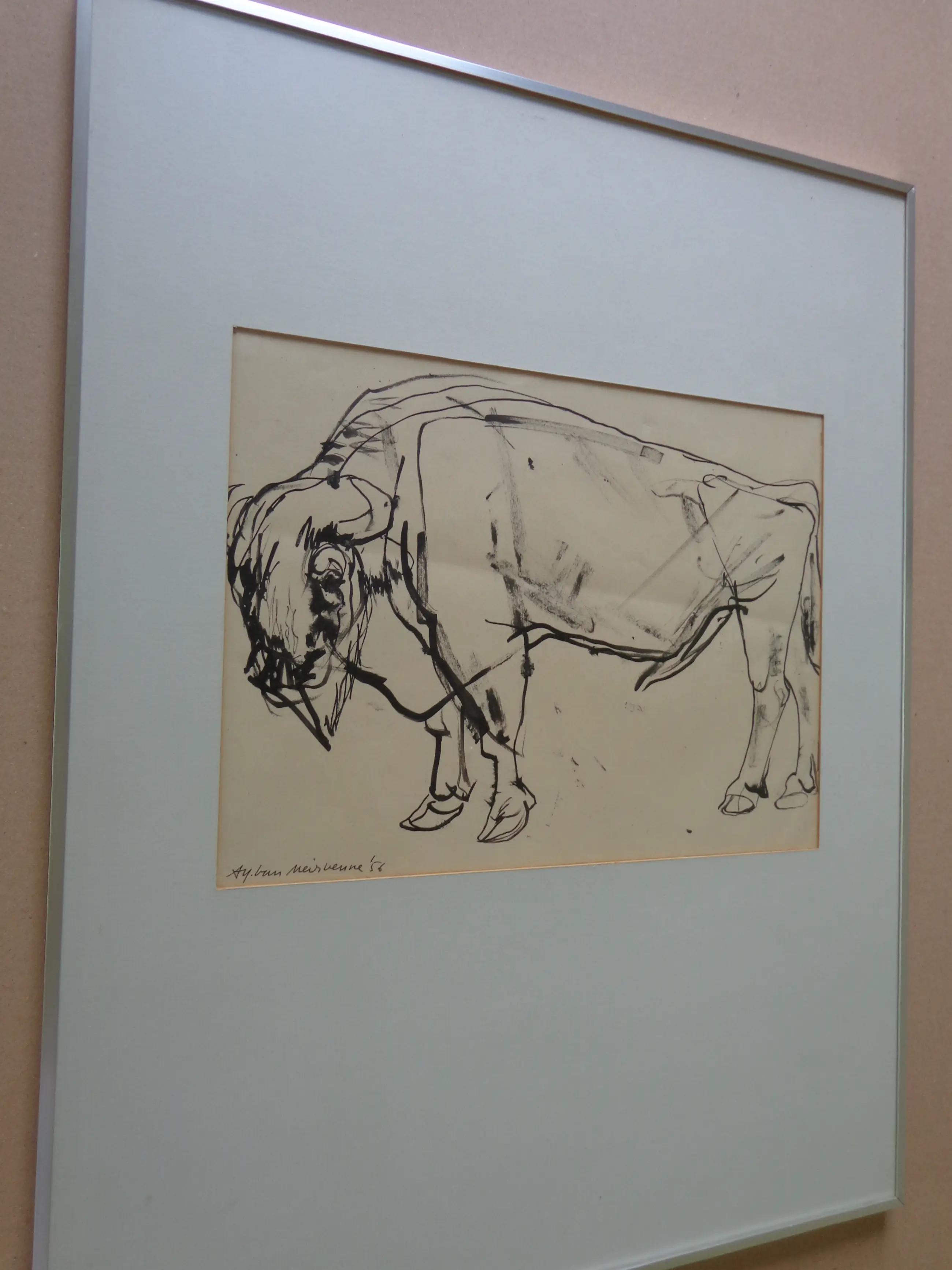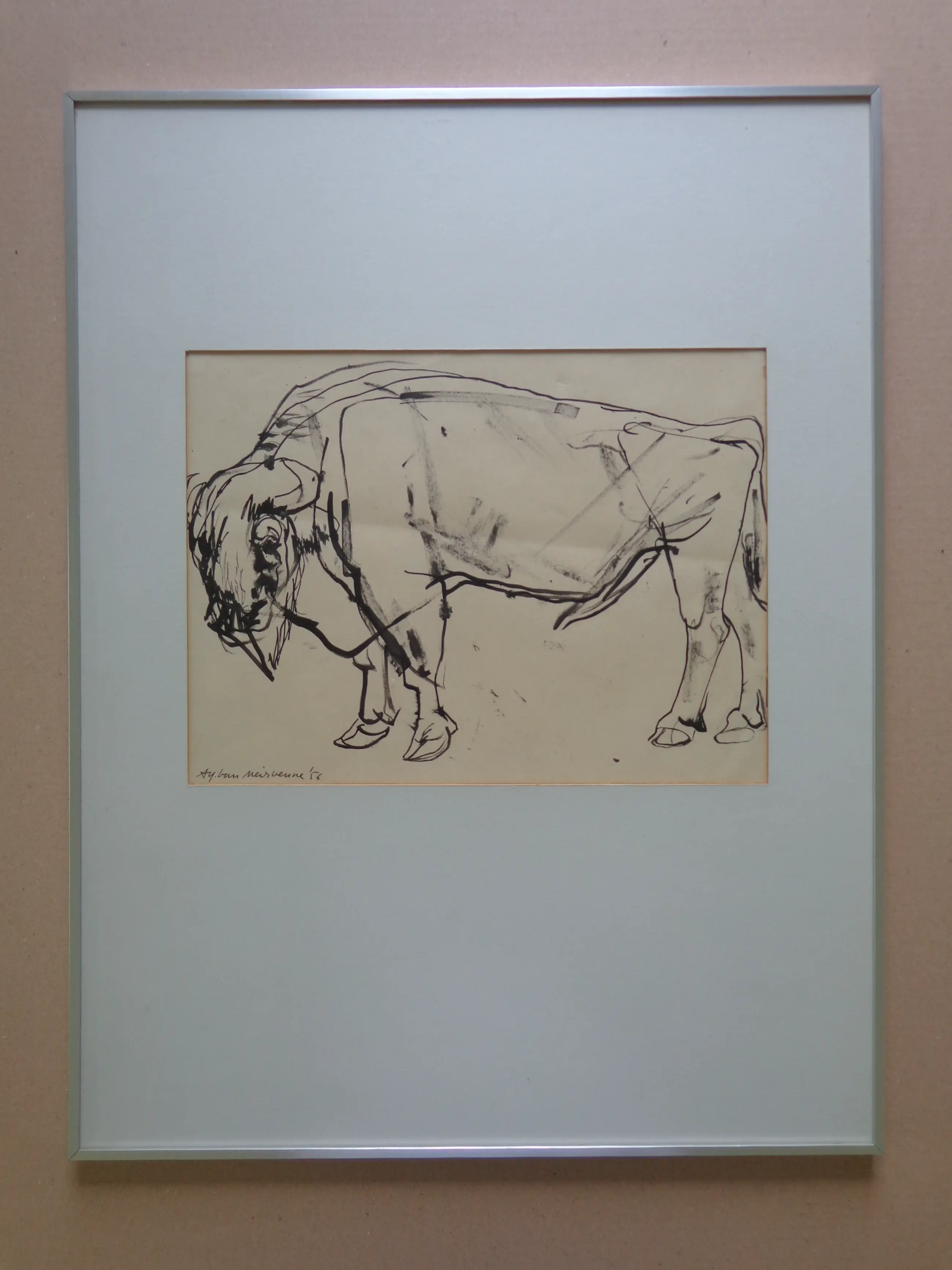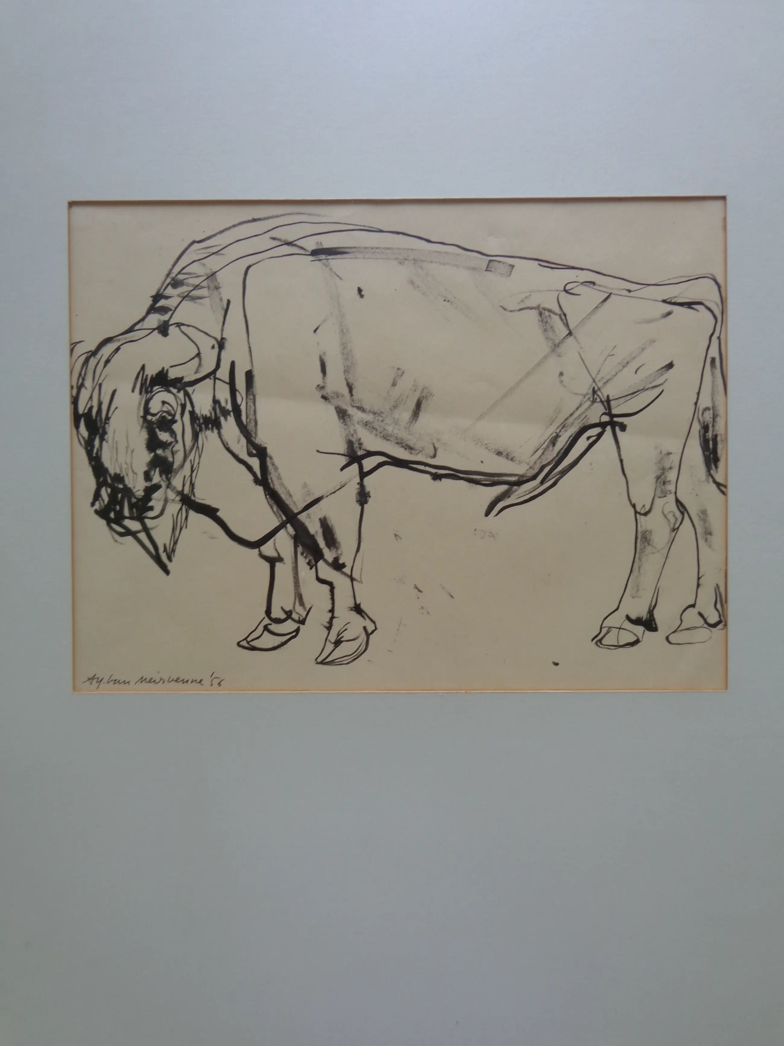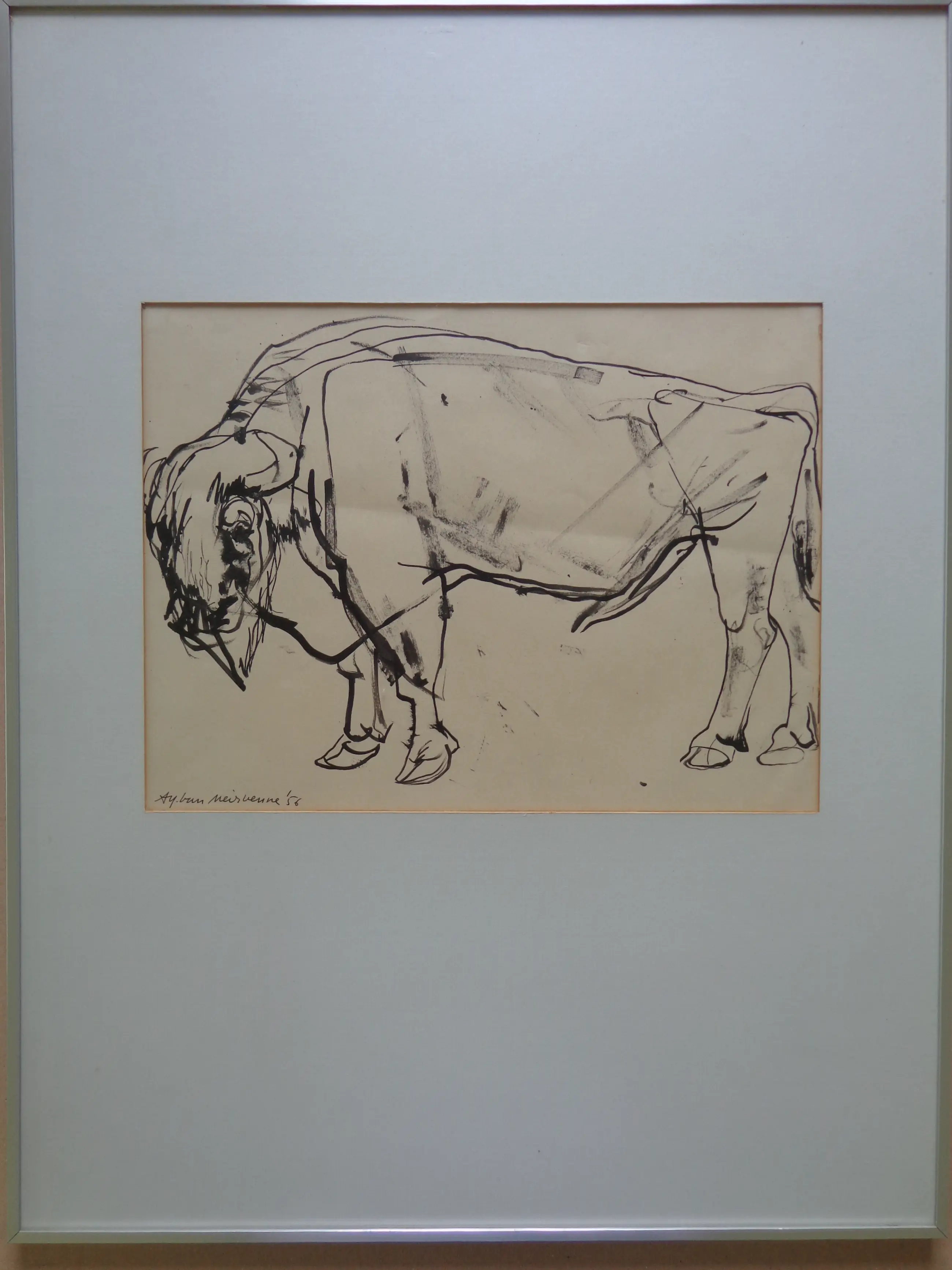 Alfons Van Meirvenne (°1932). Bizon. Origineel werk van inkt op papier. Gesigneerd met inkt. 1956. Goede staat. Horizontale vouw. Werk: 26x34cm. Kader: 63x48cm.