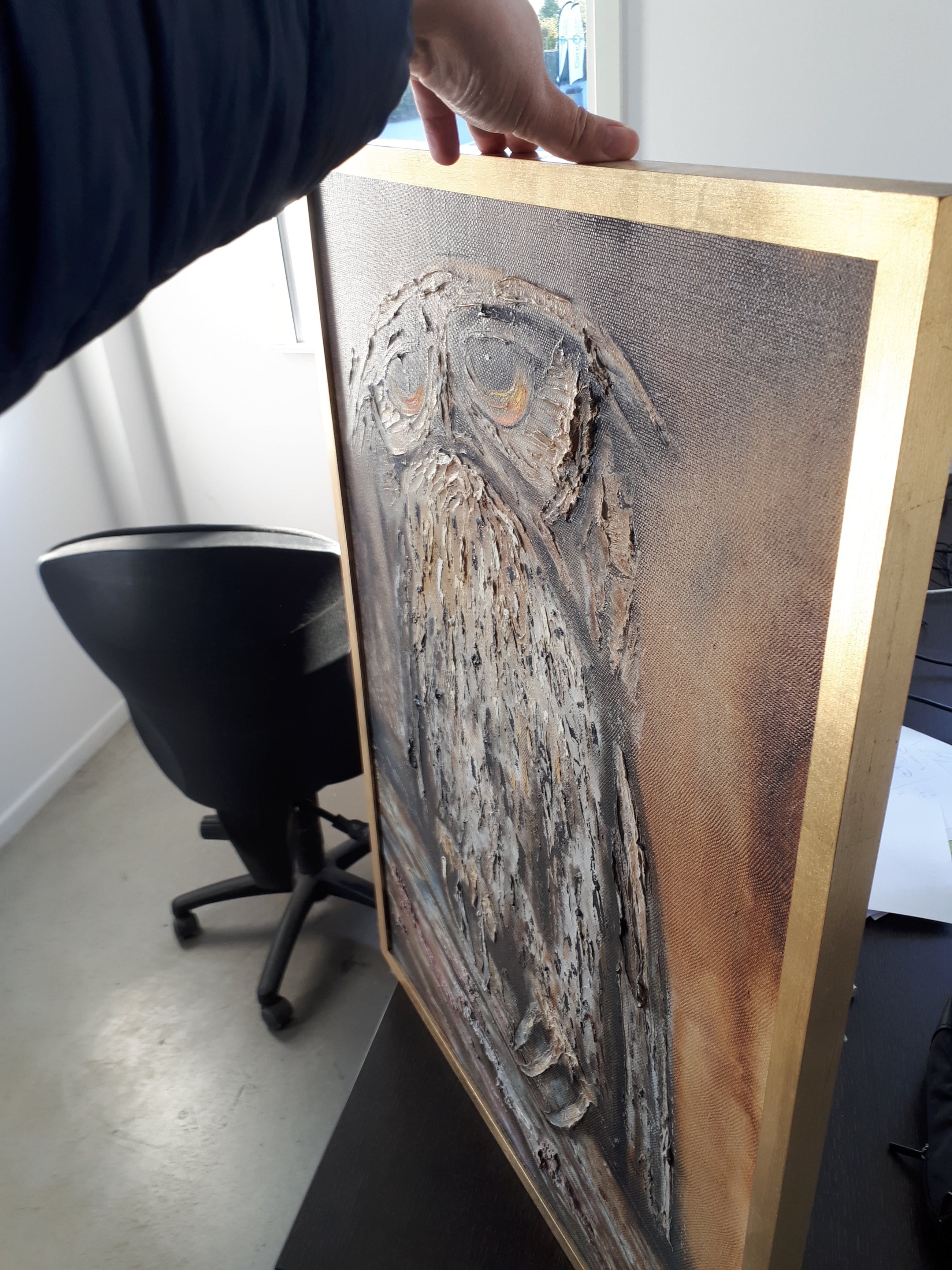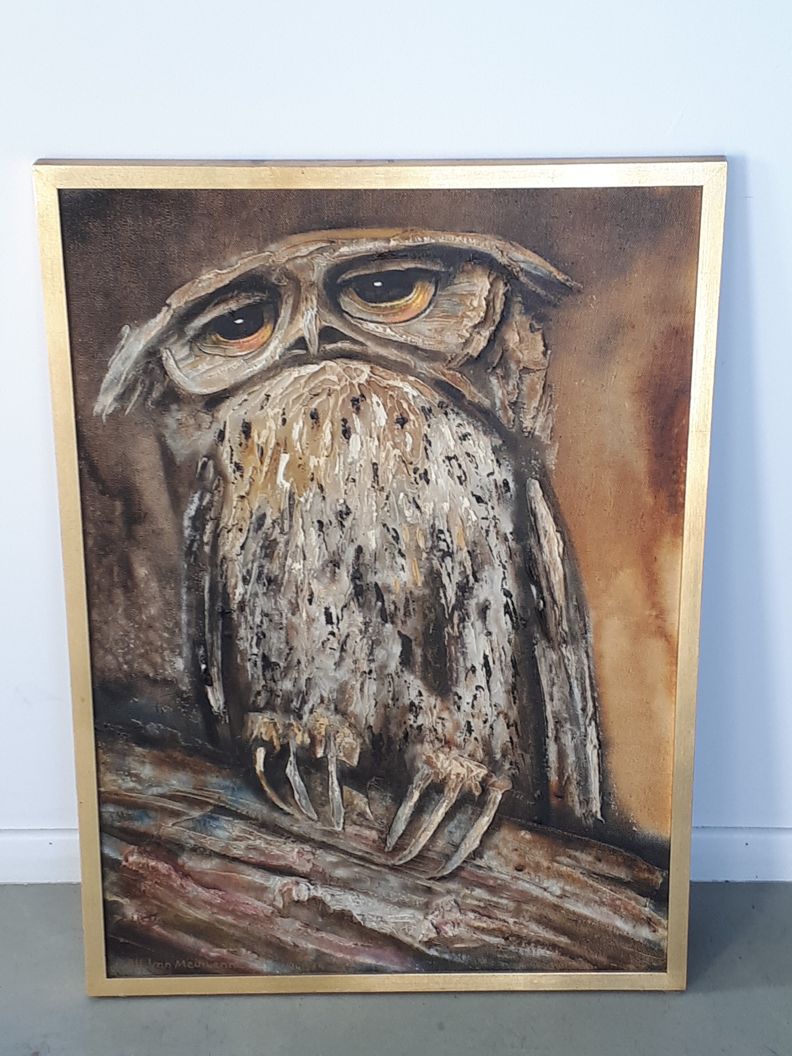 Sfeervol en rustgevend werk een gerenommeerd schilder die zijn vak tot in de puntjes beheerste. Het schilderij heeft alle potentieel om een échte eyecatcher te worden in uw interieur. Op sommige plaatsen komt de verf echt uit het schilderij (zie ook derde foto) wat de echtheid van de uil vergroot.