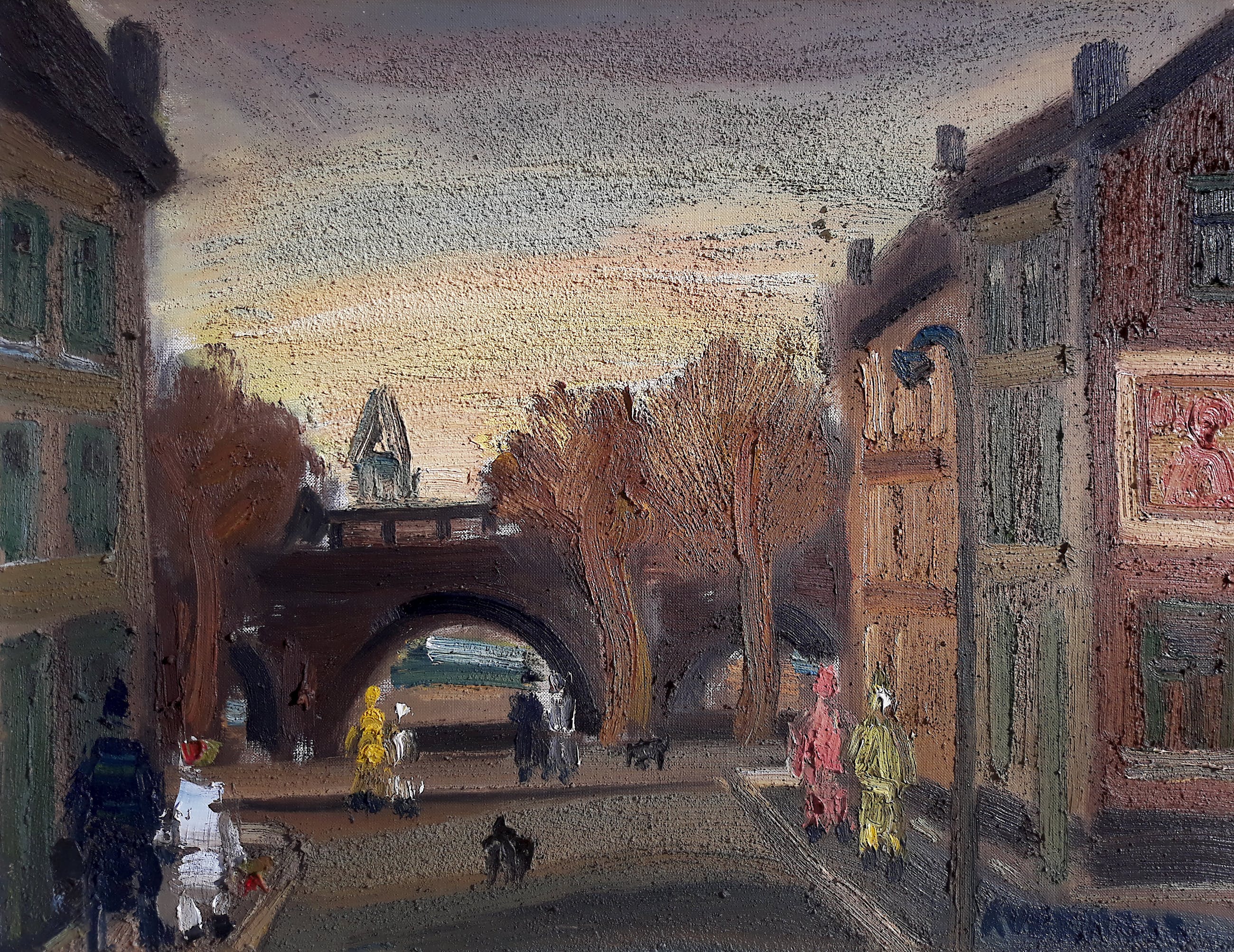 Mooi stadsgezicht door Alfons Vermeir, vermoedelijk Dendermonde of Antwerpen bij vallende avond. Olieverf op doek, gesigneerd rechtsonder, in verso atelierstempel (A Vermeir / Werkplaats / Antwerpen), in zeer nette lijst. Alles in zeer goede conditie.