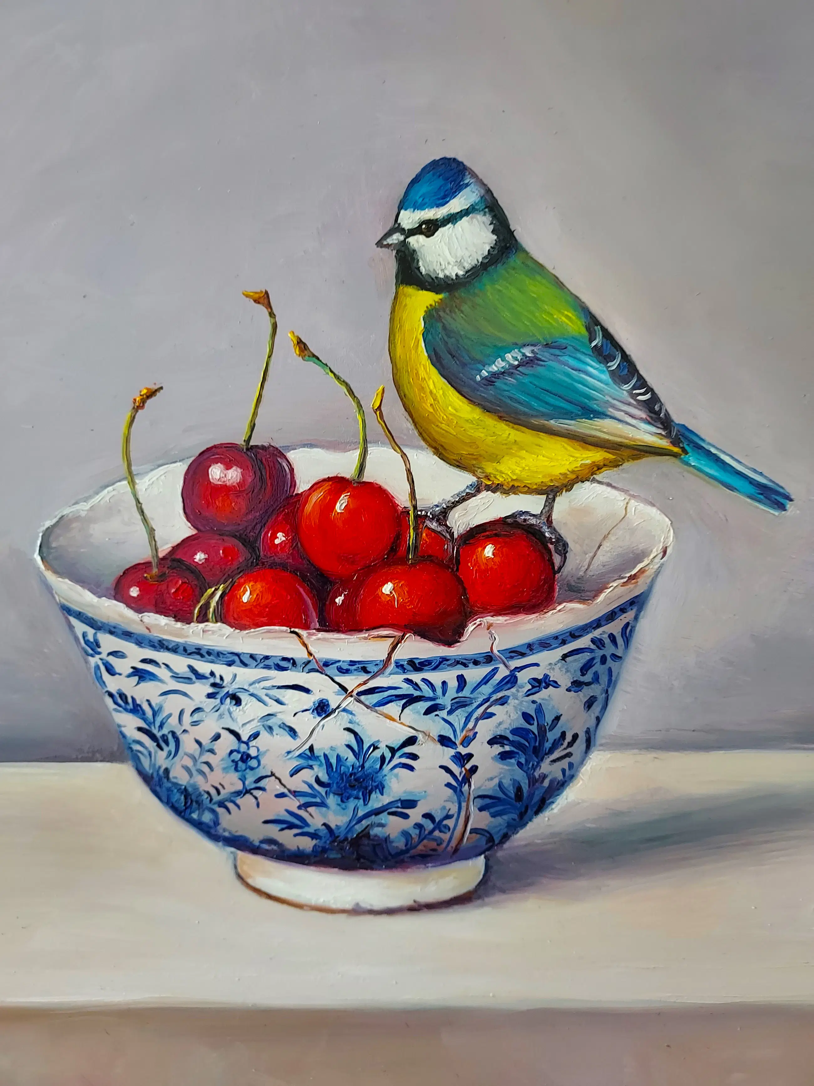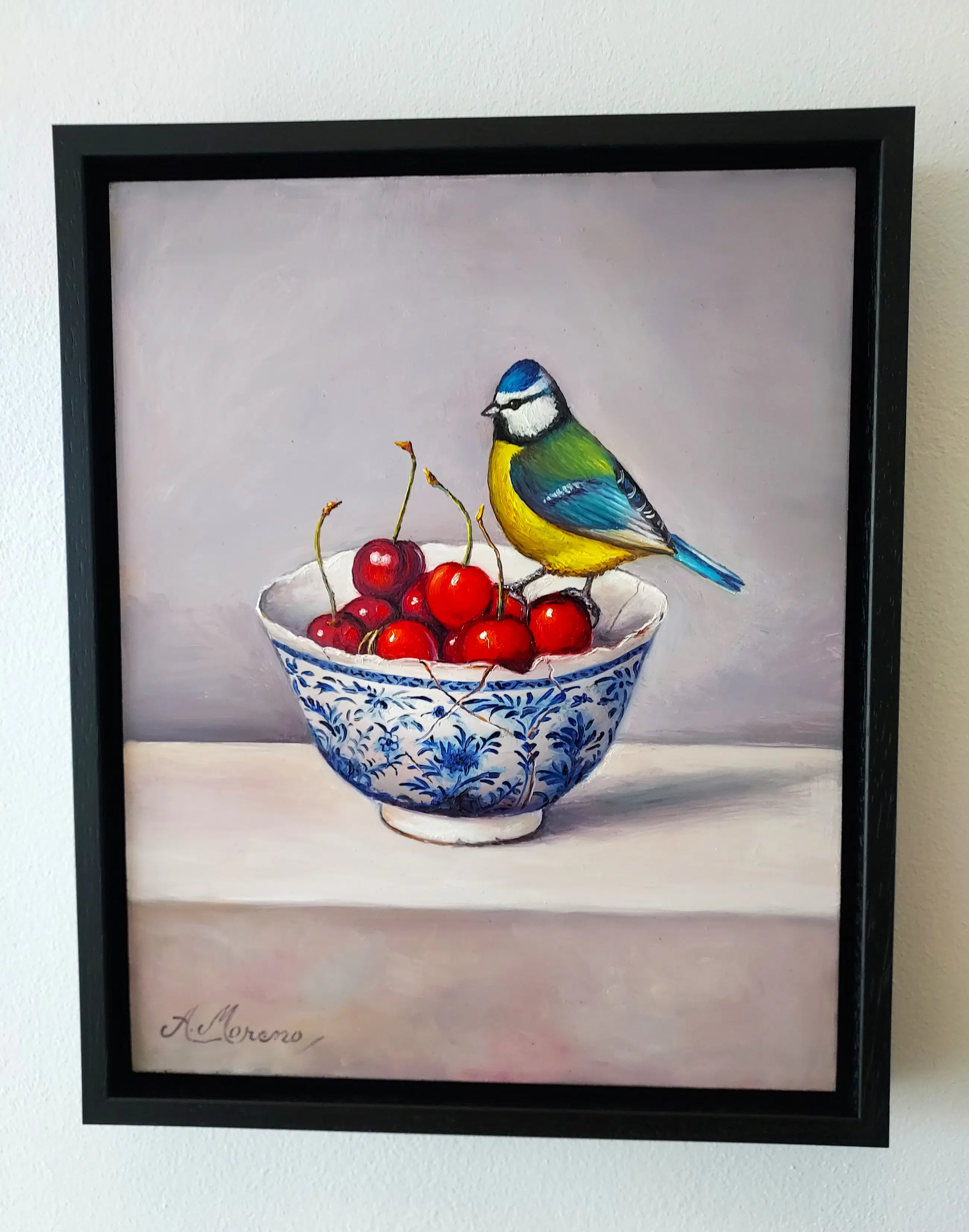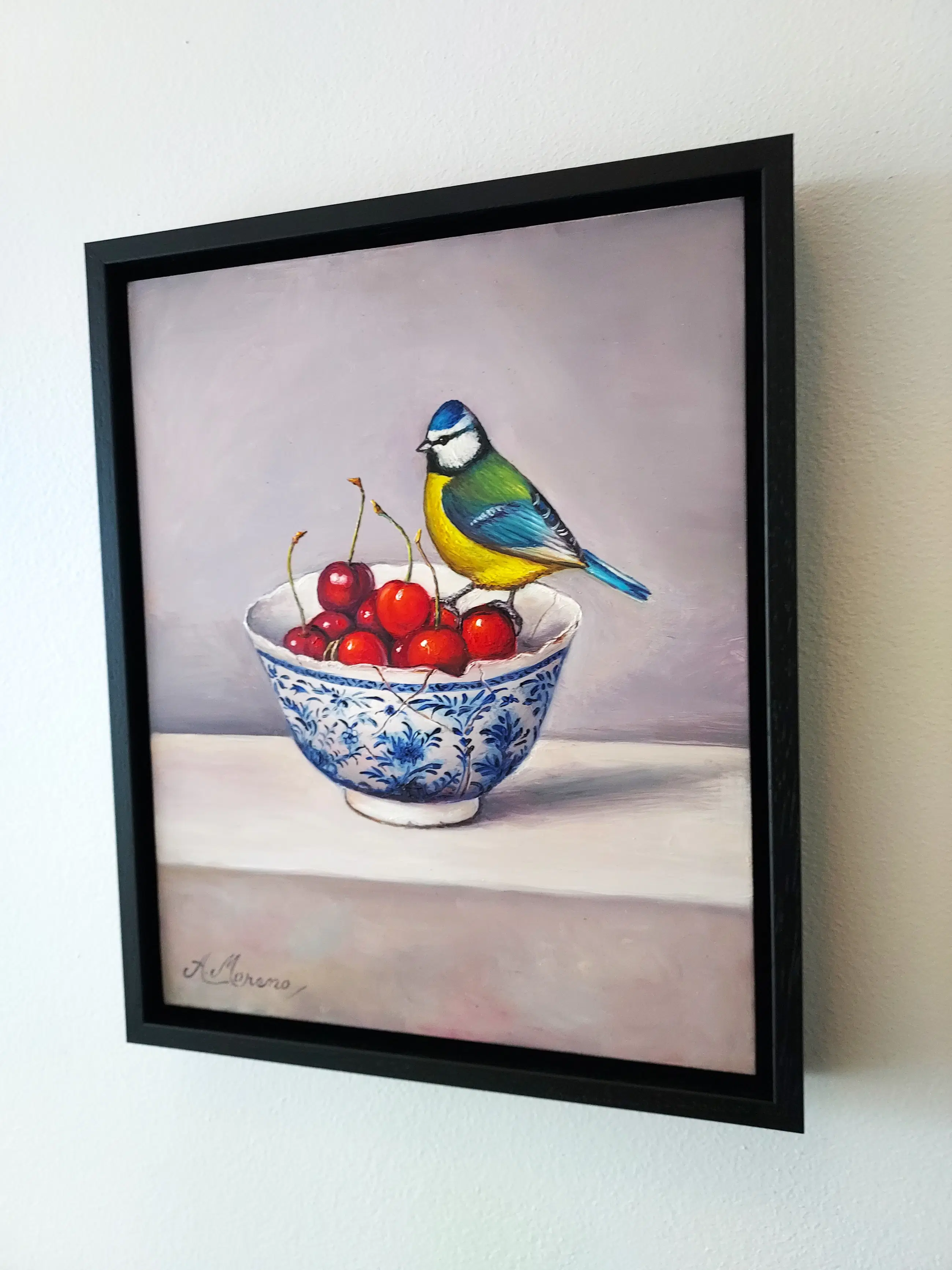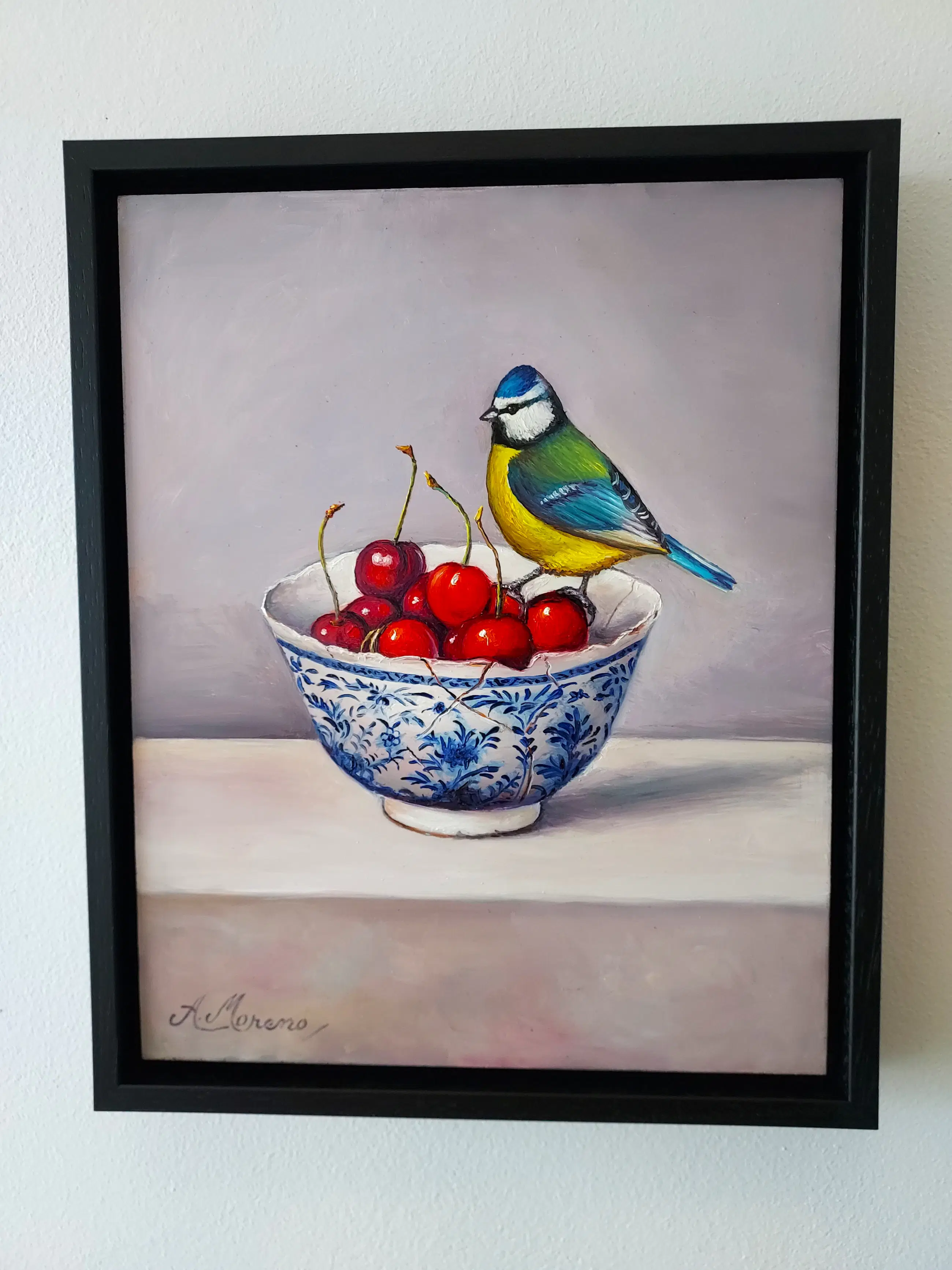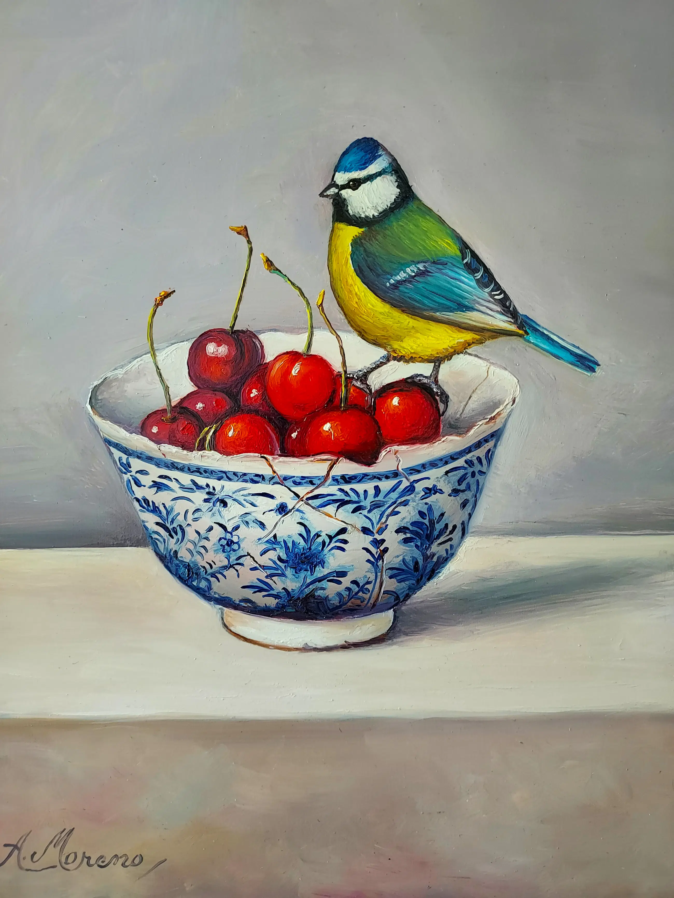 Alfonso Moreno - Stilleven met schaaltje kersen en pimpelmees