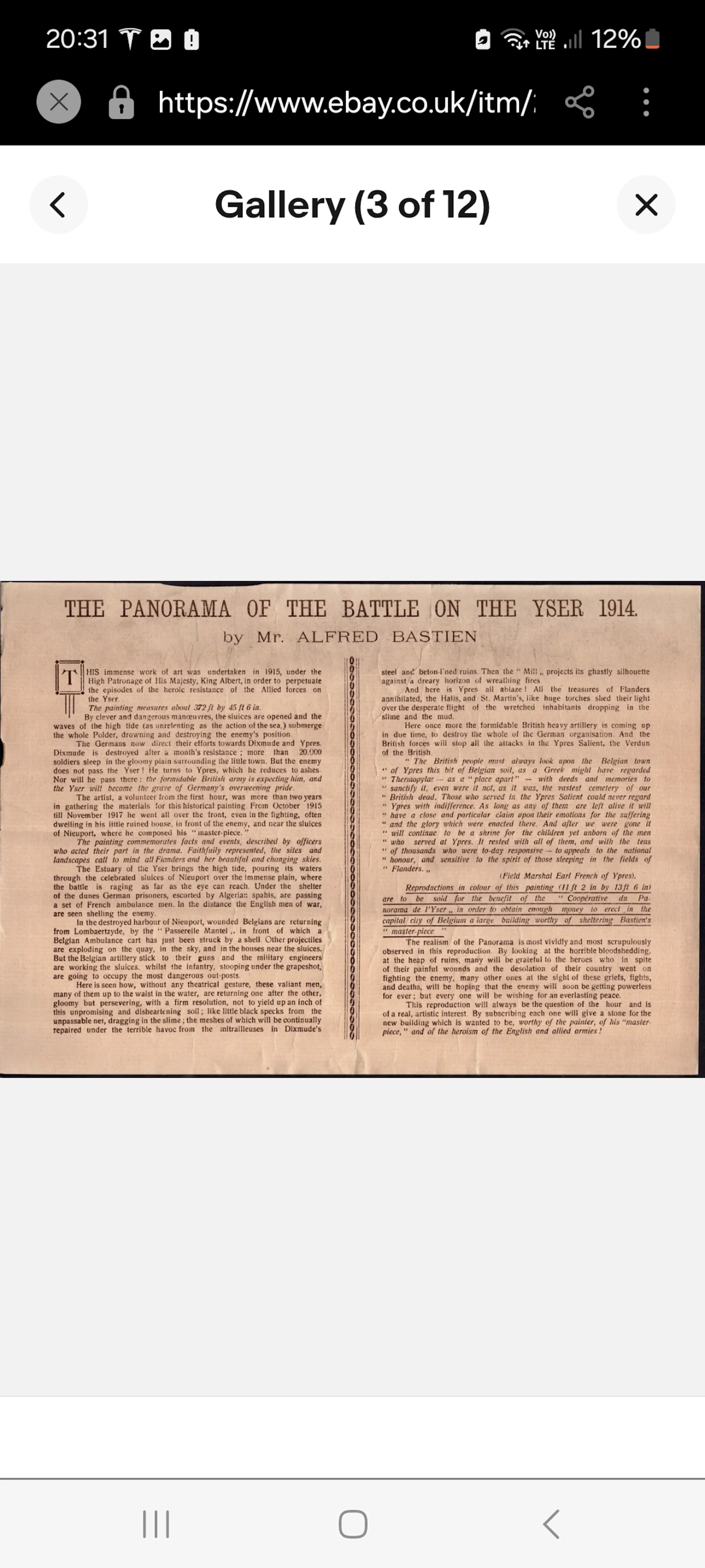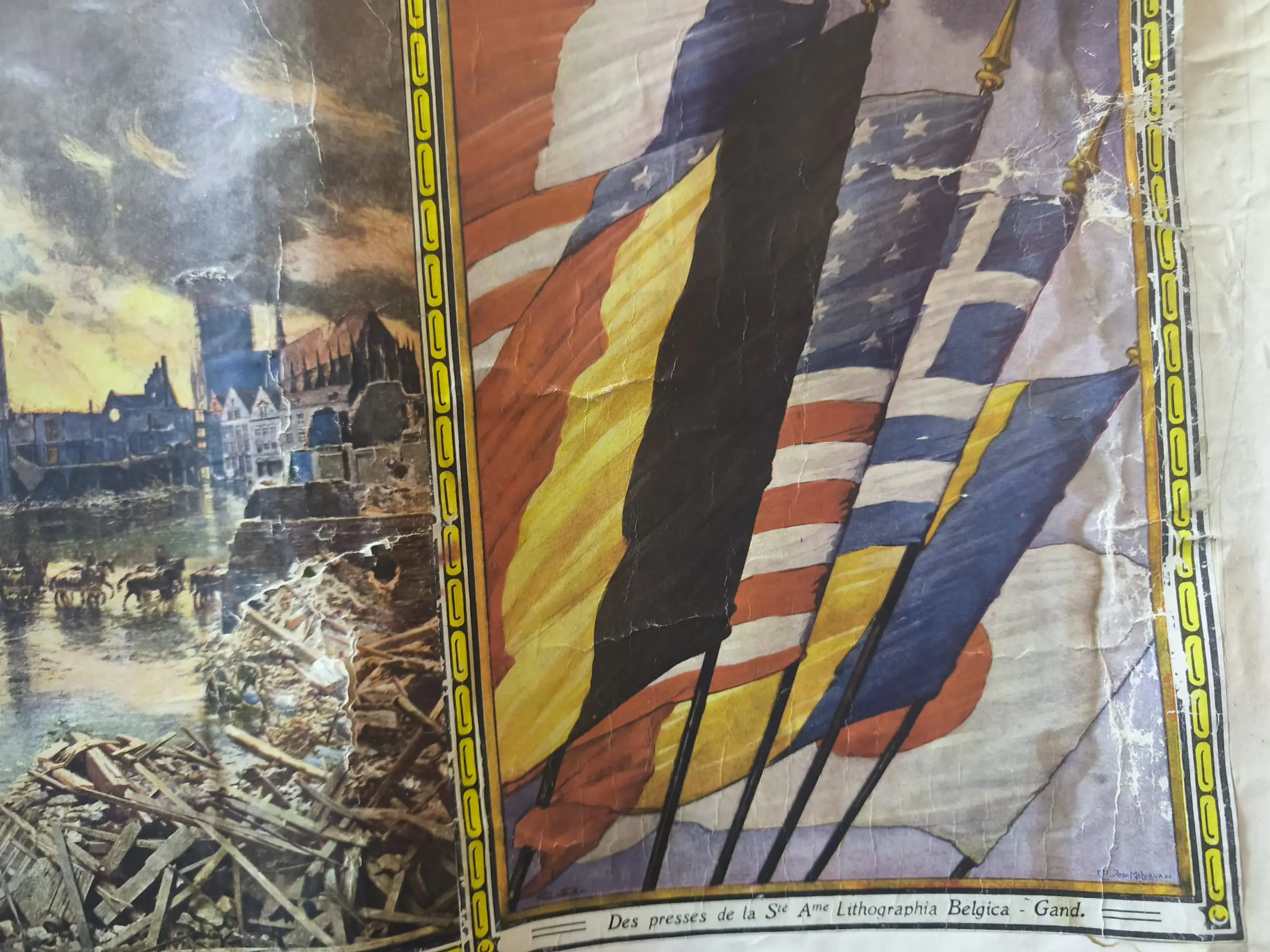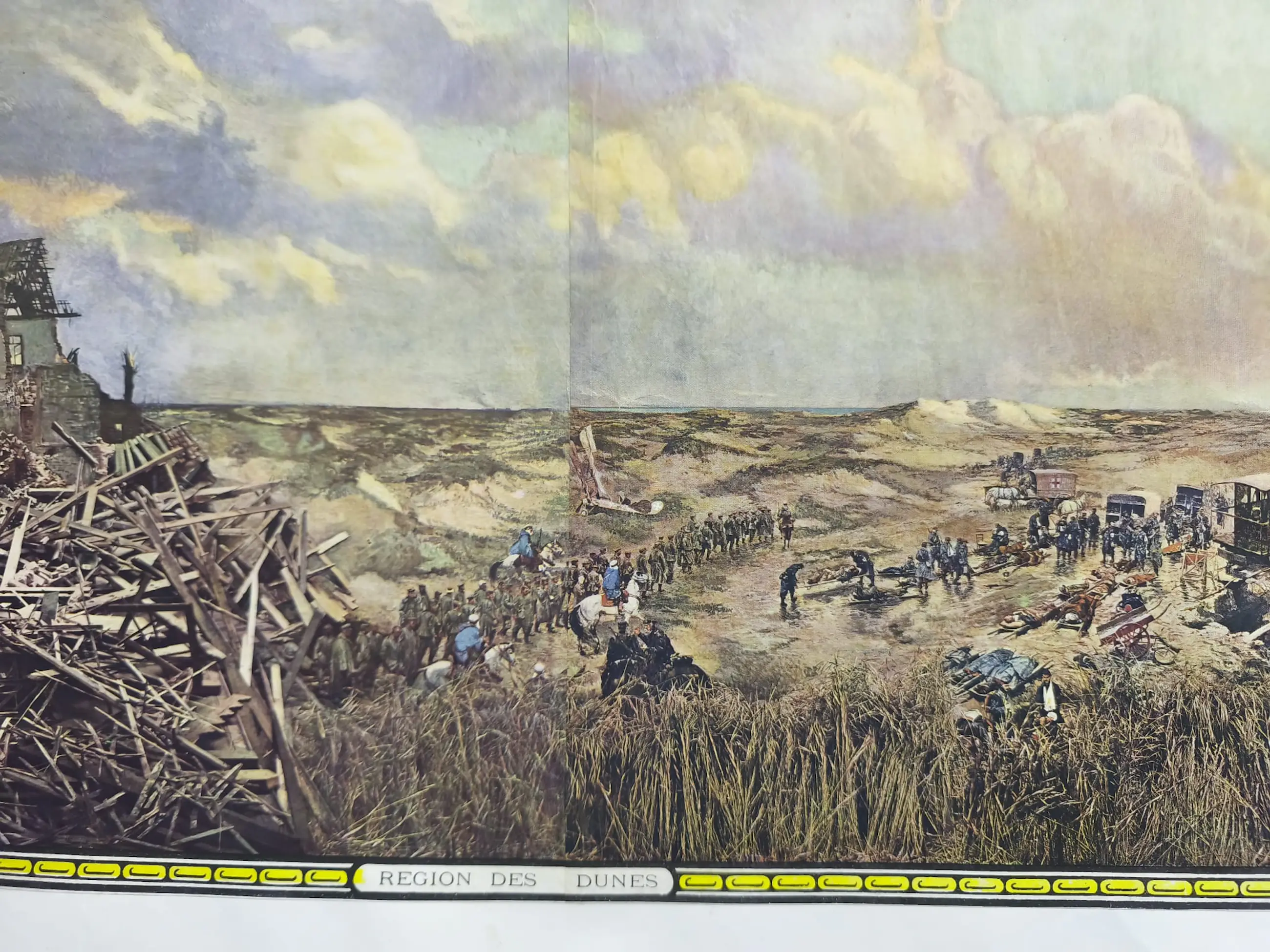 Panorama van de slag om de IJzer uit eerst wereldoorlog het toont de verwoesting en de geallieerde vlaggen tijdens de cruciale slag om de IJzer in oktober 1914 het originele panorama was 1800 vierkante metetdat is in 1921 onthult miniatuur panorama van de battle of the yser 1914 bij Alfred Bastien het is 3.5 meter lang en 45 cm breed en weegt340 gr is origineel heb het al 50 jaar in mijn bezit het is in redelijke staat ooit een geschenk van mijn grootvader aan de koper zorg ervoor heeft altijd droog en goede temperatuur gehad