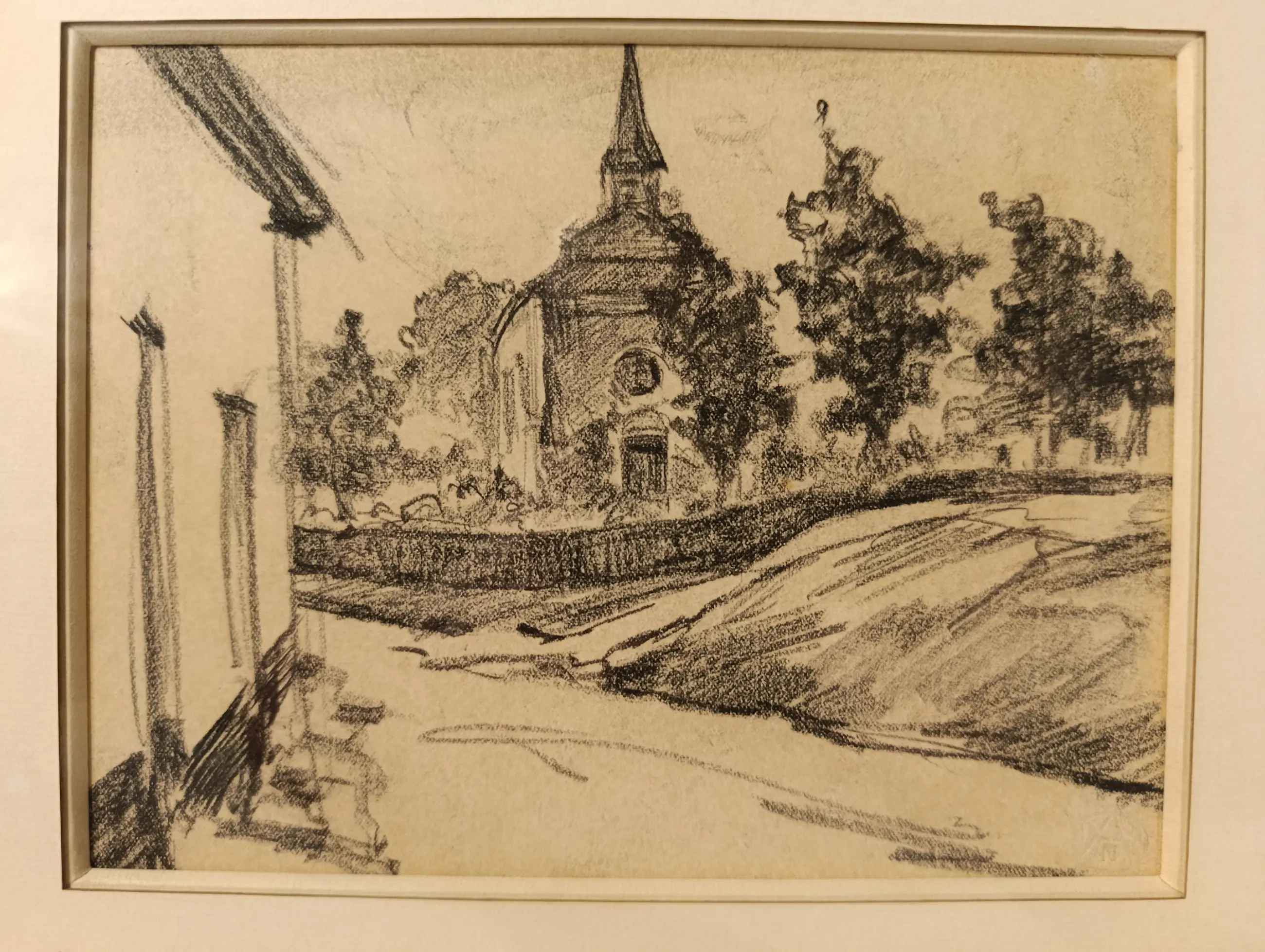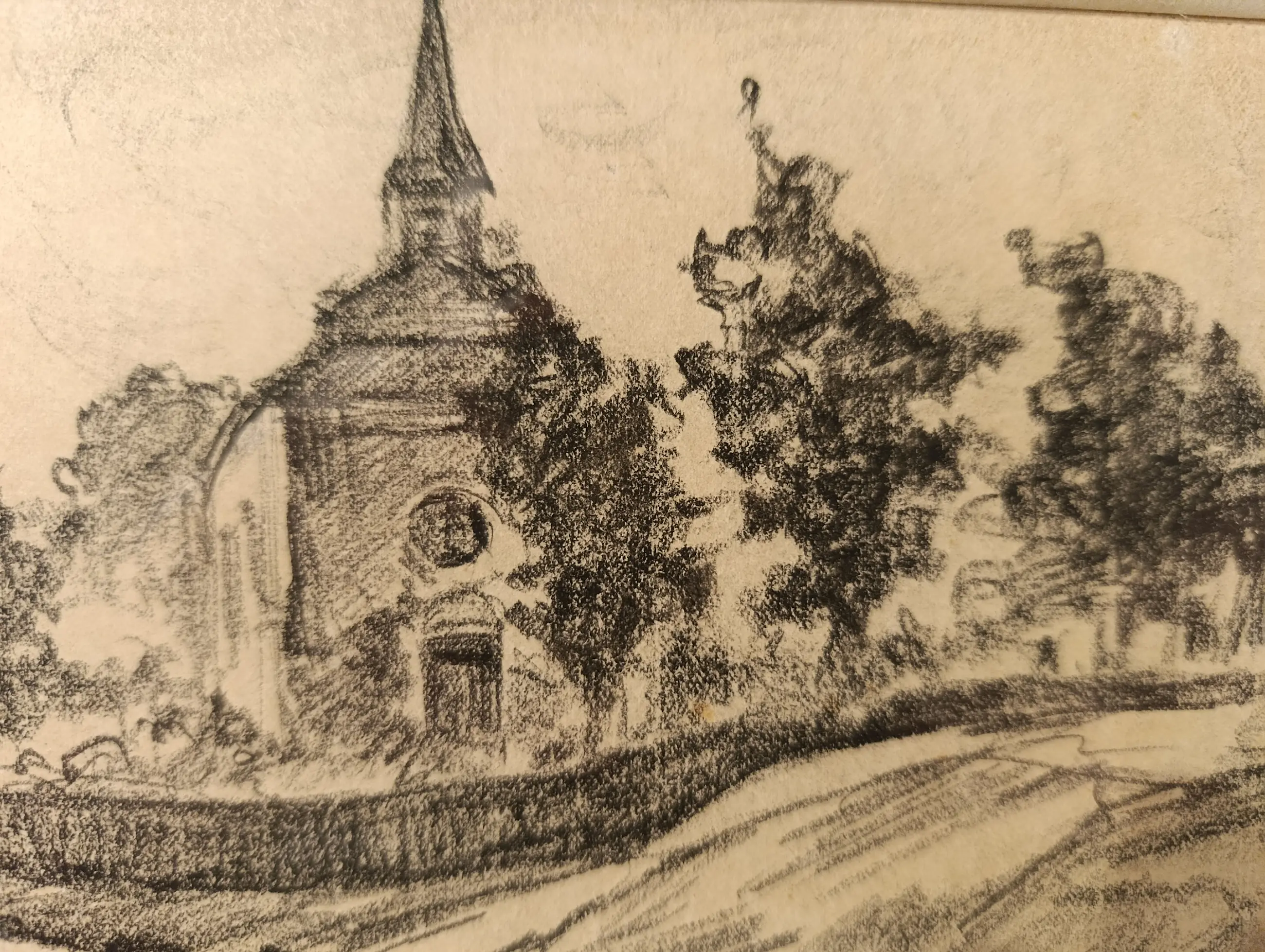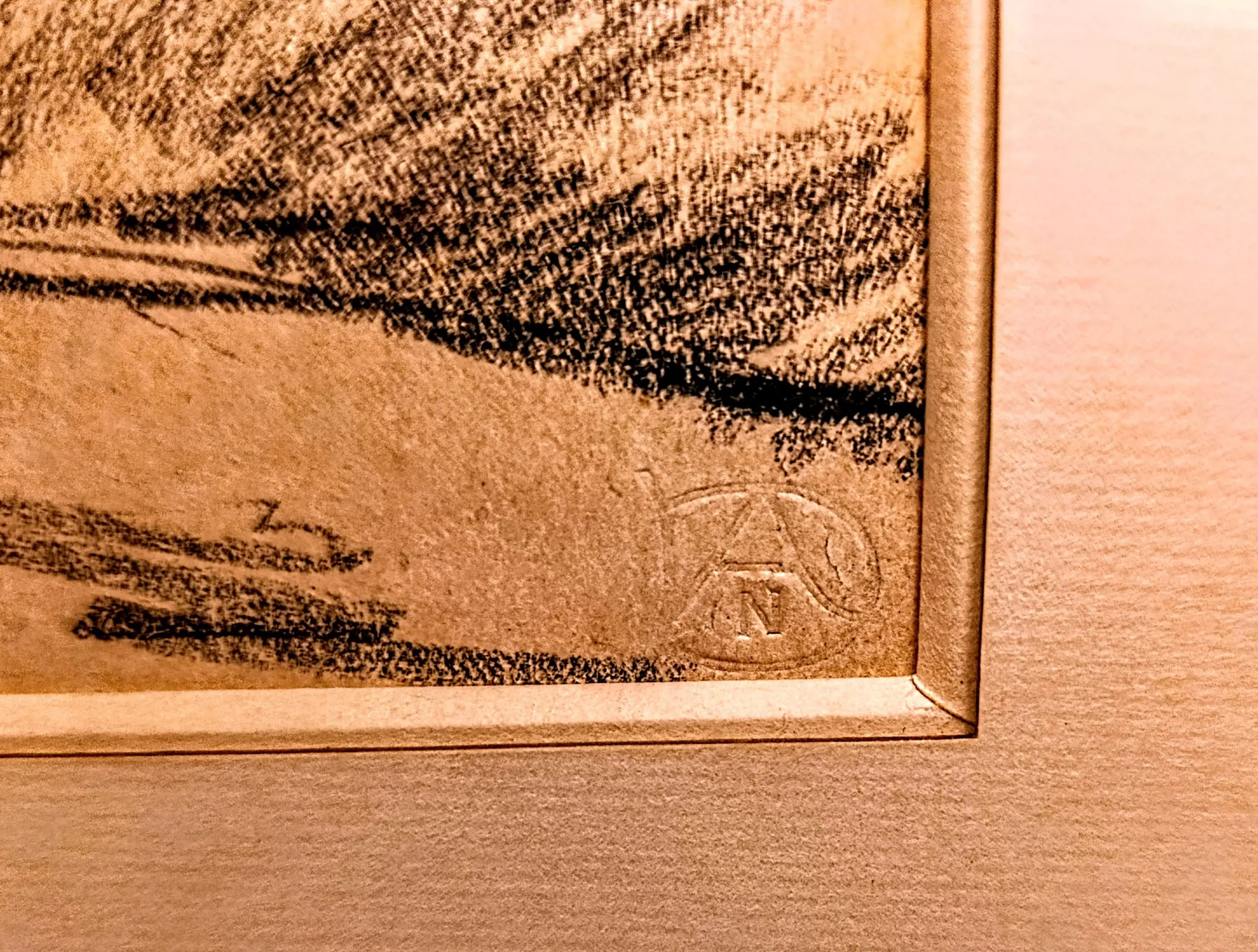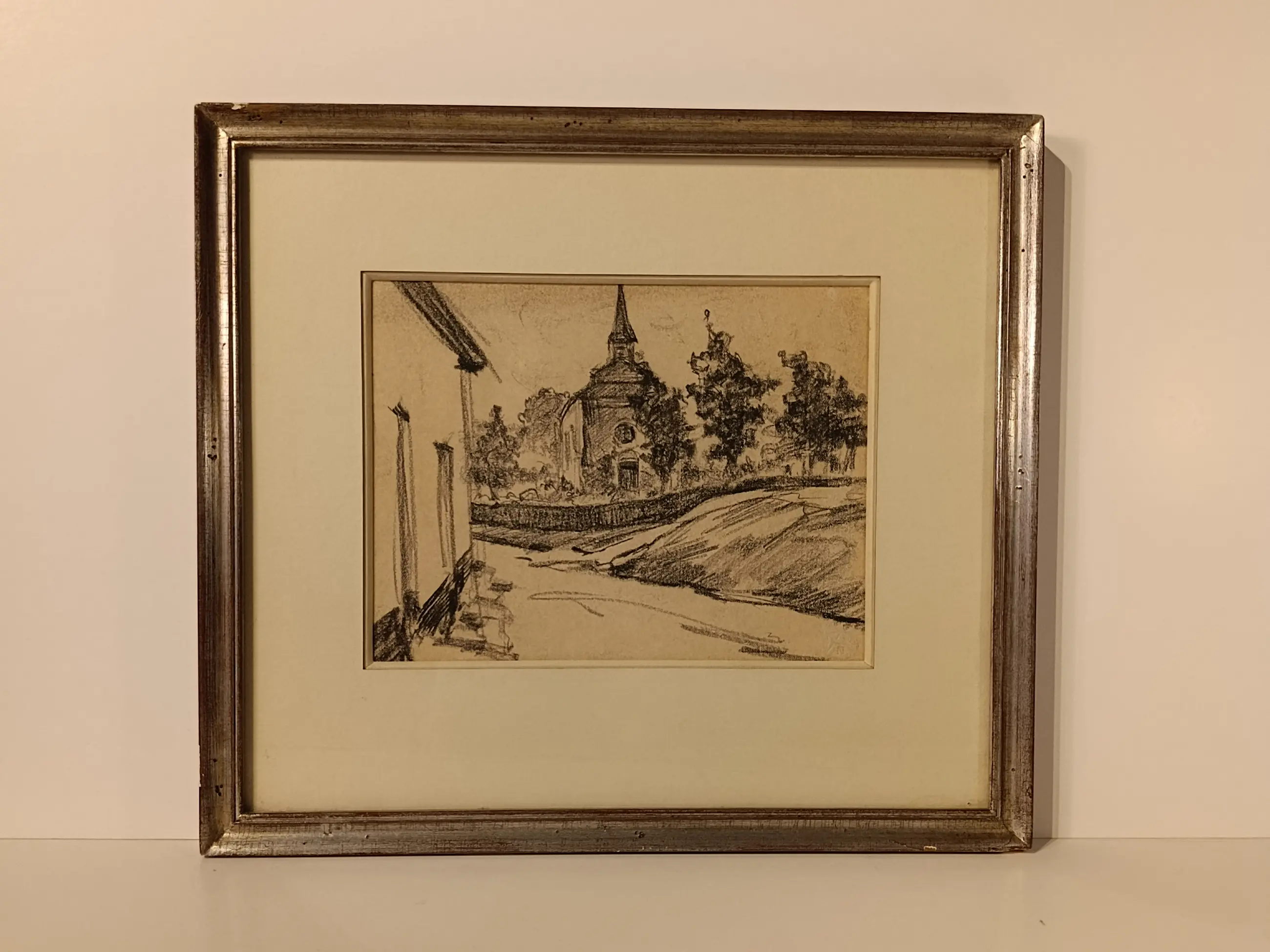 Schets, passe-partout en plexiglas in onberispelijke staat. Twee kleine deukjes aan de rand van de lijst.