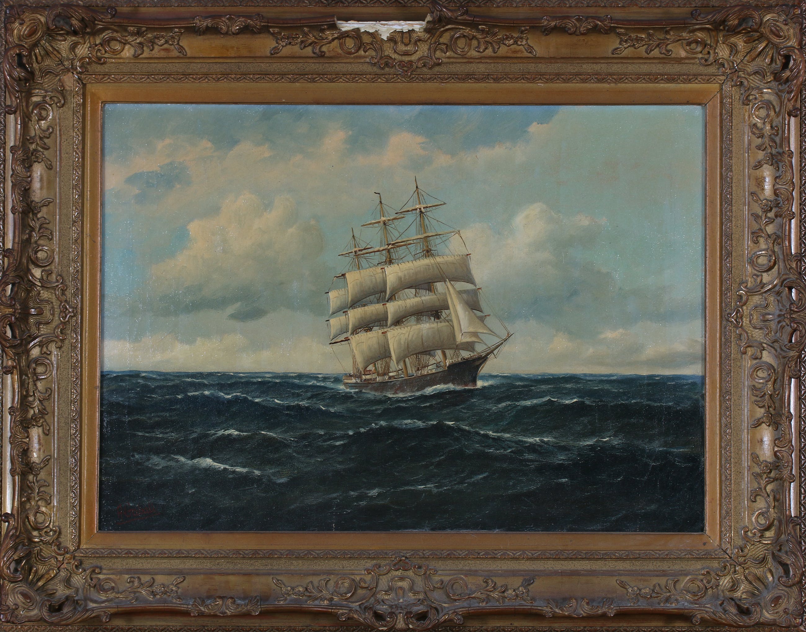 Fantastisch schilderij uitbeeldend een woelige zee met hoge golven. Mooi werk van deze van origine Duitse schilder die in Amerika faam behaalde door zijn zeegezichten.