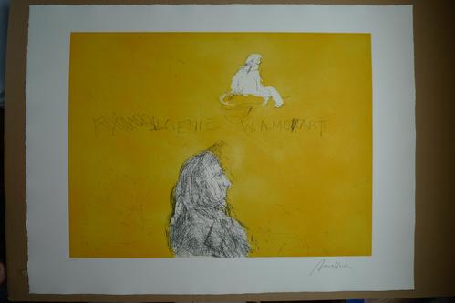 "Wunderkind Mozart" Original-Farbradierung 2004 Aus der Kunstmappe "Schmerztransformationen" von Thomapyrin, (eine der letzten gedruckten und verlegten Radierungen Hrdlickas vor seinem Tod), Auflage 20 (hier römisch nummerierte) Exemplare auf Bütten, handsigniert. Motivgröße 59 x 79 cm. Blattformat ca. 76 x 101 cm.