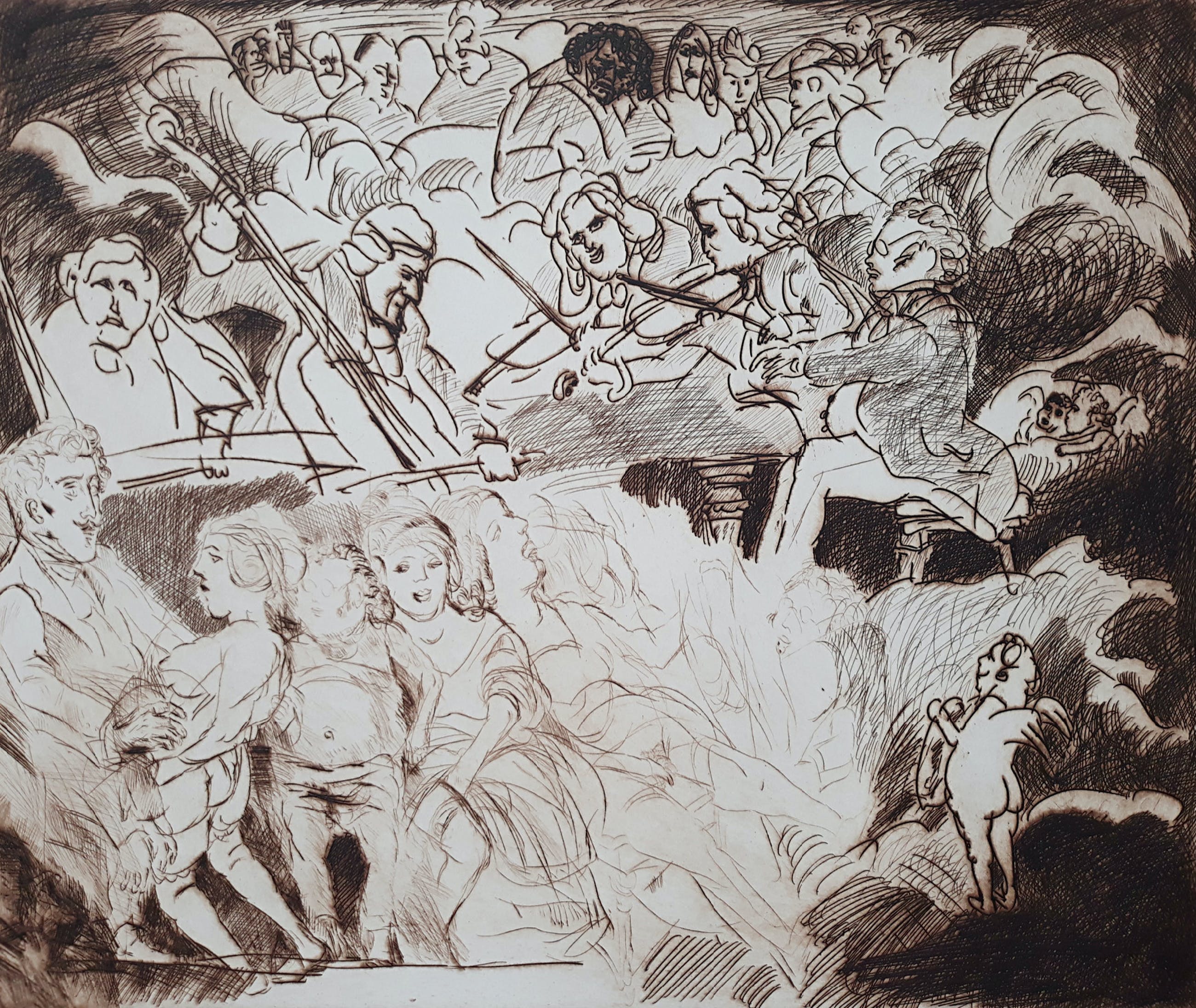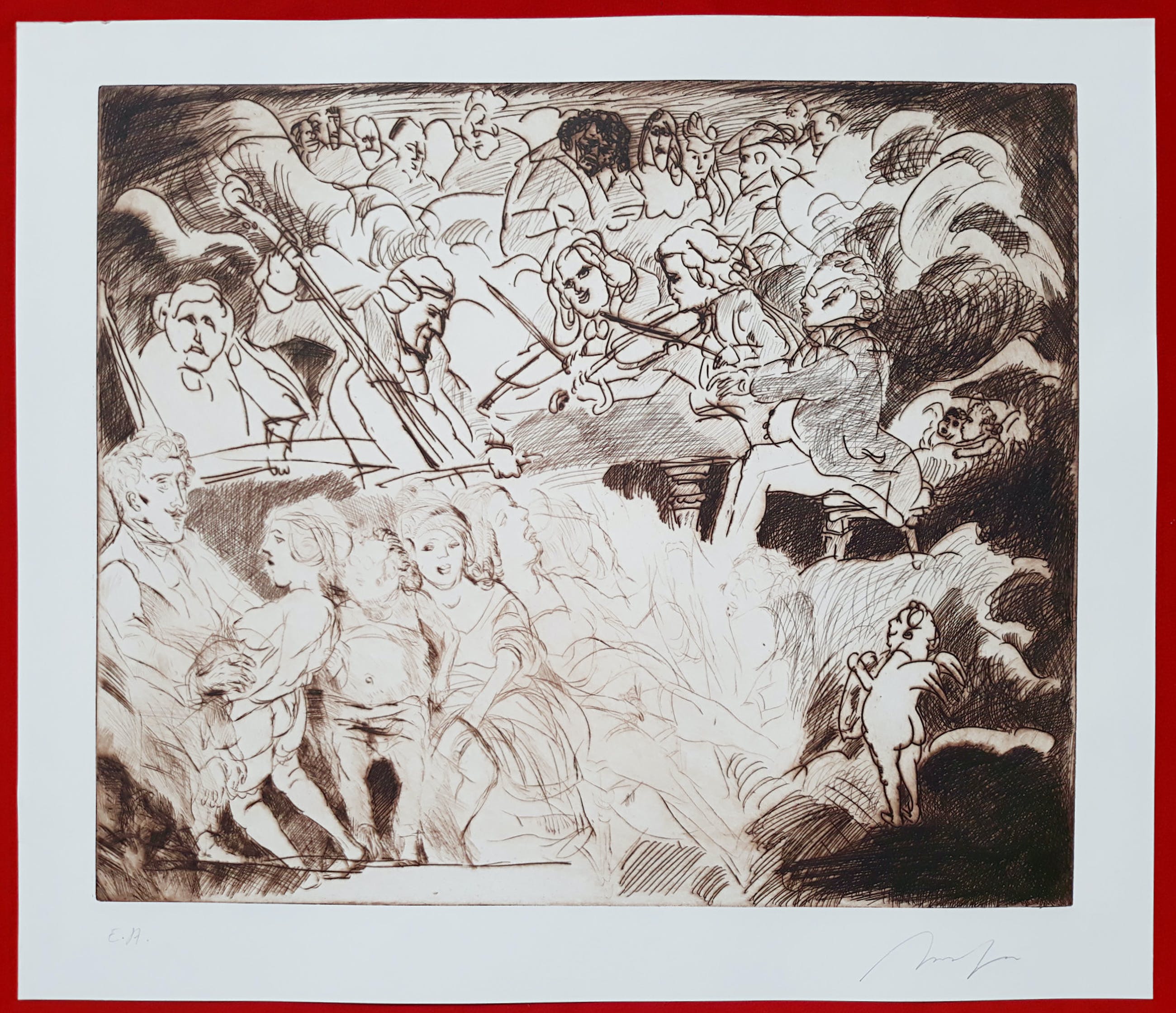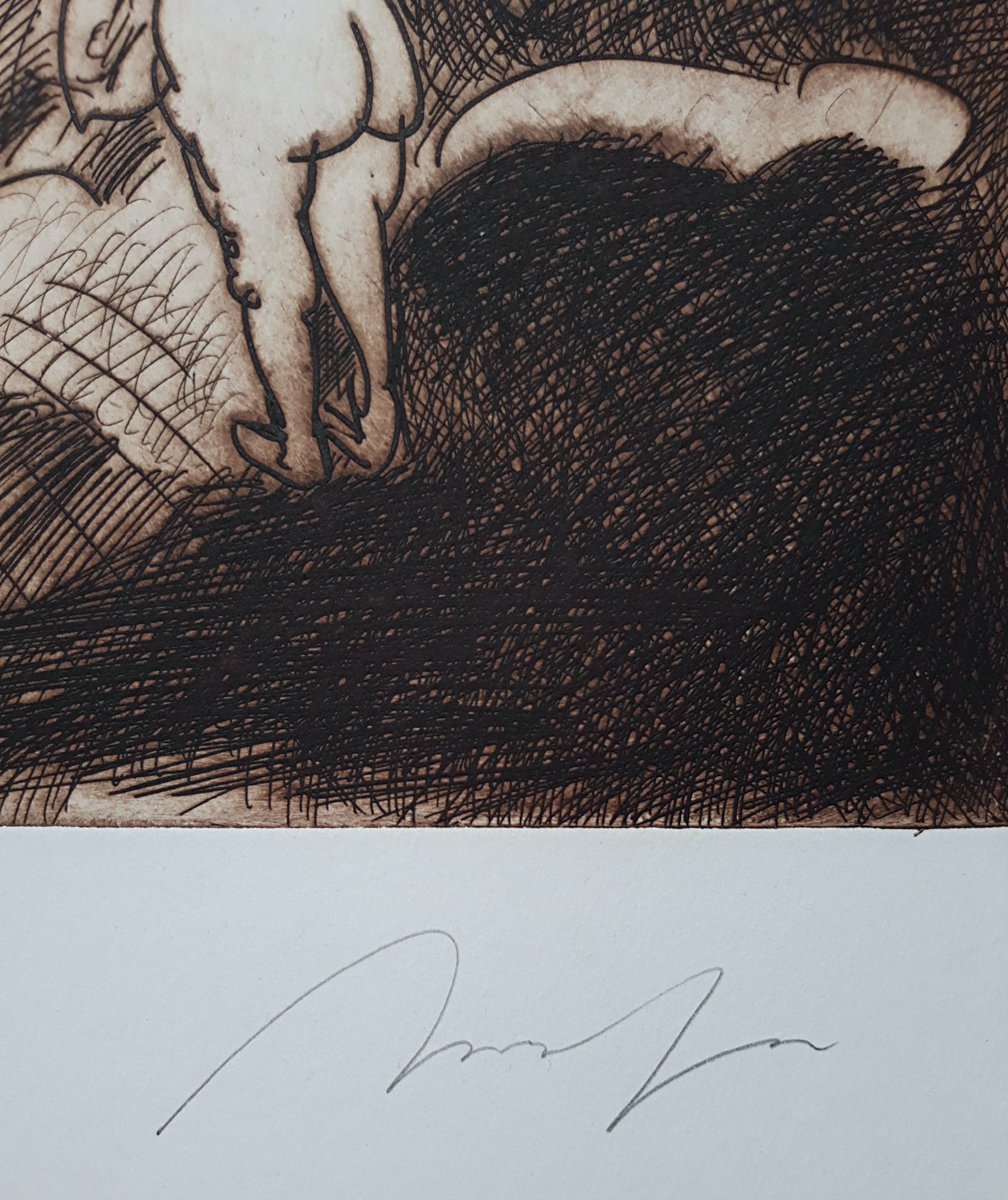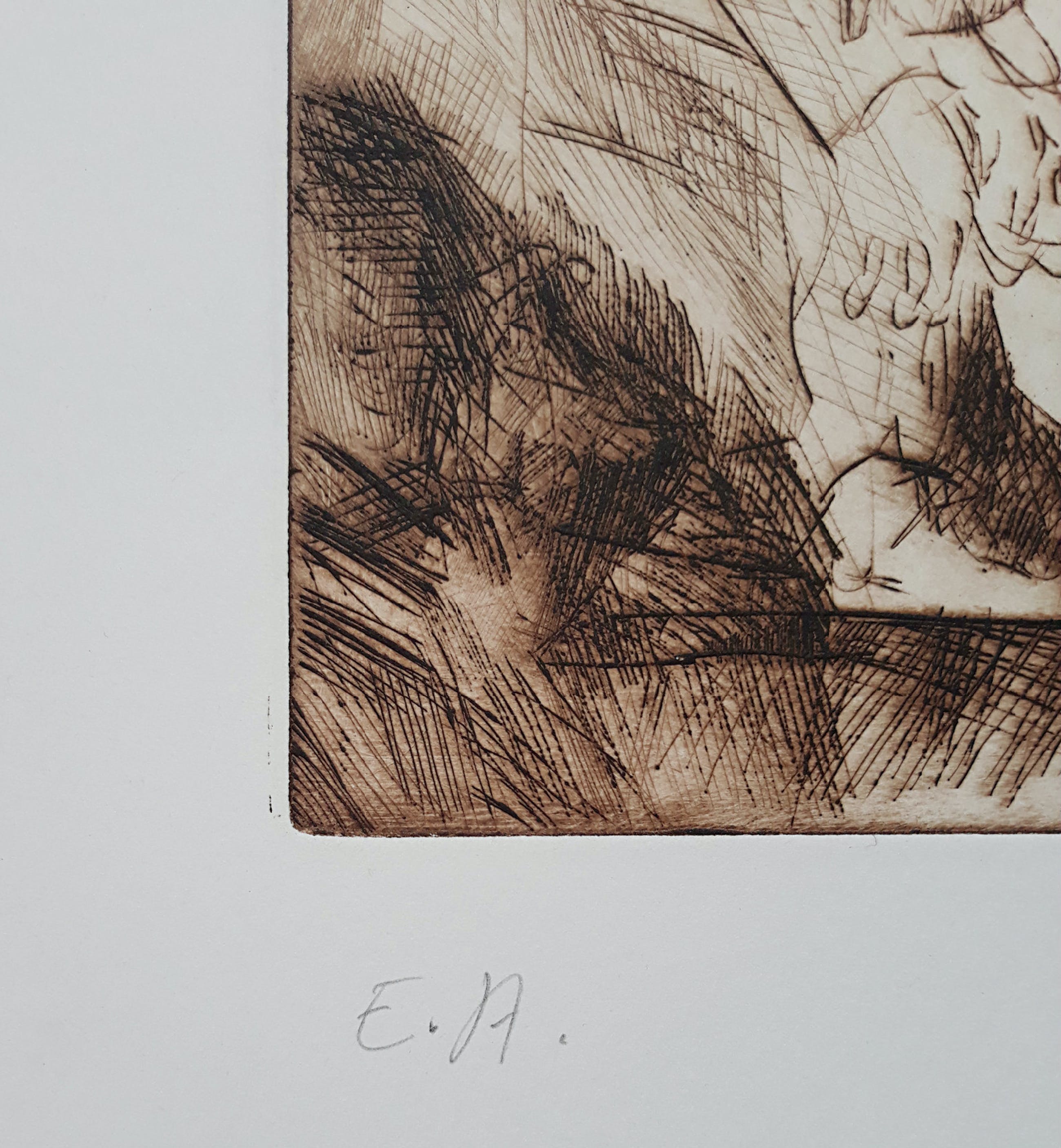 Karakteristiek werk uit 1982 van de bekende Oostenrijkse kunstenaar Alfred Hrdlicka. Ets op geschept papier, met potlood gesigneerd, een Épreuve d’Artiste exemplaar. In uitstekende conditie.
