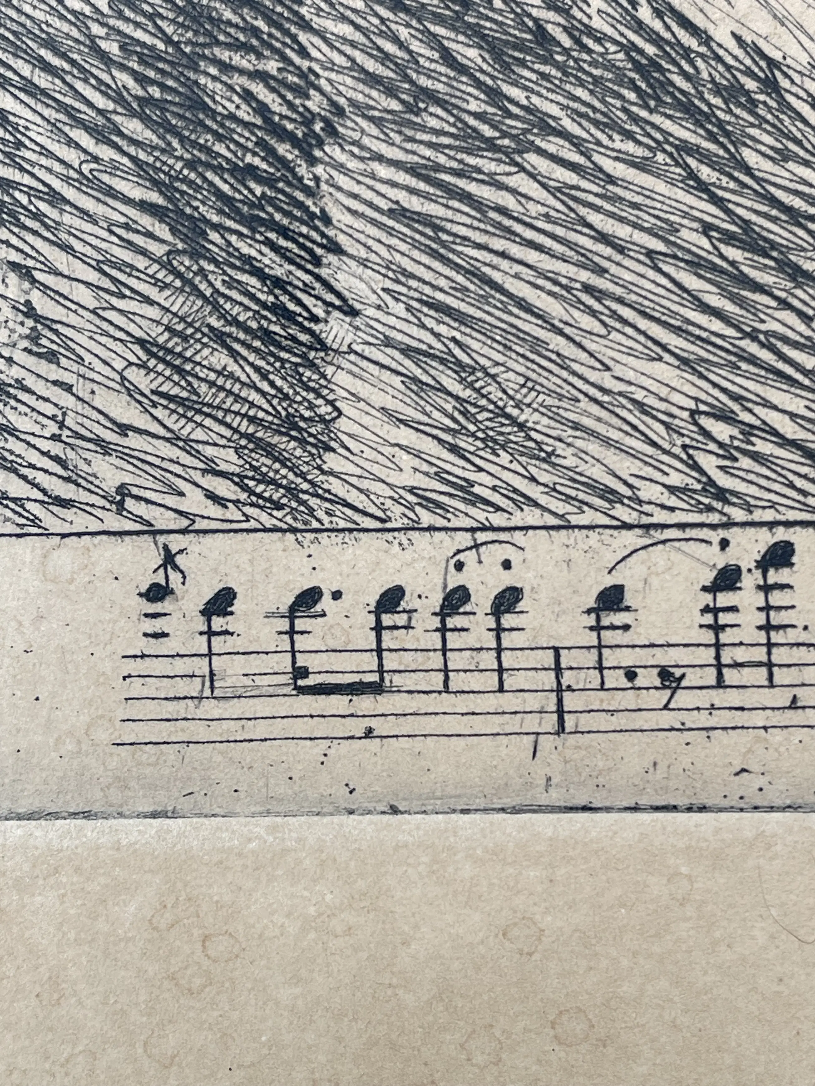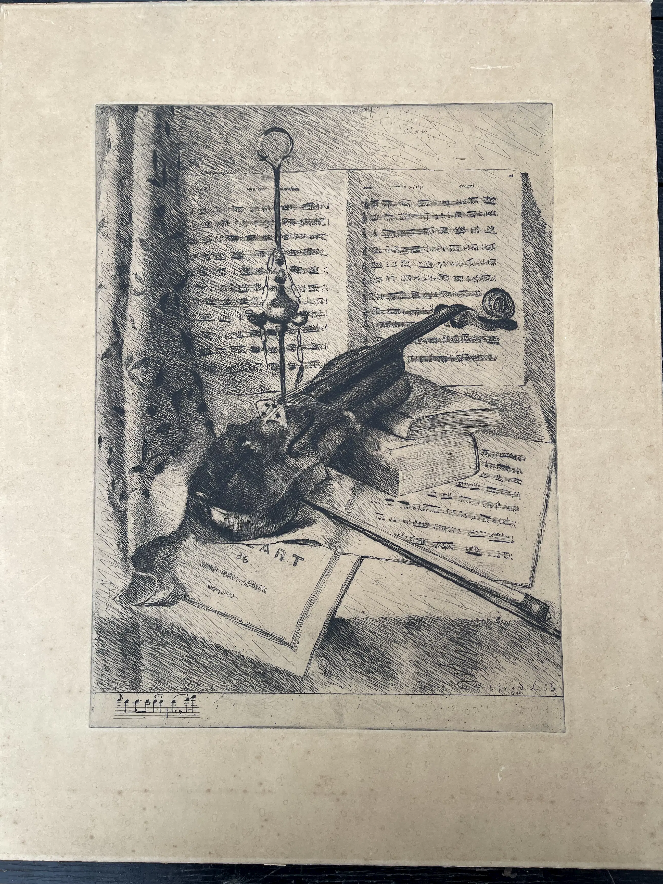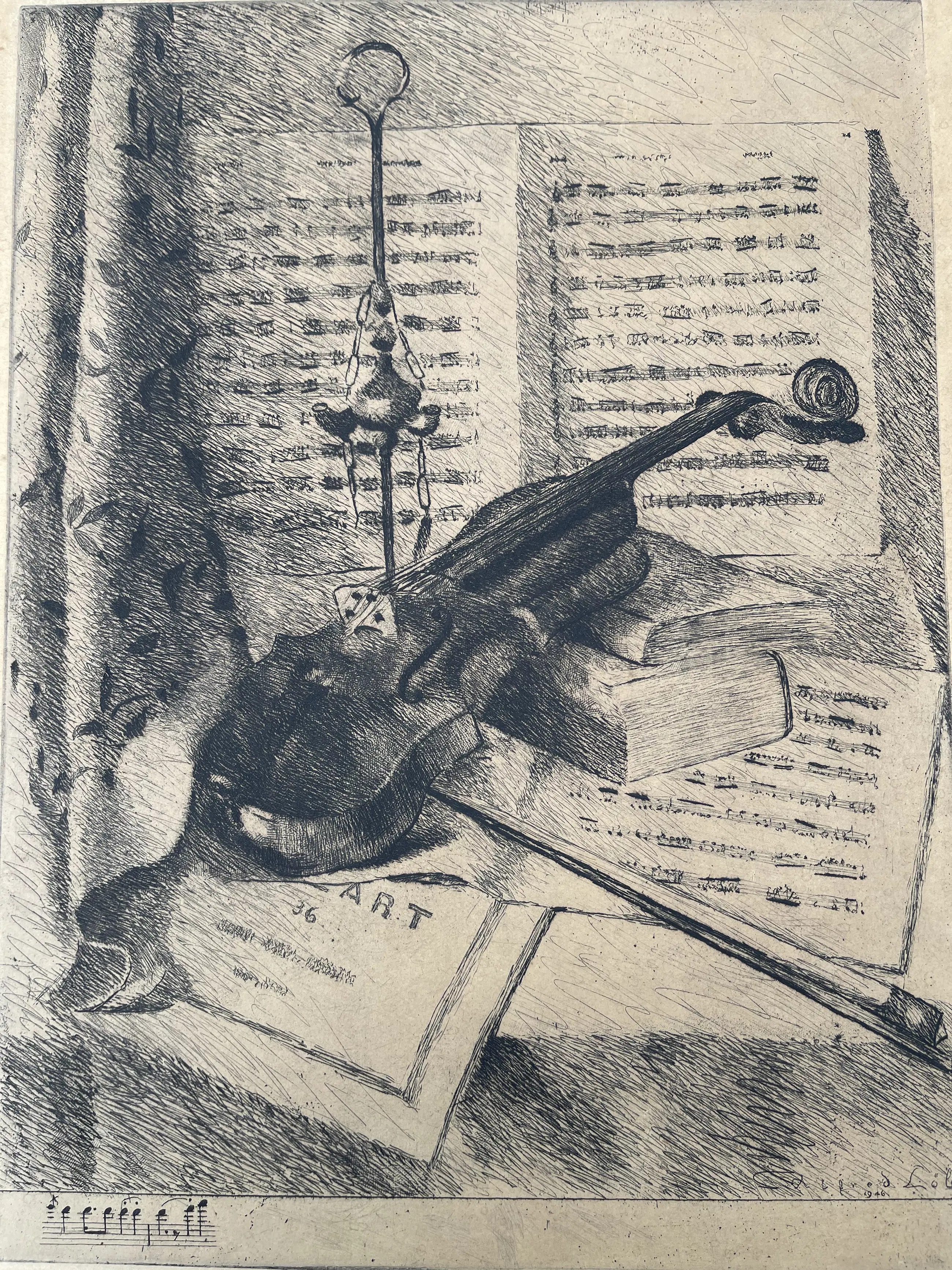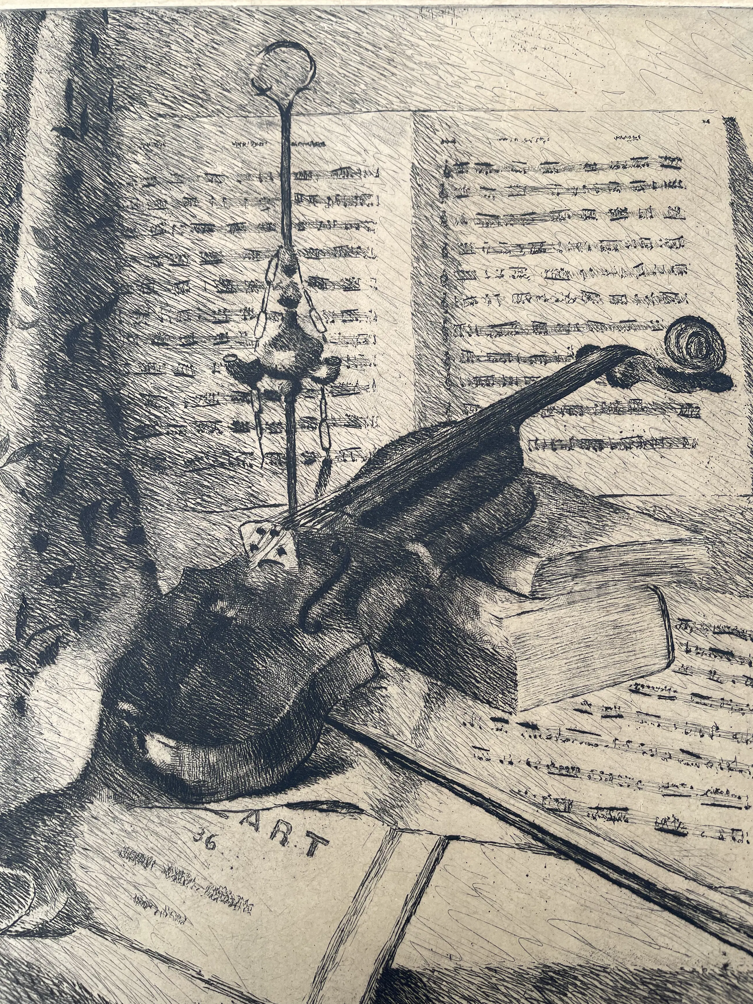 Prachtige voorstelling van een viool met bladmuziek Ik dacht zelf aan een origineel werk omdat de inkt sterk voelbaar is maar op internet staat dat het normaal is bij een ets Afmeting 39 x 50 papier is sterk vergeeld