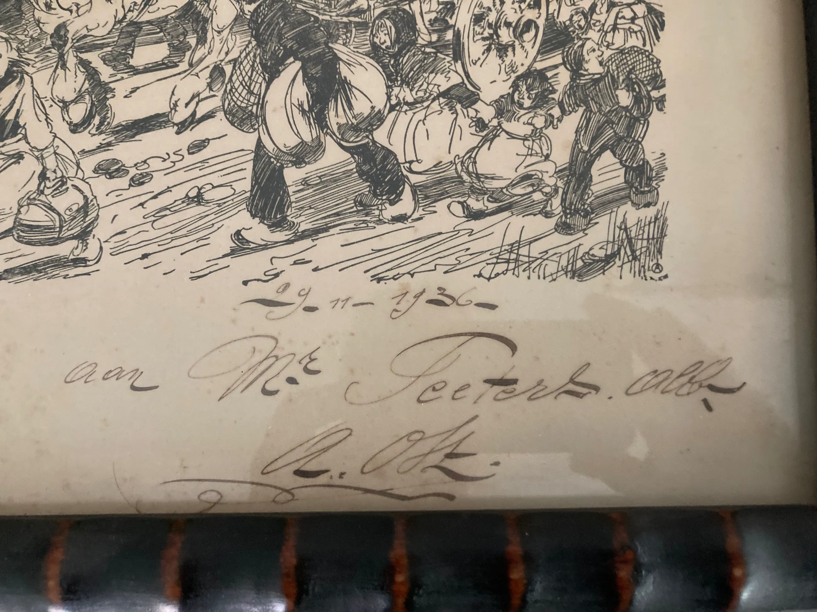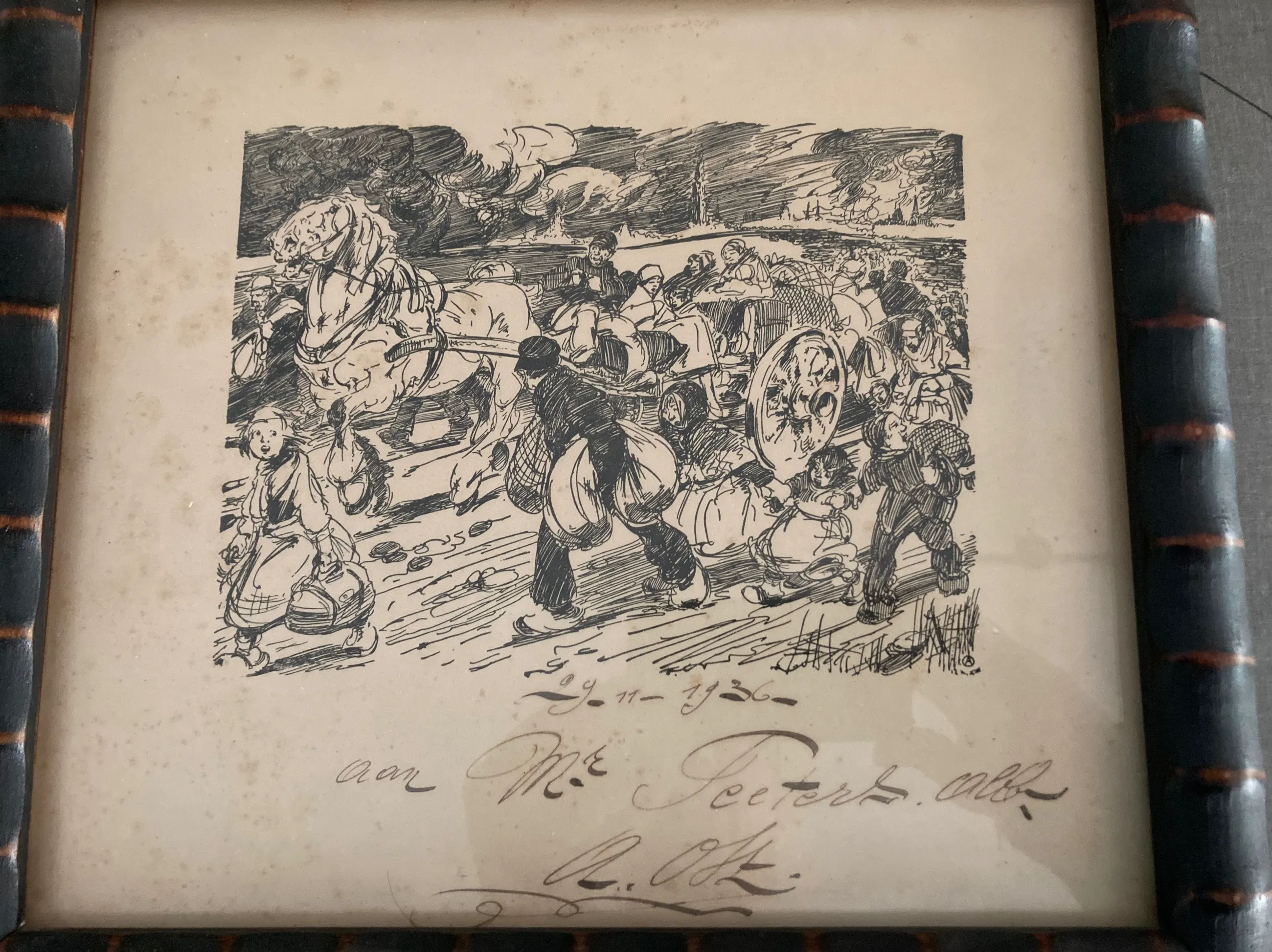 Papier is oud en vertoont kleine bruine vlekjes. Wel ingelijst. Enig werk in opdracht.