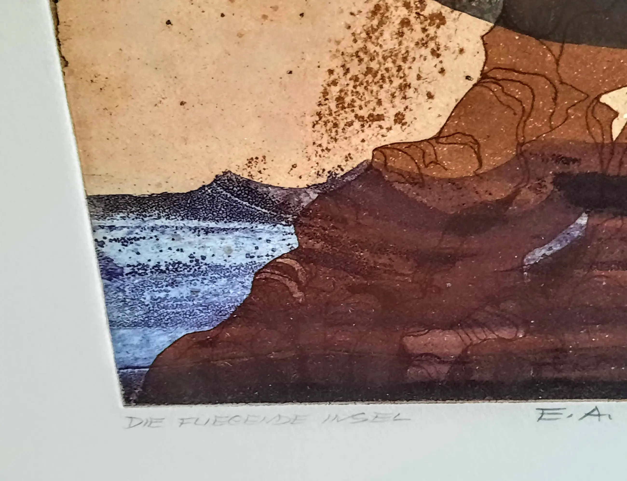 De ets toont een abstract, surrealistisch werk getiteld "Het Vliegende Eiland", heeft een bladformaat van 48,5 x 38,5 cm, een afbeelding van 32 x 24,5 cm, bevindt zich achter ontspiegelend glas en is ingelijst met een bronskleurige metalen lijst.