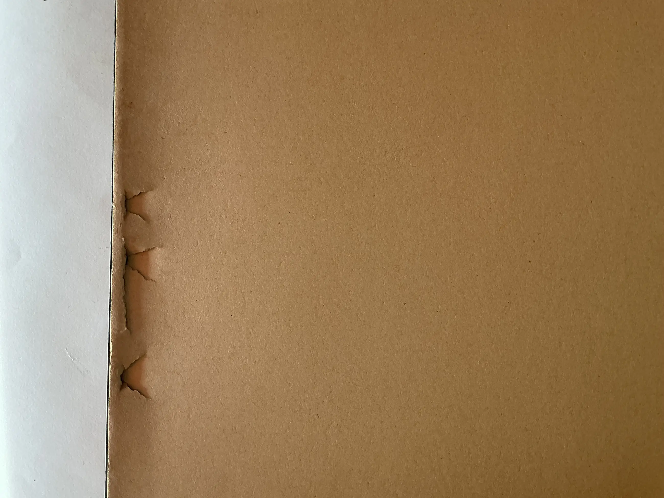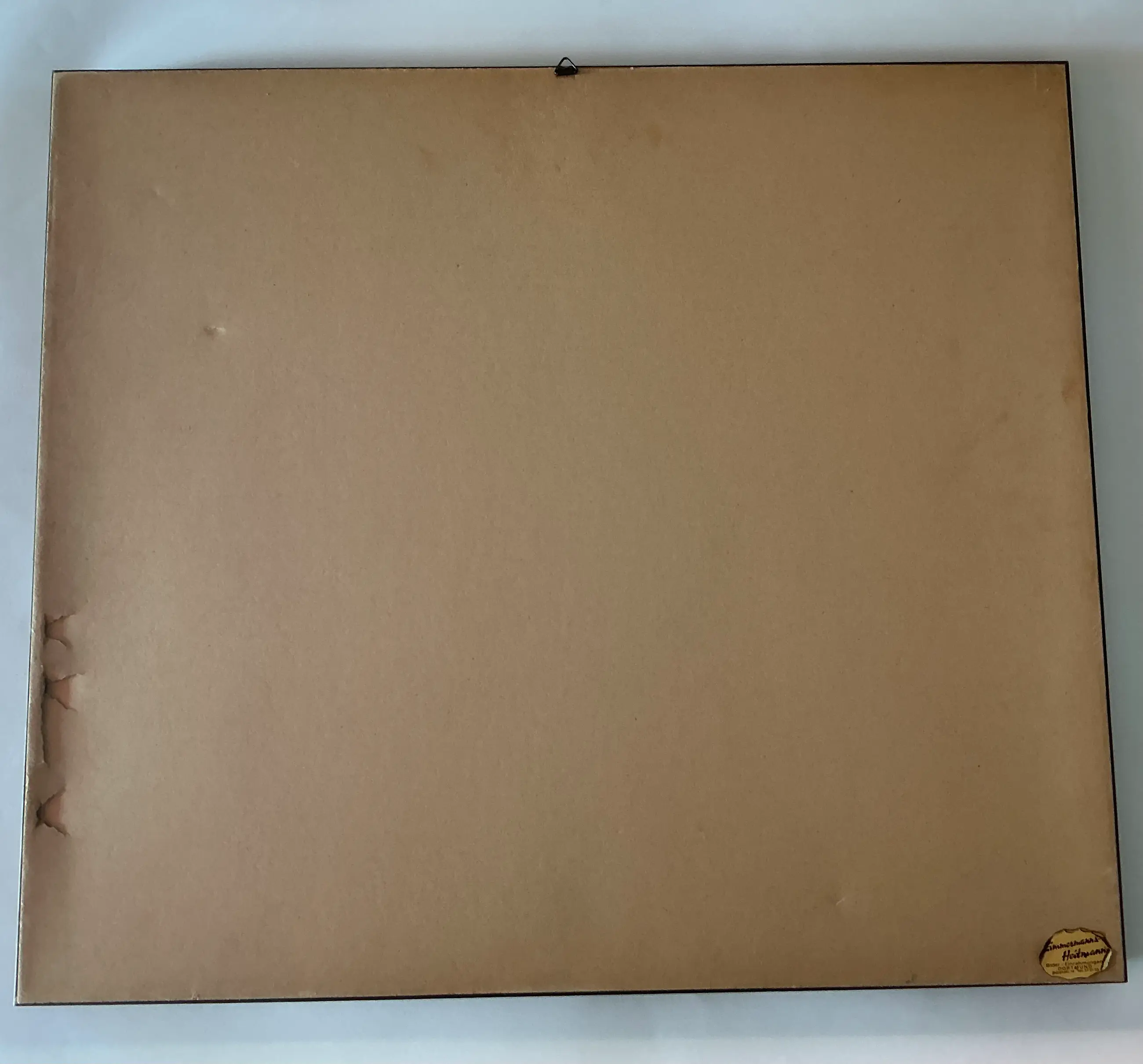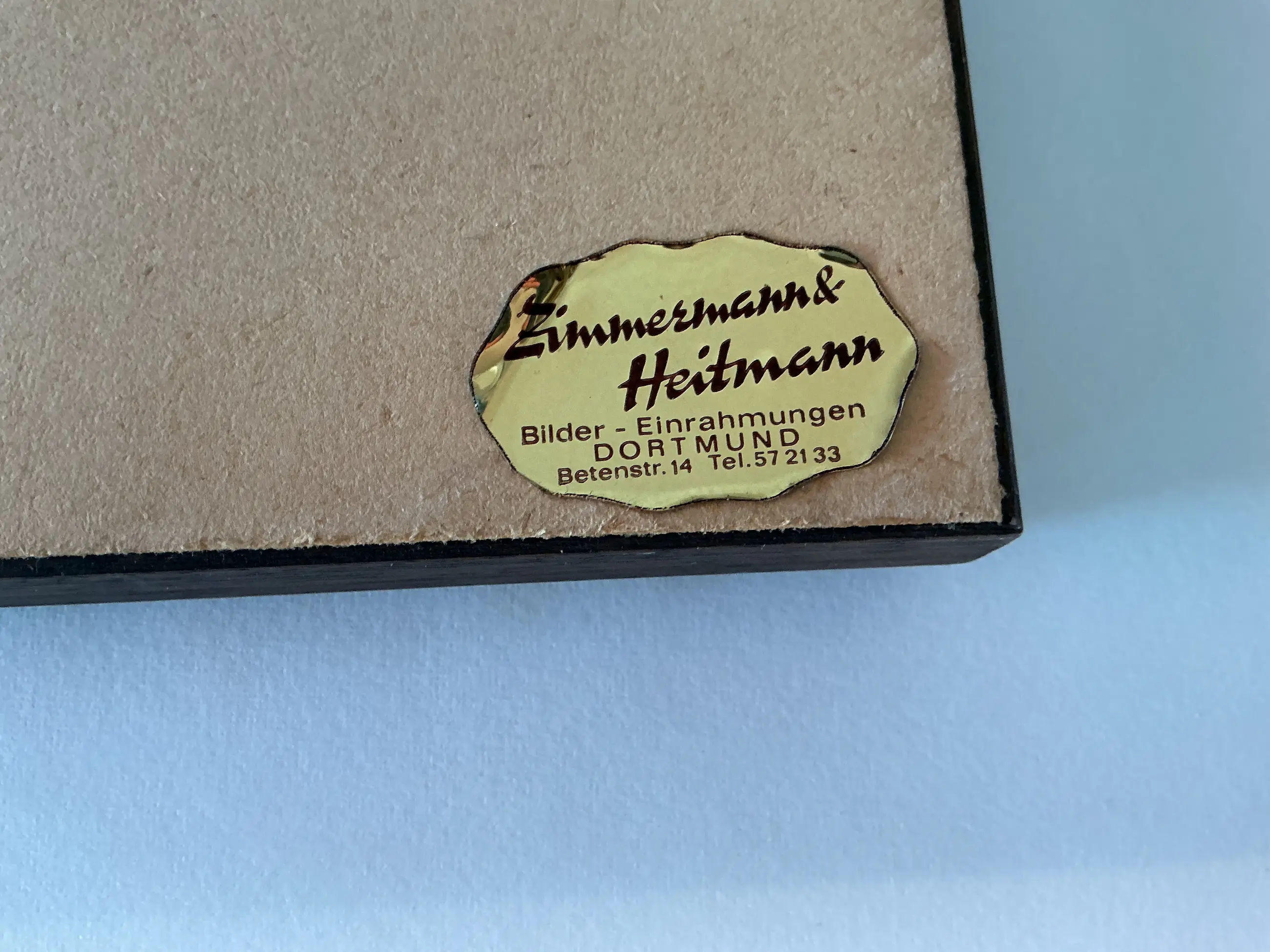 Het werk is professioneel ingelijst. Het achterkarton heeft enkele beschadigingen aan een rand en als je schudt rammelt er iets in de lijst.