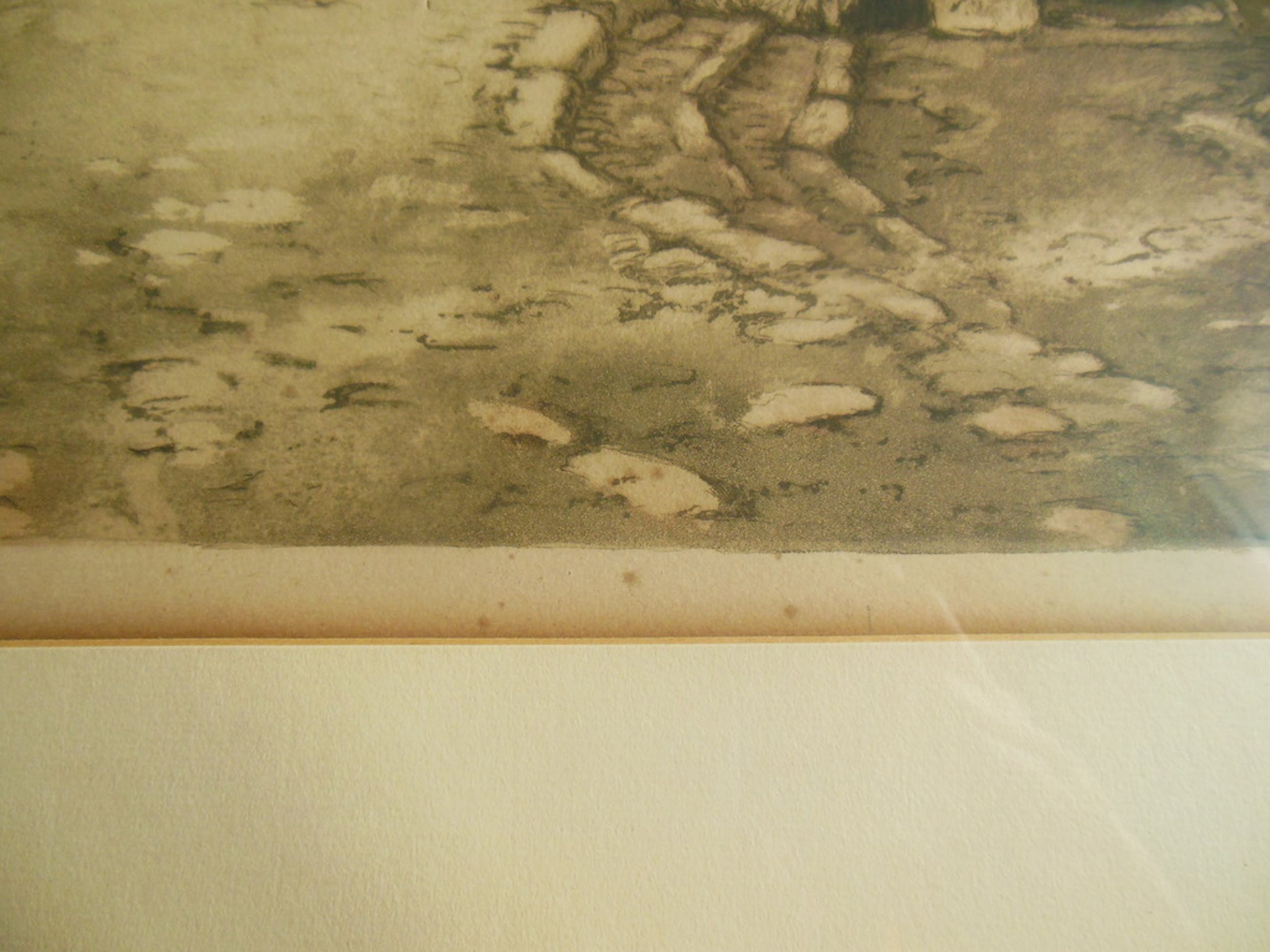 De ets is ingelijst met passe-partout achter glas in houten lijst.