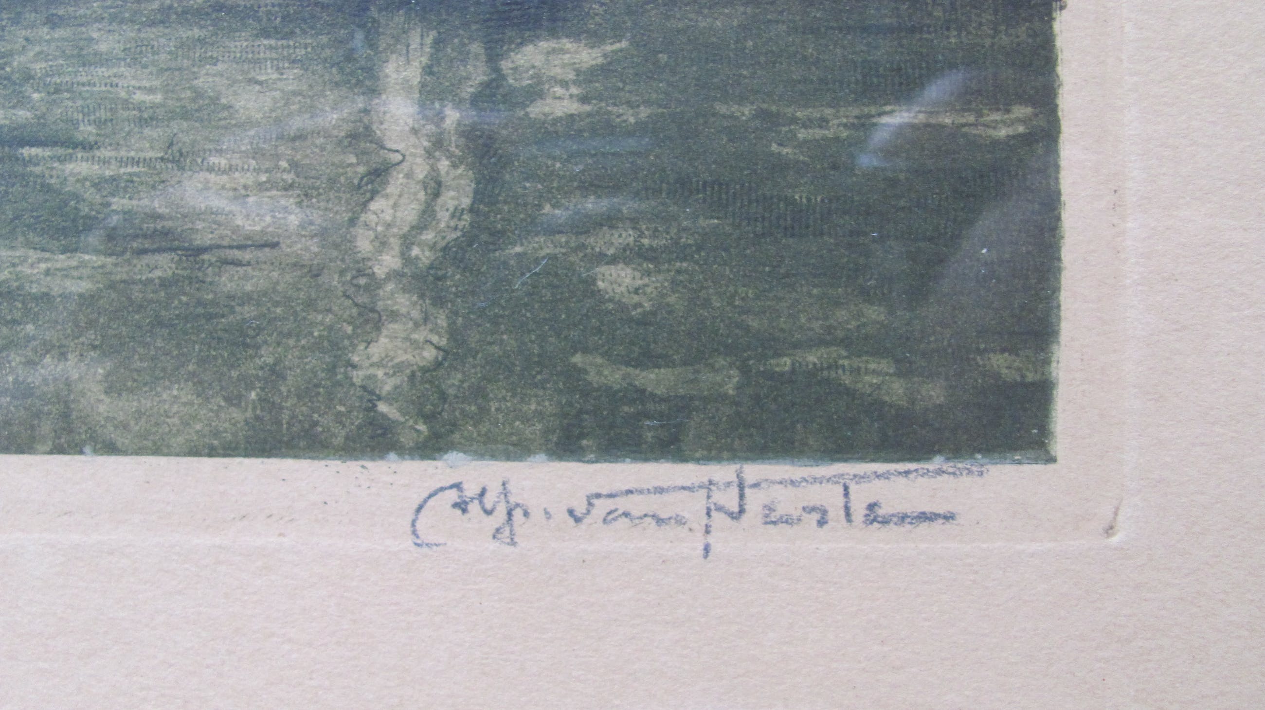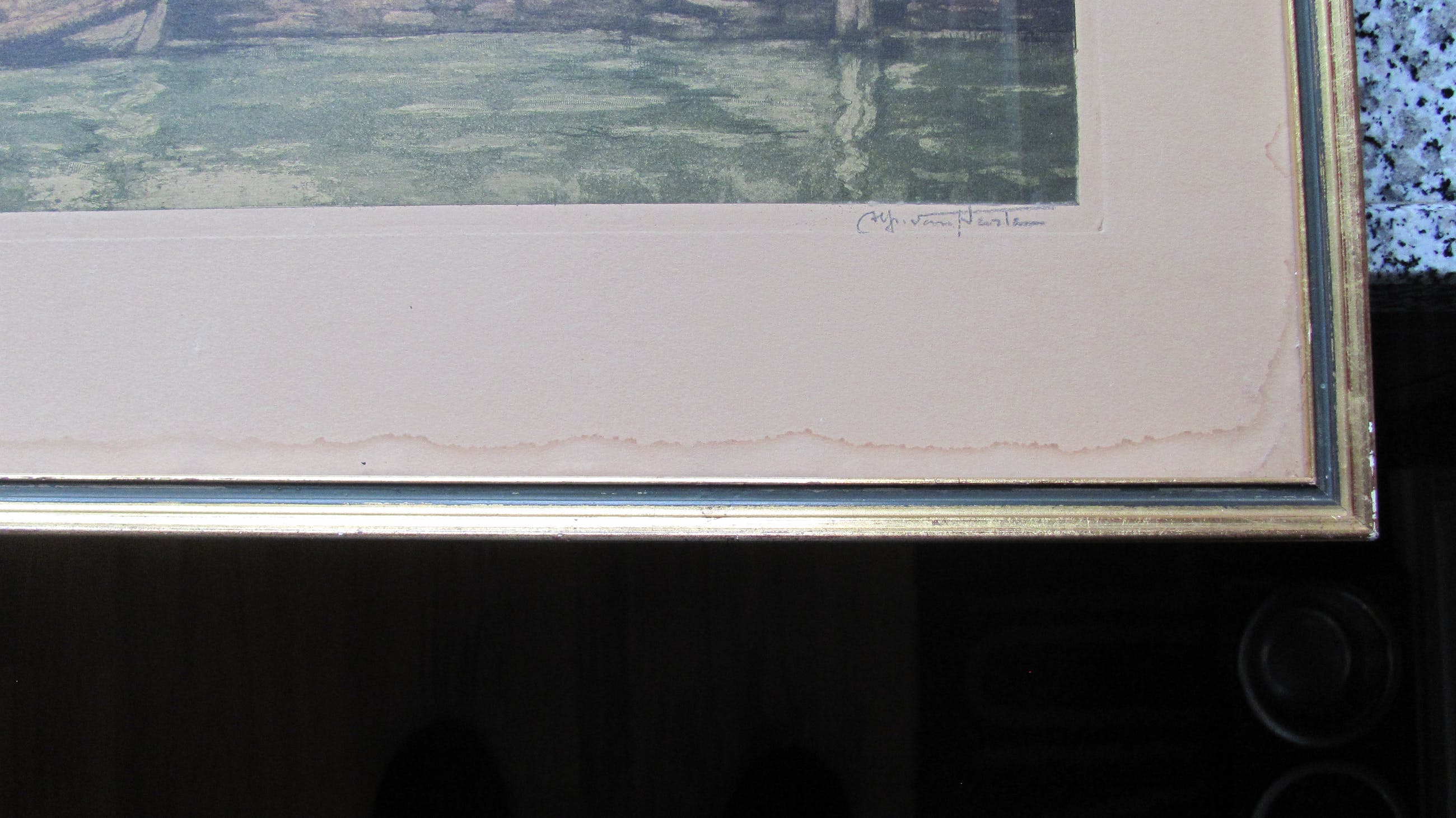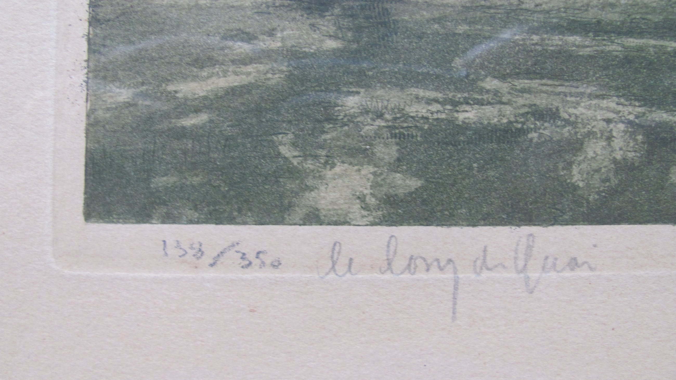 Mooie antieke kleurenets van Alfred van Neste. Potloodgesigneerd, genummerd en getiteld (Le long des Quai). De rand aan de onderkant (net boven de lijst) heeft vochtschade. De ets zelf is onbeschadigd. In de originele lijst van 48 cm x 46 cm.