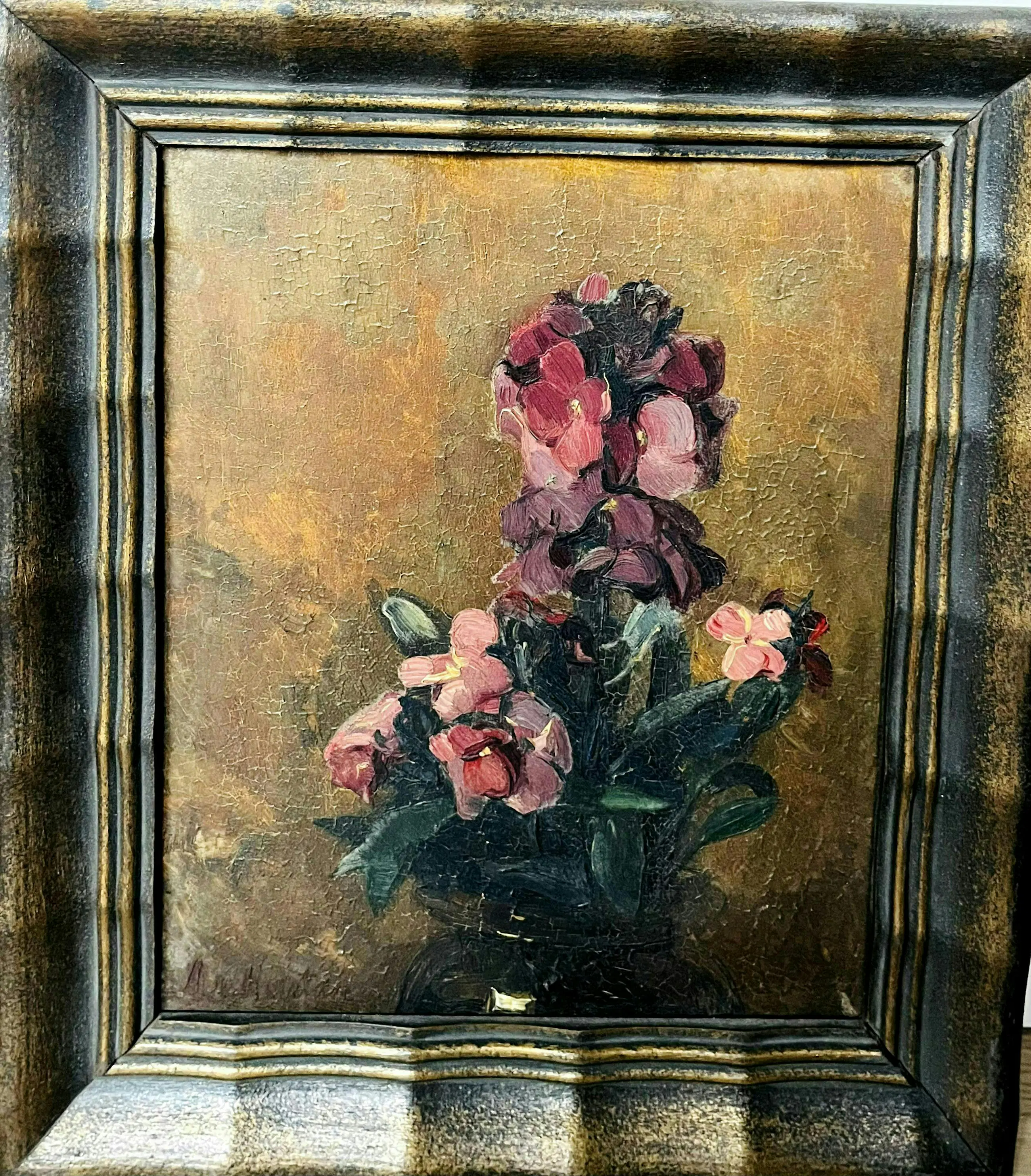 Stilleven geschilderd door Alida van Houten, de zus van de Groninger Ploeg schilder Gerrit van Houten. Achterop nog voorletter en achternaam duidelijk te lezen, net als adres: "Damsterdiep Buiten I Groningen".